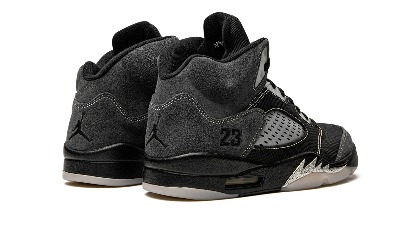 The Air Jordan 5 ��Anthracite�� is a recontextualized design of Michael Jordan��s fifth signature shoe that features reflective panels. This February 2021 release switches up the look of the all-time classic Jordan 5 silhouette by employing the reflective material typically found on the tongue to the clear netting on the bottom of the tongue and the mid-panel. Elsewhere, Jordan Brand places soft black mesh on the toe, mid-panel, and eyelets. Plush Anthracite or grey suede detailing is located on the collar, quarter panel, and toe cap. White contrast stitching outlines the aforementioned panels. The tonal embroidered ��23�� branding found on the heel is in reference to the original Player Exclusive version of the Air Jordan 5 worn by Michael Jordan with the Chicago Bulls in 1991. A black Jumpman logo appears on the black mesh tongue, on the back of the shoe, and on the insole. Silver shark tooth detailing highlights the black midsole to complete the look. Release date: February 6, 2021.