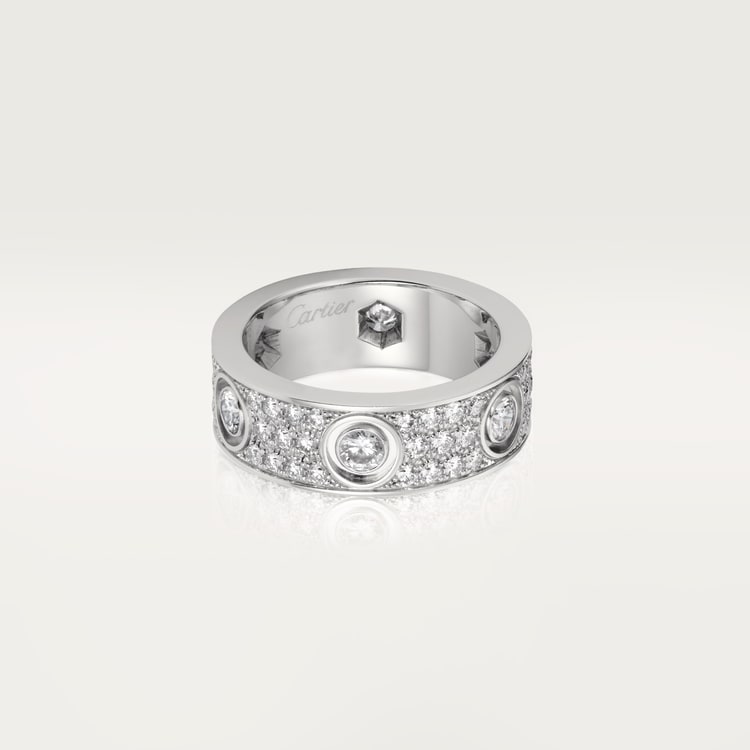LOVE ring, 18K white gold (750/1000), set with 72 brilliant-cut diamonds totaling 1.26 carats. Width: 6.5 mm (for size 52).