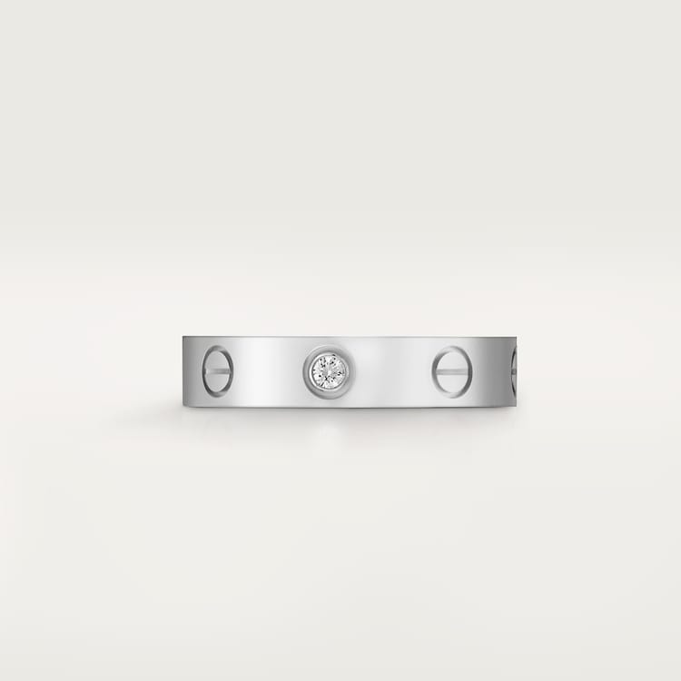 LOVE wedding band, 18K white gold (750/1000), set with 1 brilliant-cut diamond totaling 0.02 carats. Width: 4 mm (for size 52).