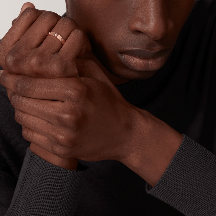 LOVE wedding band, 18K rose gold (750/1000), set with 8 brilliant-cut diamond totaling 0.19 carats. Width: 4 mm (for size 52).
