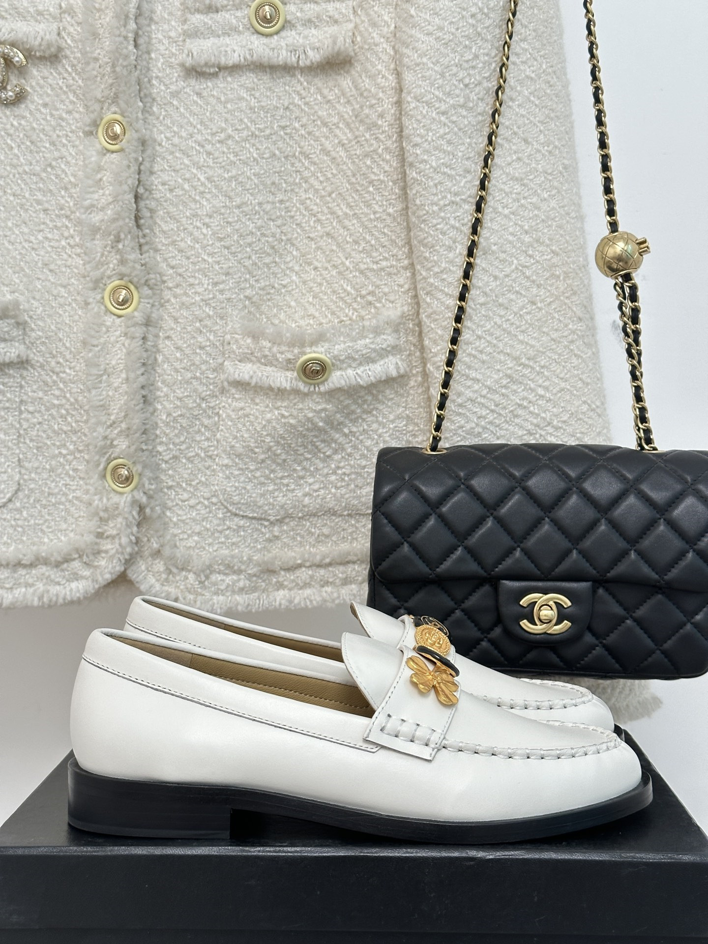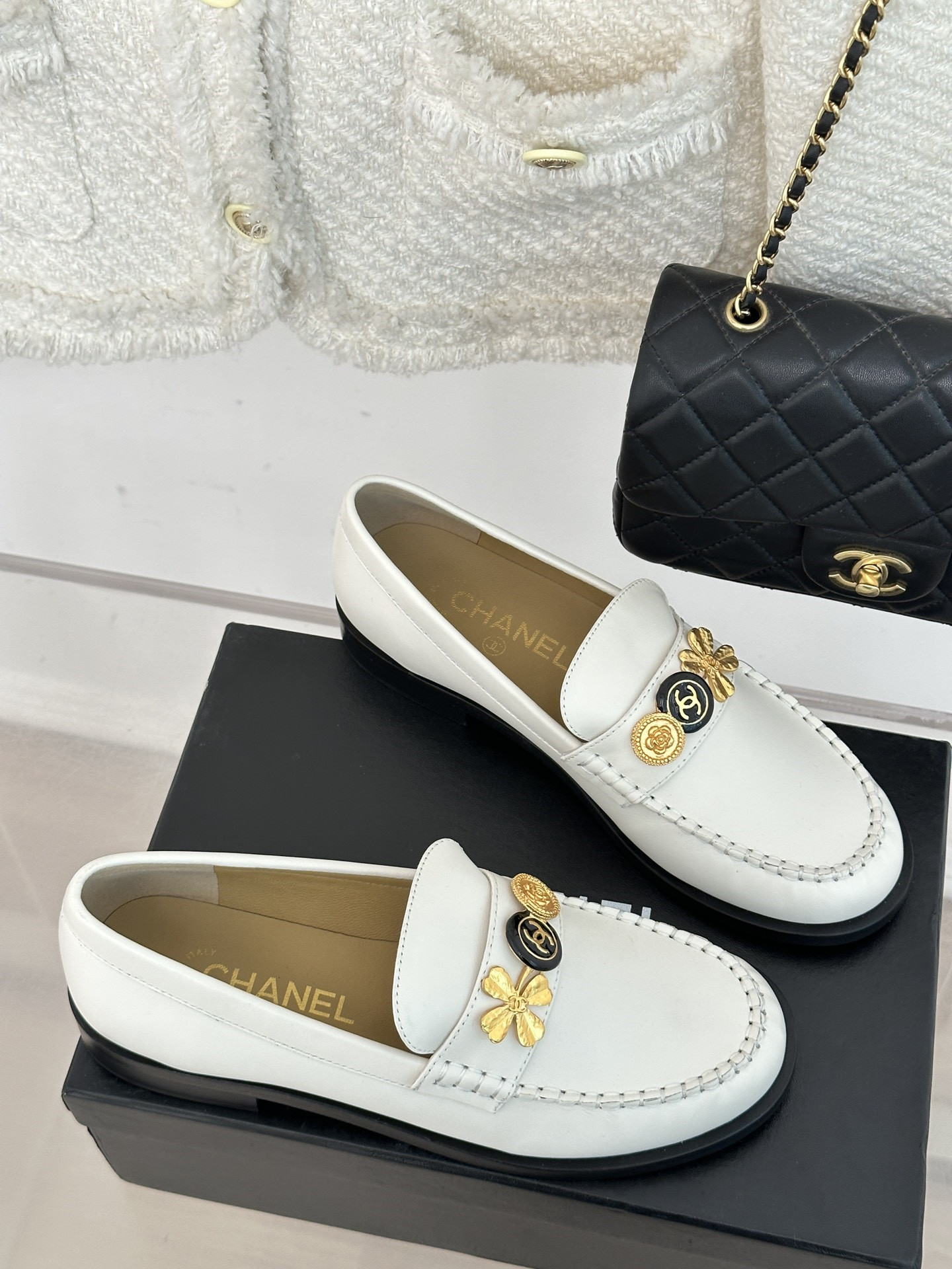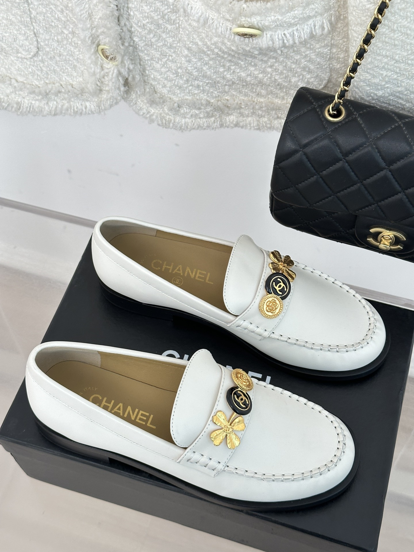 Chanel classic double C gold four-leaf clover gold coin loafers