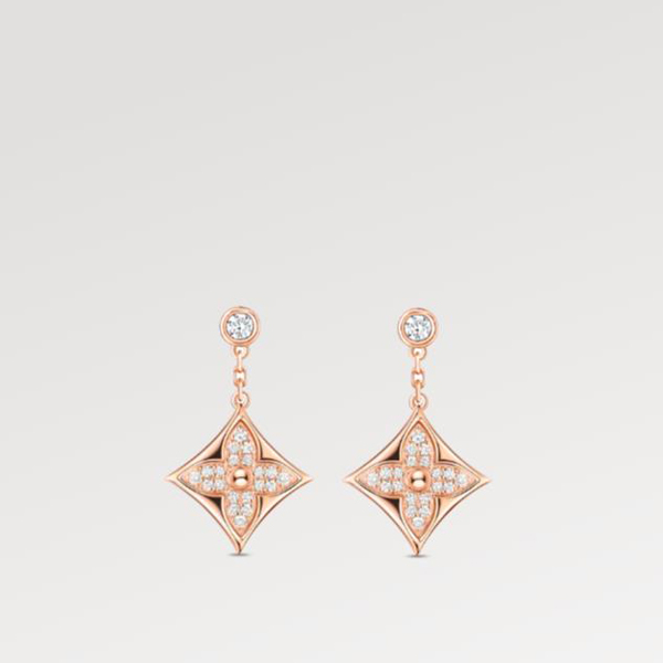 These Color Blossom BB Star ear studs celebrate the Monogram Flower, an enduring House emblem designed by Georges Vuitton in 1896. Fashioned from 18-kt pink gold and fiery diamond pavé, the drops are suspended from diamond studs. Precious yet easy to wear, these signature jewels will add a flash of sparkle to any ensemble.