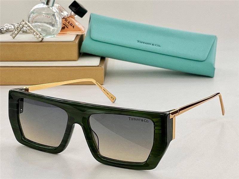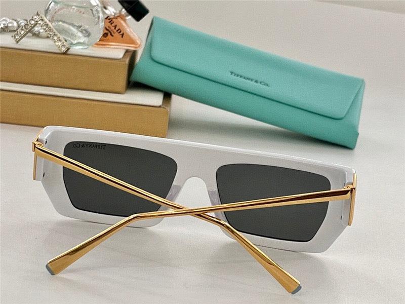 Inspiring, empowering and above all, unwavering, the Tiffany T collection reminds us of the connections we feel but cannot always see. This pair of Tiffany T sunglasses is crafted in Tiffany Blue acetate with silver-colored metal accents and dark gray rectangular lenses. Graphic angles and clean lines blend to create the beautiful clarity of the Tiffany T eyewear collection.