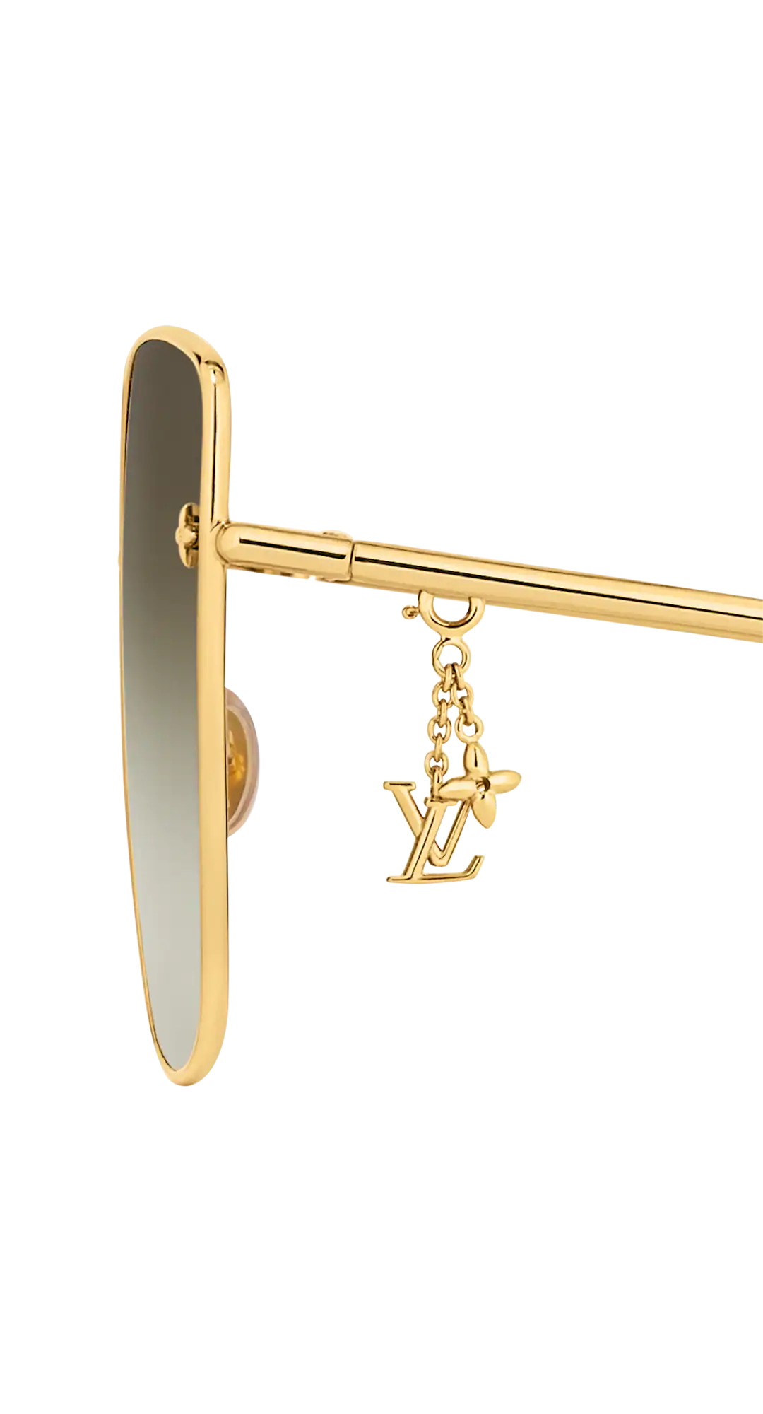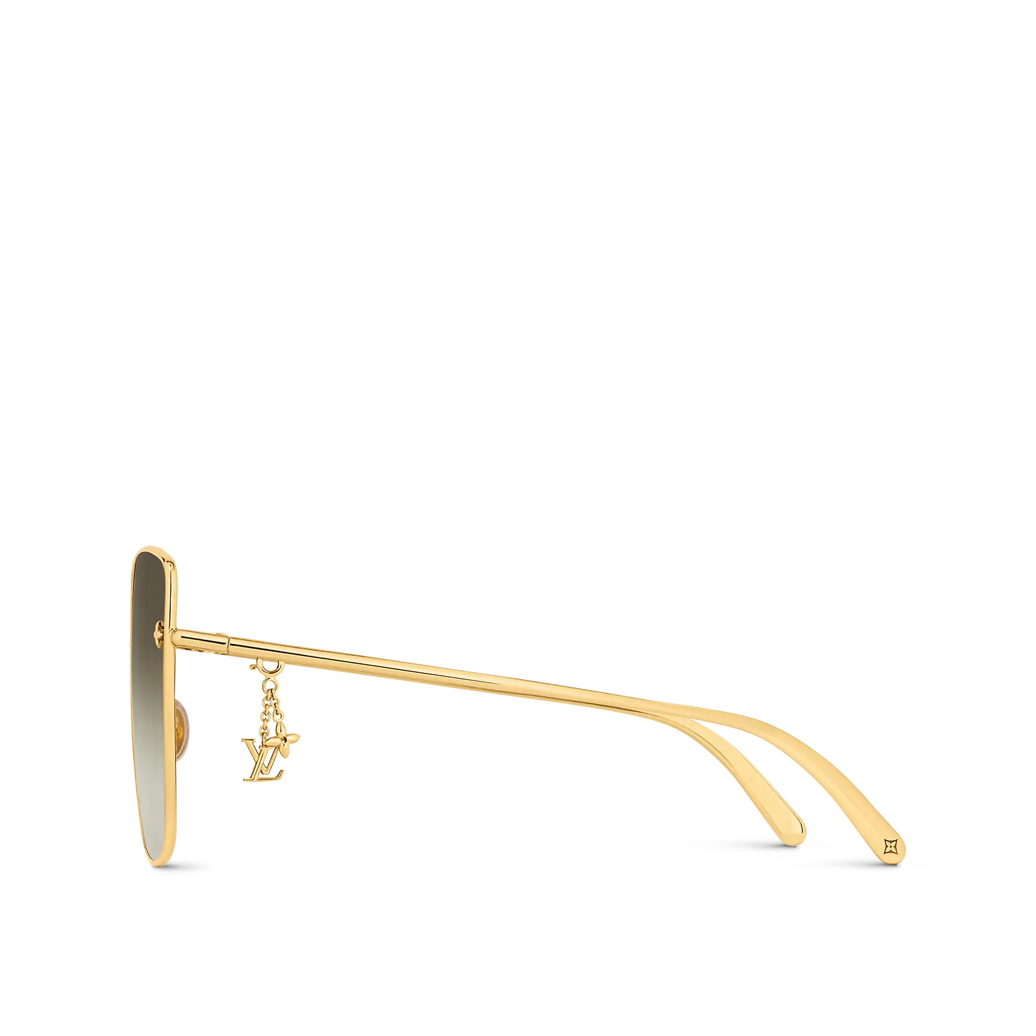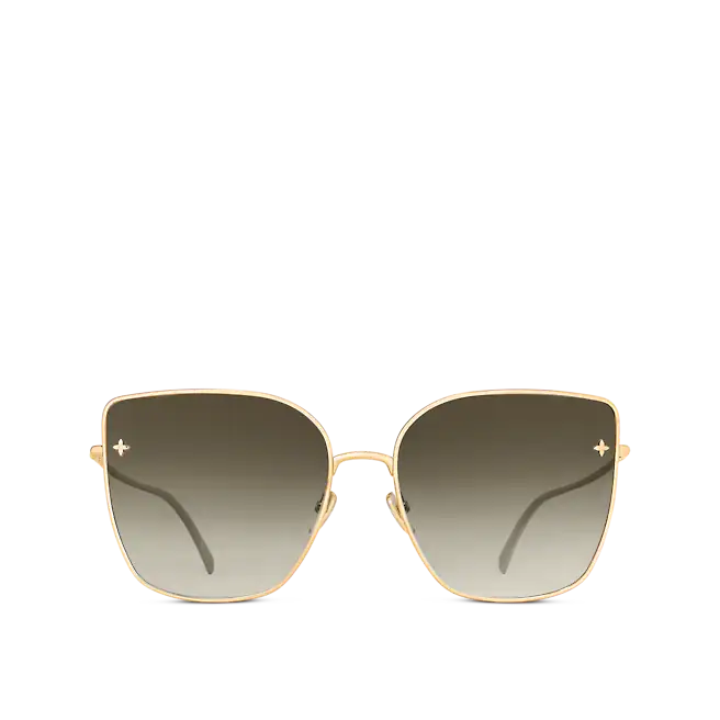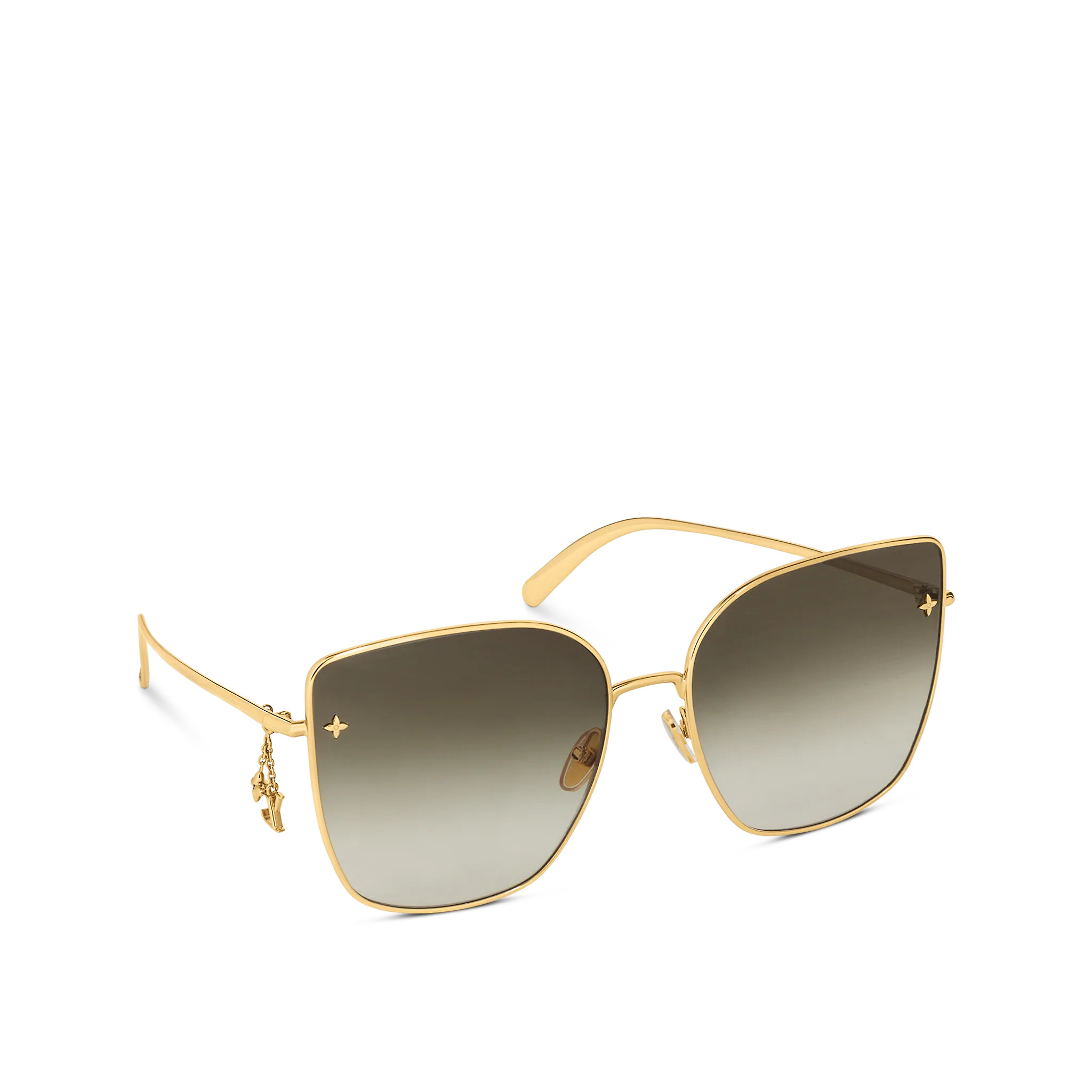 The LV Charm Cat Eye sunglasses are an oversized take on a classic shape. The lightweight gold-toned metal frame offers optimal comfort, while the gradient lenses make a dramatic statement. A removable LV Initials and Monogram Flower charm can be attached to the temples for a whimsical touch.