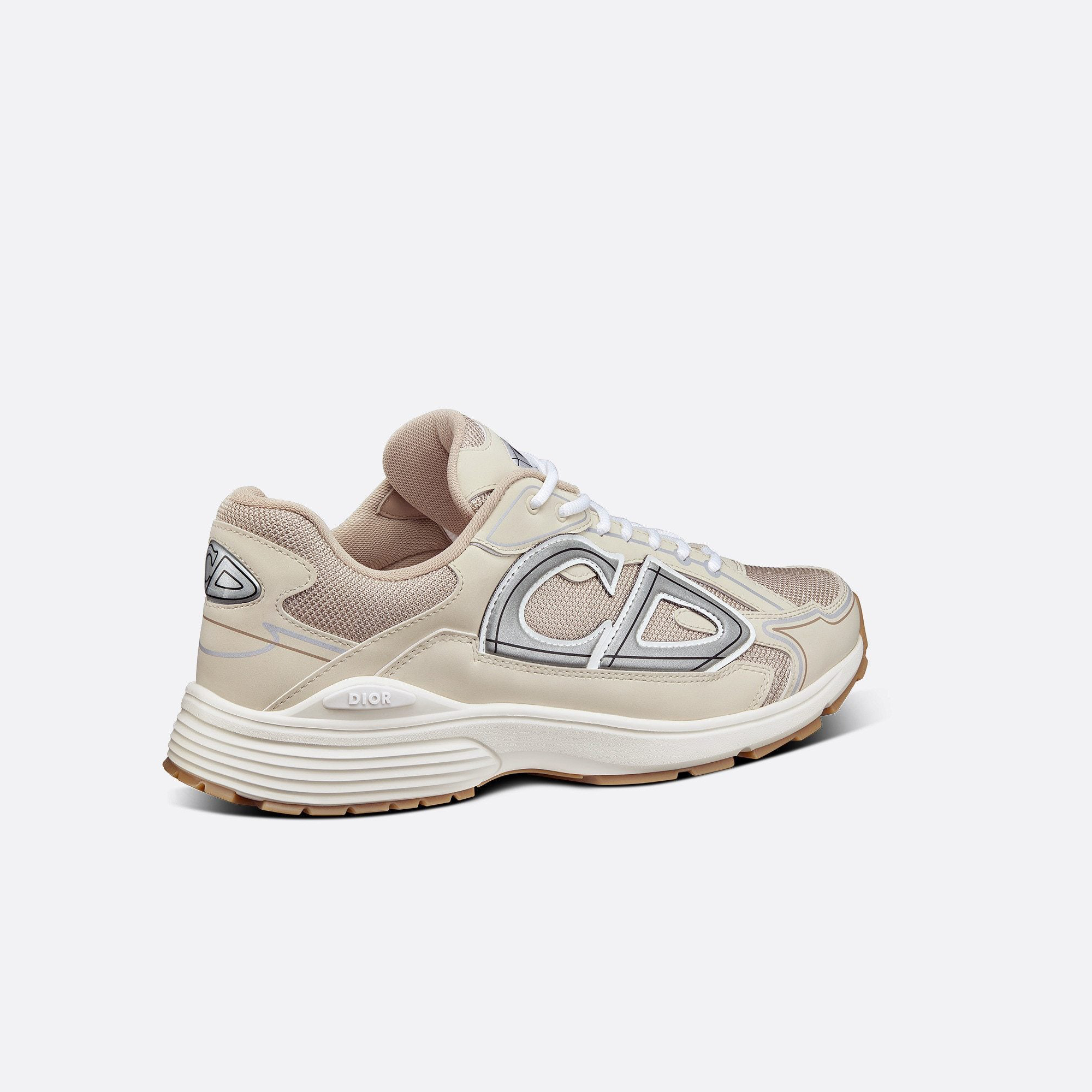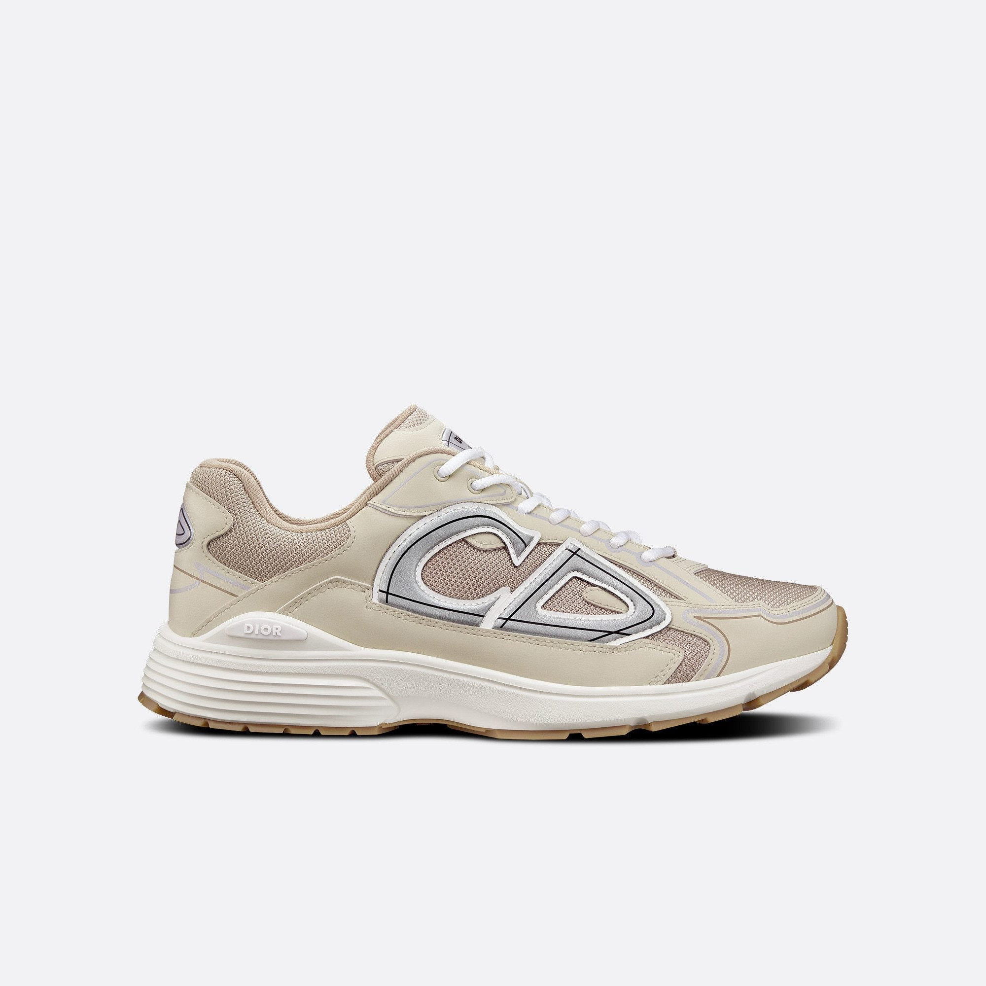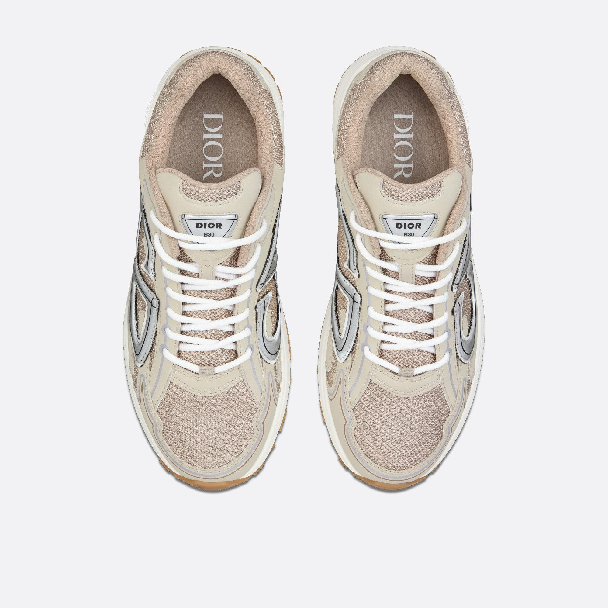 Brand new this season, the B30 low-top sneaker is one of the collection's flagship styles. Crafted in cream mesh and technical fabric, it boasts a graphic, reflective 'CD30' signature and is further adorned with 'DIOR B30' and 'CD30' signatures on the back and tongue. Its ultra-lightweight sculpted rubber sole is enhanced with hallmark accents while interior elastic detailing provides optimum comfort. The B30 sneaker will complement any casual outfit with its modern, sporty silhouette.