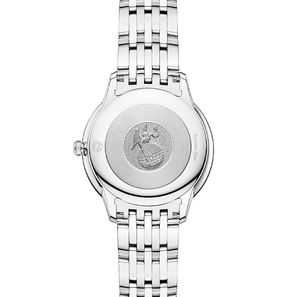 Reptesenting classical elegance, the Omega De Ville Prestige watch collection is home to a range of timepieces offered in various colours and styles. This lady’s model is powered by a quartz movement with an improved battery life and is crafted from stainless steel. The movement is concealed behind a closed caseback embossed with a God Chronos medallion. The design blends the traditional with the modern in this timeless design, perfect for all occasions. It measures a diameter of 30mm and is equipped with 30-meter water resistance. Rhodium-plated hands travel over a white mother of pearl dial. An hour track surrounding these hands is characterised by a mix of cabochons and traditional Roman numerals - also executed in the same rhodium plating. The Omega lettering and logo stand proud at 12 o’clock, protected underneath a piece of anti-reflective and scratch-resistant sapphire crystal glass. This lady’s Omega De Ville Prestige watch wraps effortlessly around the wrist with a stainless steel bracelet with a folding clasp that is engraved with the iconic brand logo.