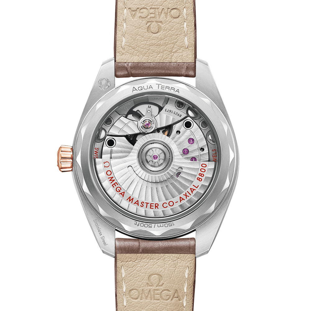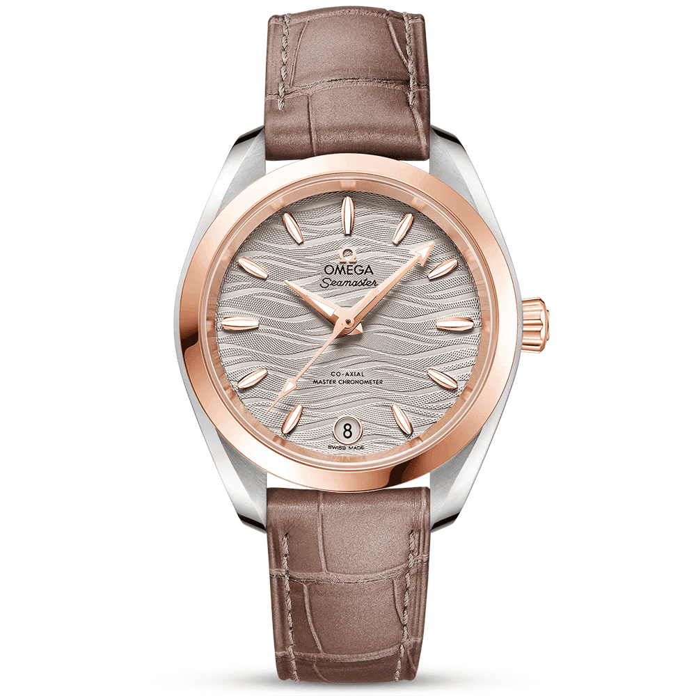 OmegaSeamaster Aqua Terra 34mm Waved Agate Grey Dial Leather Strap Watch 220.23.34.20.06.001. Stainless steel & 18ct Sedna gold 34mm case and bezel all on a brown leather strap. This stylish ladies watch has an agate grey dial with waved pattern as well as rose golden and luminous applied hands and a date display at the 6 o'clock position. Water resistant up to 150m and sapphire crystal glass. Omega Calibre 8800 Co-Axial automatic movement.