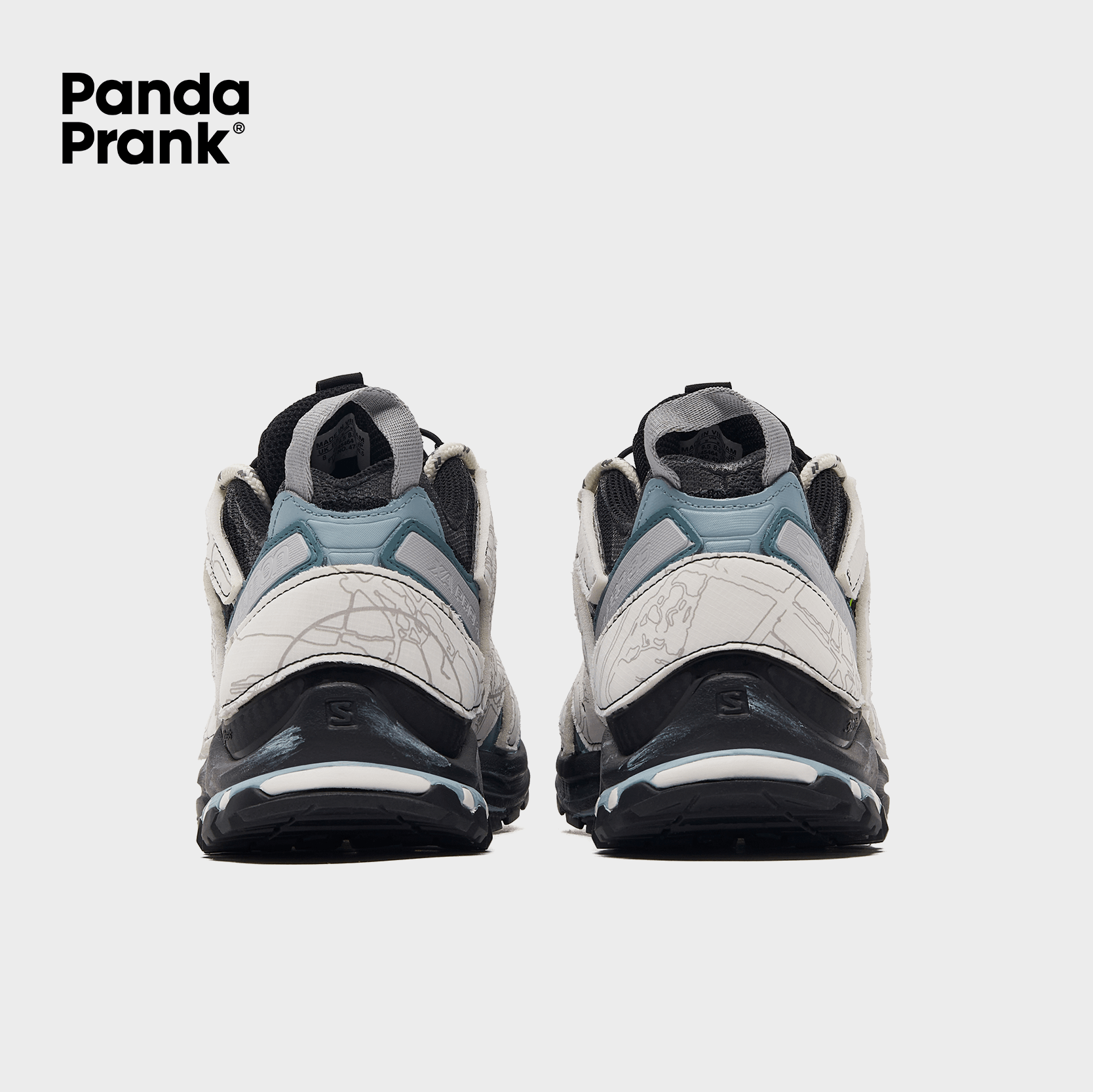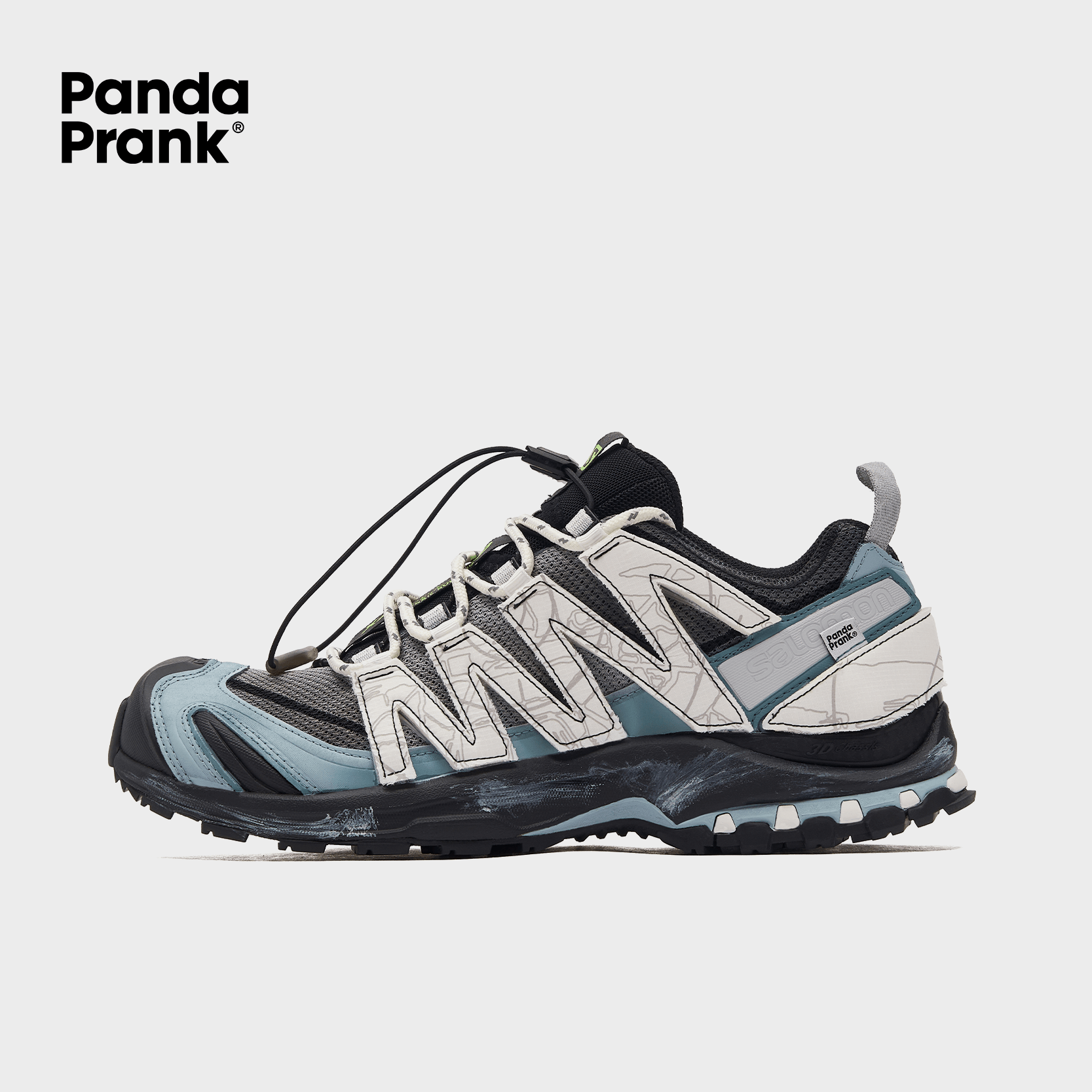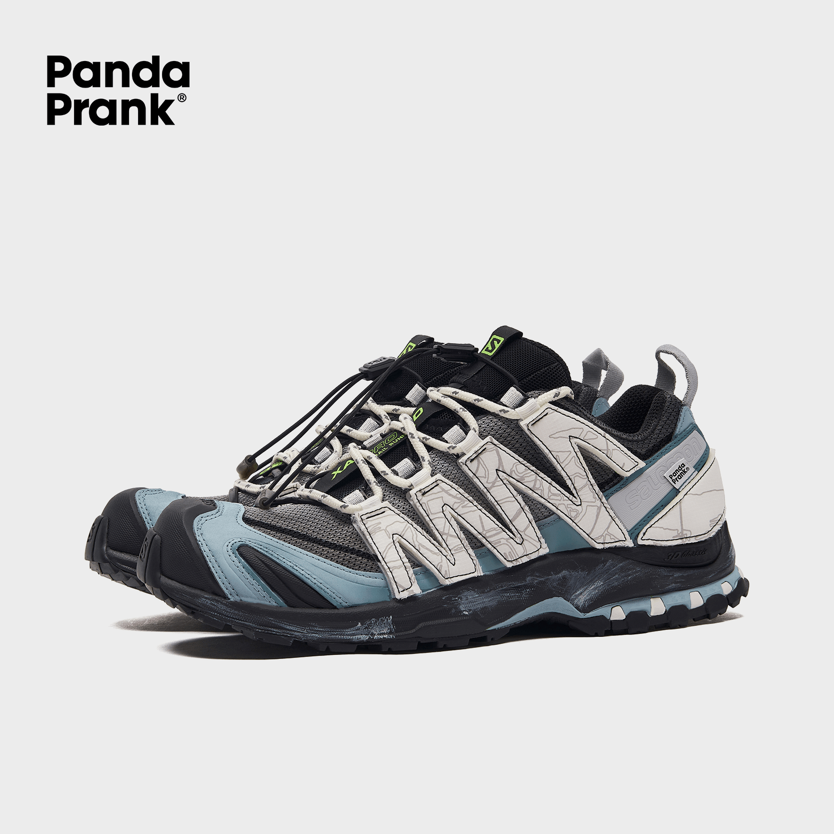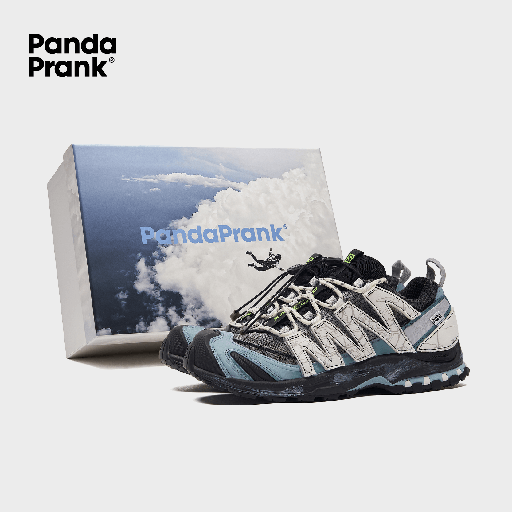 The design draws inspiration from the breathtaking beauty of parachutes soaring through the sky, seamlessly blending their sense of freedom with the precision of landing into the Salomon aesthetic. The color palette, composed of serene blues, pristine whites, and deep, subtle grays, weaves together a visual tapestry that is both modern and dreamlike.