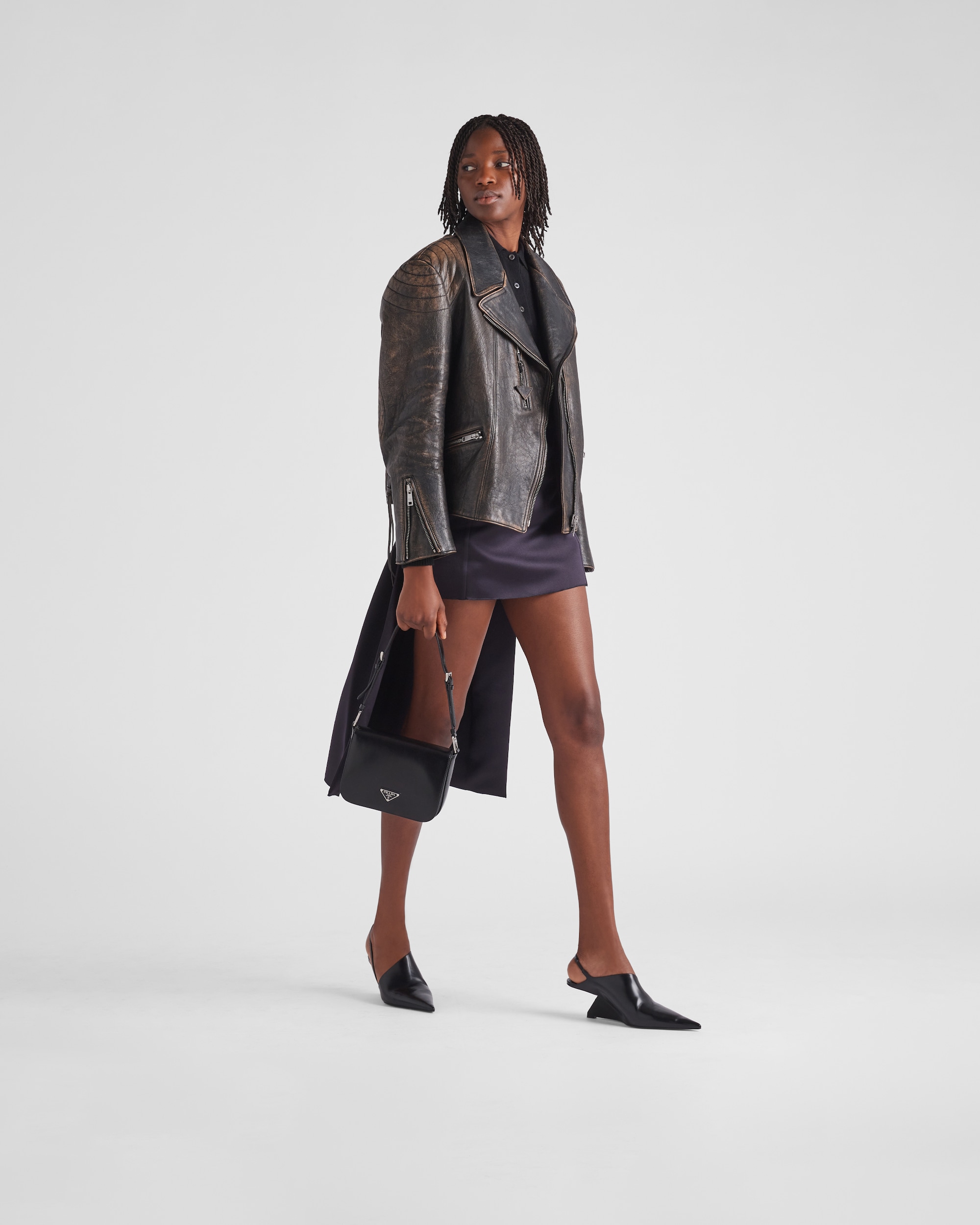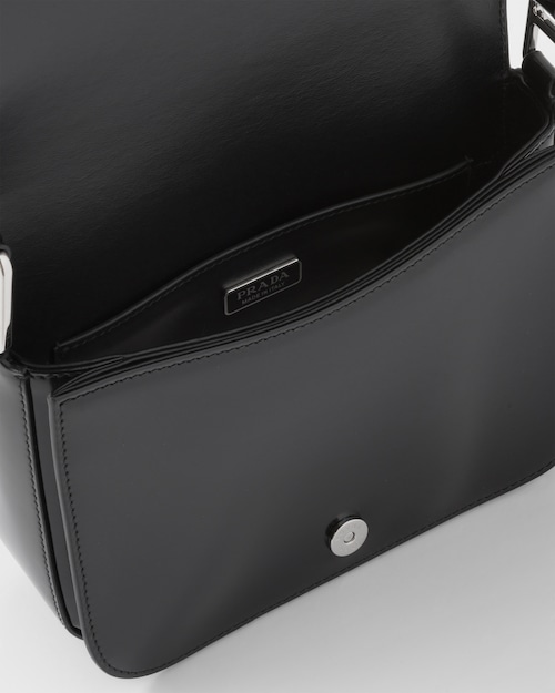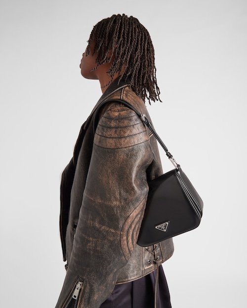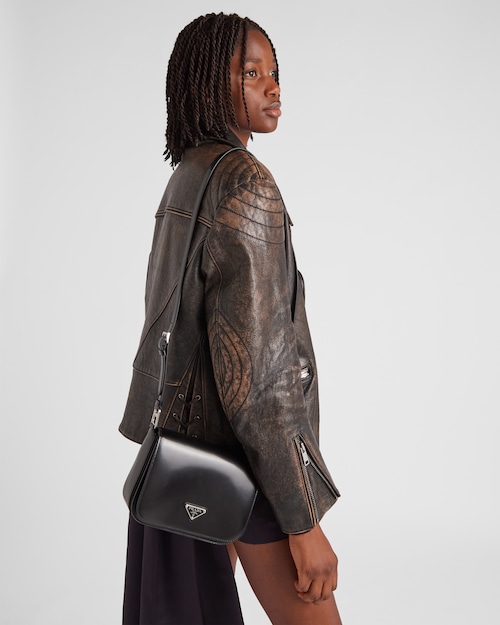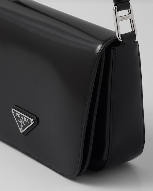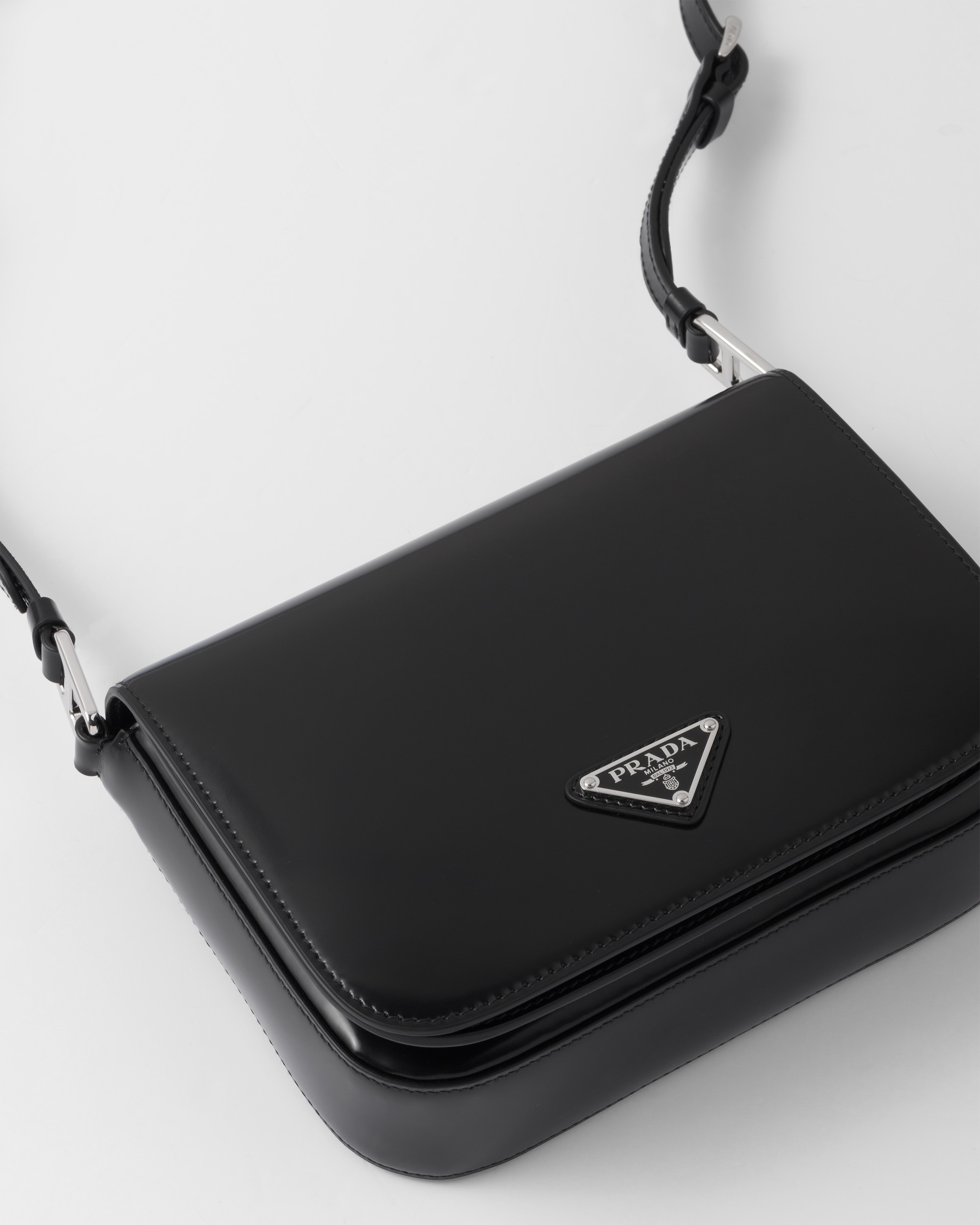 Elegance and practicality meet in this bag with a hybrid character that combines sleek and modern lines, functionality, and fine materials. Made of Prada's iconic brushed leather, a material that is as chameleonic as it is luxurious, this rigid, curvy bag is characterized by its flap closure and leather shoulder strap that is adjustable for wear as a crossbody or shoulder bag. Decorating the flap is the emblematic enameled metal triangle logo created by founder Mario Prada and reinvented on contemporary designs.