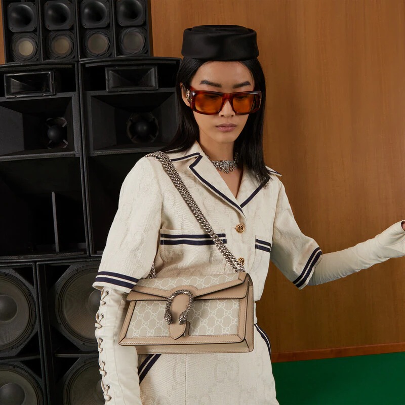 A heritage material from the archive. GG Supreme has been reimagined in GG Love Parade in different color combinations and combined with contemporary as well as classic styles. The Dionysus is presented in a beige and white variation of the signature material with a tonal trim. Originally a play on a '30s design. the canvas speaks to the historical narrative that runs throughout the collection.