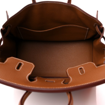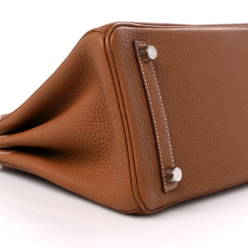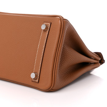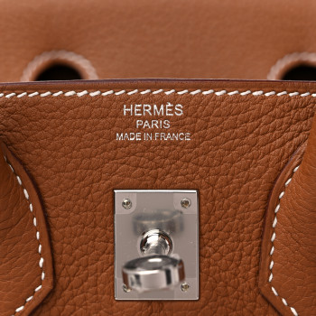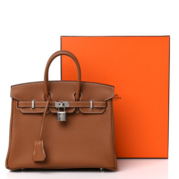 This is an�authentic�HERMES Togo Birkin 25 in Gold. This classic handbag is beautifully crafted of togo calfskin leather in light golden brown. The bag features rolled leather top handles, a short front flap and strap closure, and palladium hardware. This opens to a goatskin leather interior with pockets.