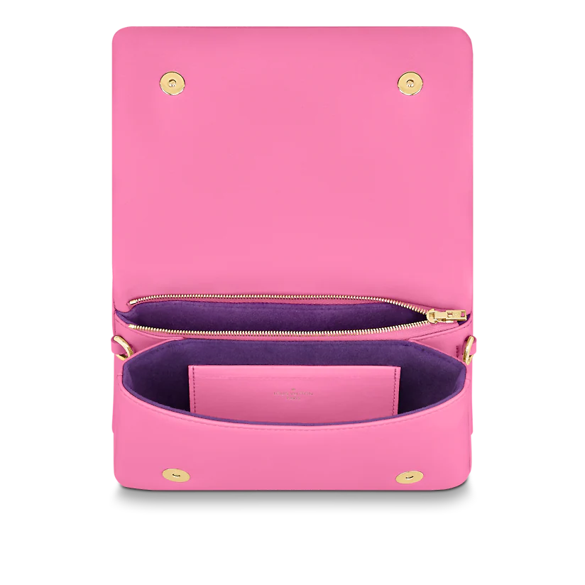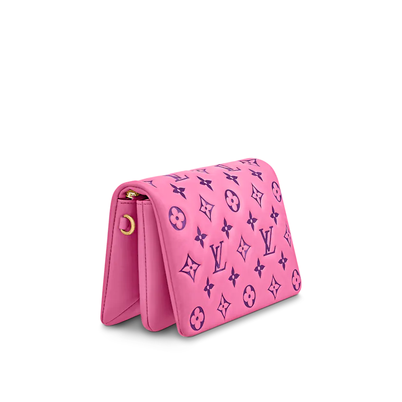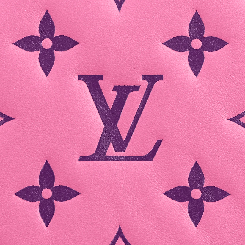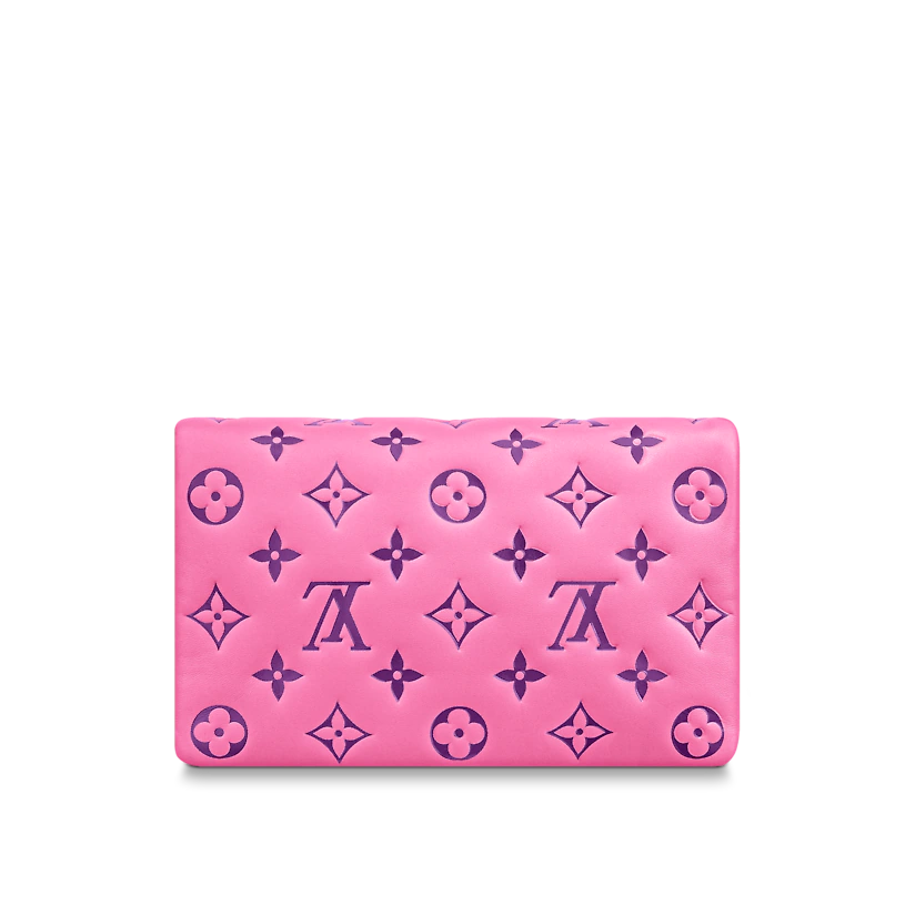 The Pochette Coussin is crafted from soft lambskin, which is embossed with the Monogram pattern to create a puffy, cushiony effect. This is further enhanced by the construction of the pouch, which gives it a supple, body-friendly shape. The removable chain, decorated with a Louis Vuitton charm, offers different carry options: clutch, shoulder or belt.