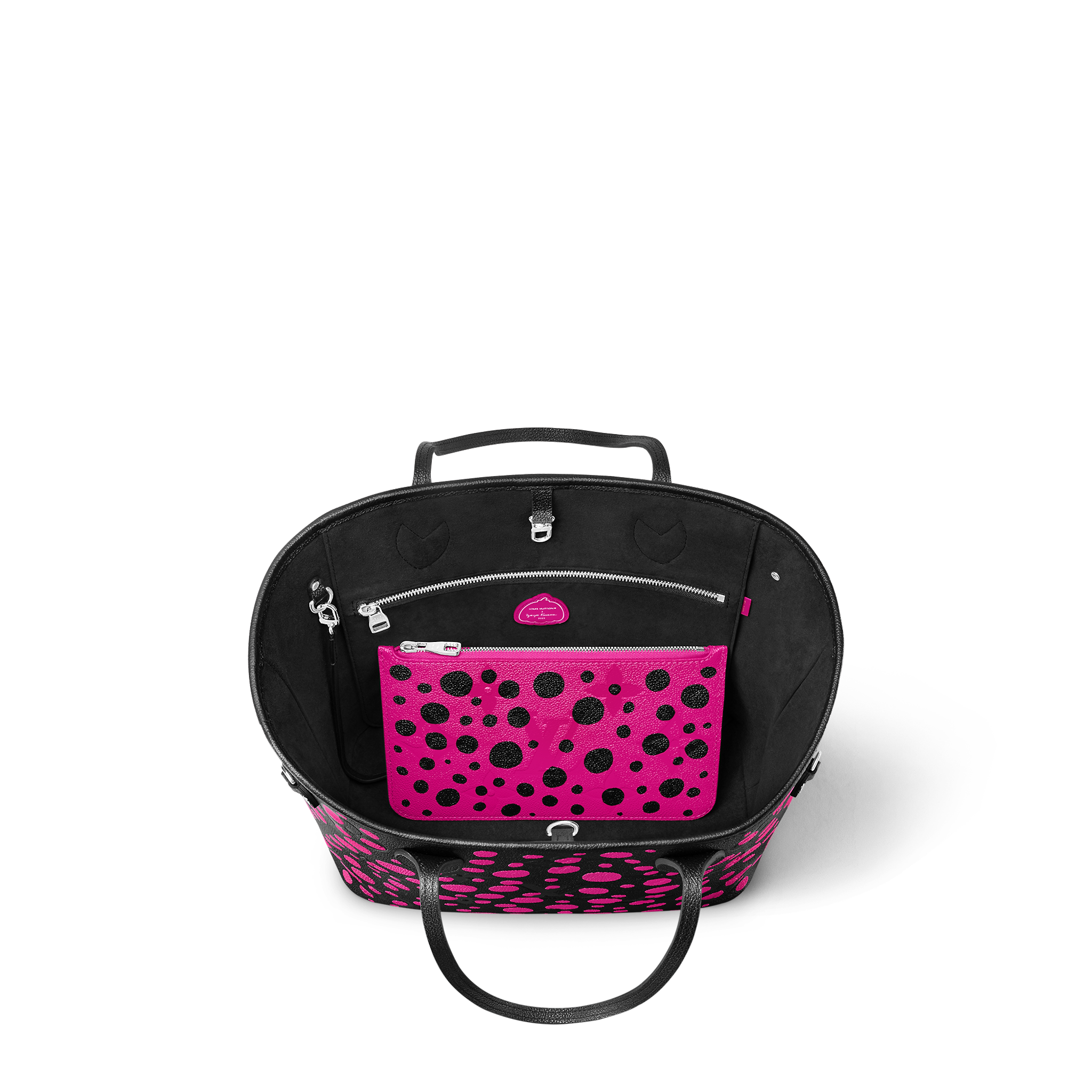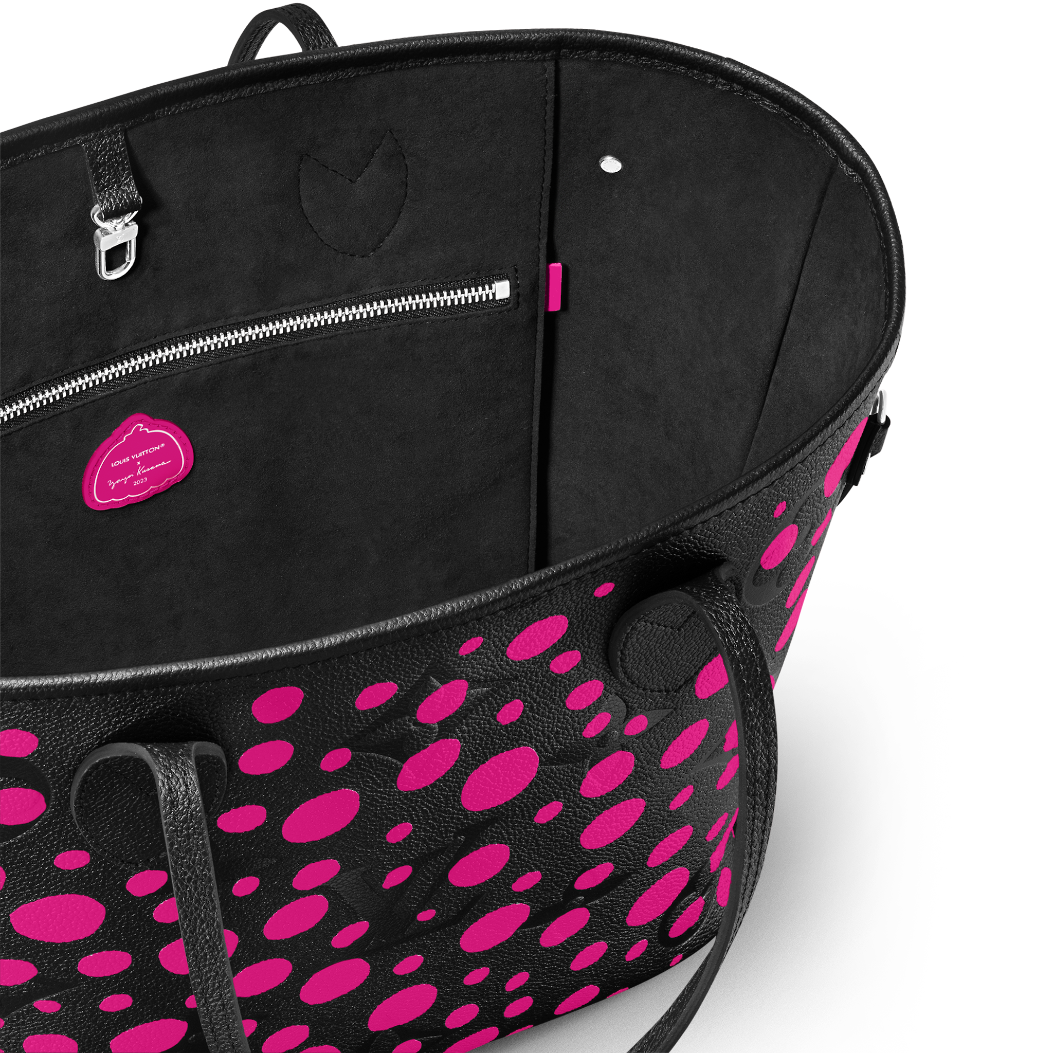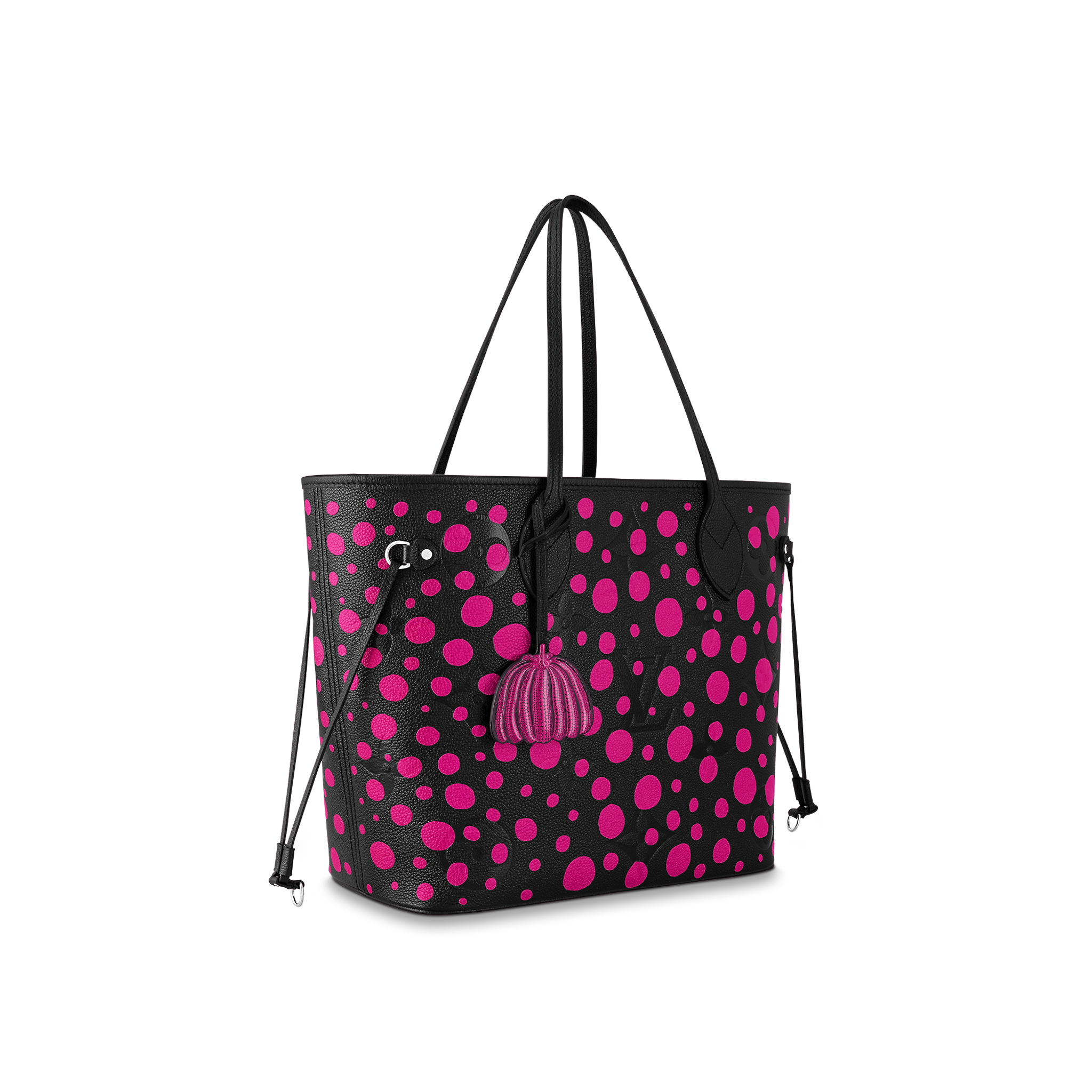 The LVxYK Neverfull MM joins the “Infinity Dots” theme of the major new Louis Vuitton x Yayoi Kusama collection. Endless arrays of dots are the Japanese artist’s ultimate visual signature, featured in her paintings, sculptures and performances since the beginning of her career. For this practical, capacious bag, bright fuchsia dots stand out against black Monogram Empreinte cowhide. And it comes with a pumpkin-shaped charm, echoing another of Kusama’s emblems.