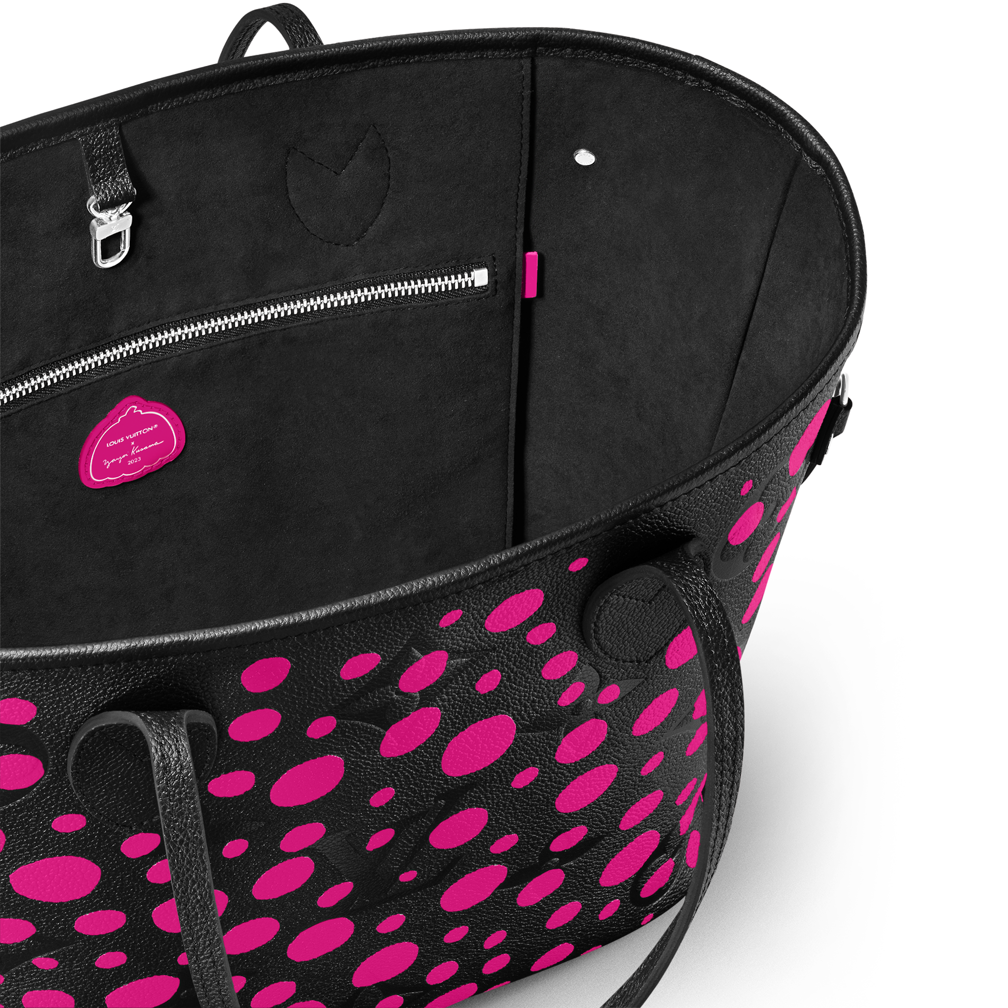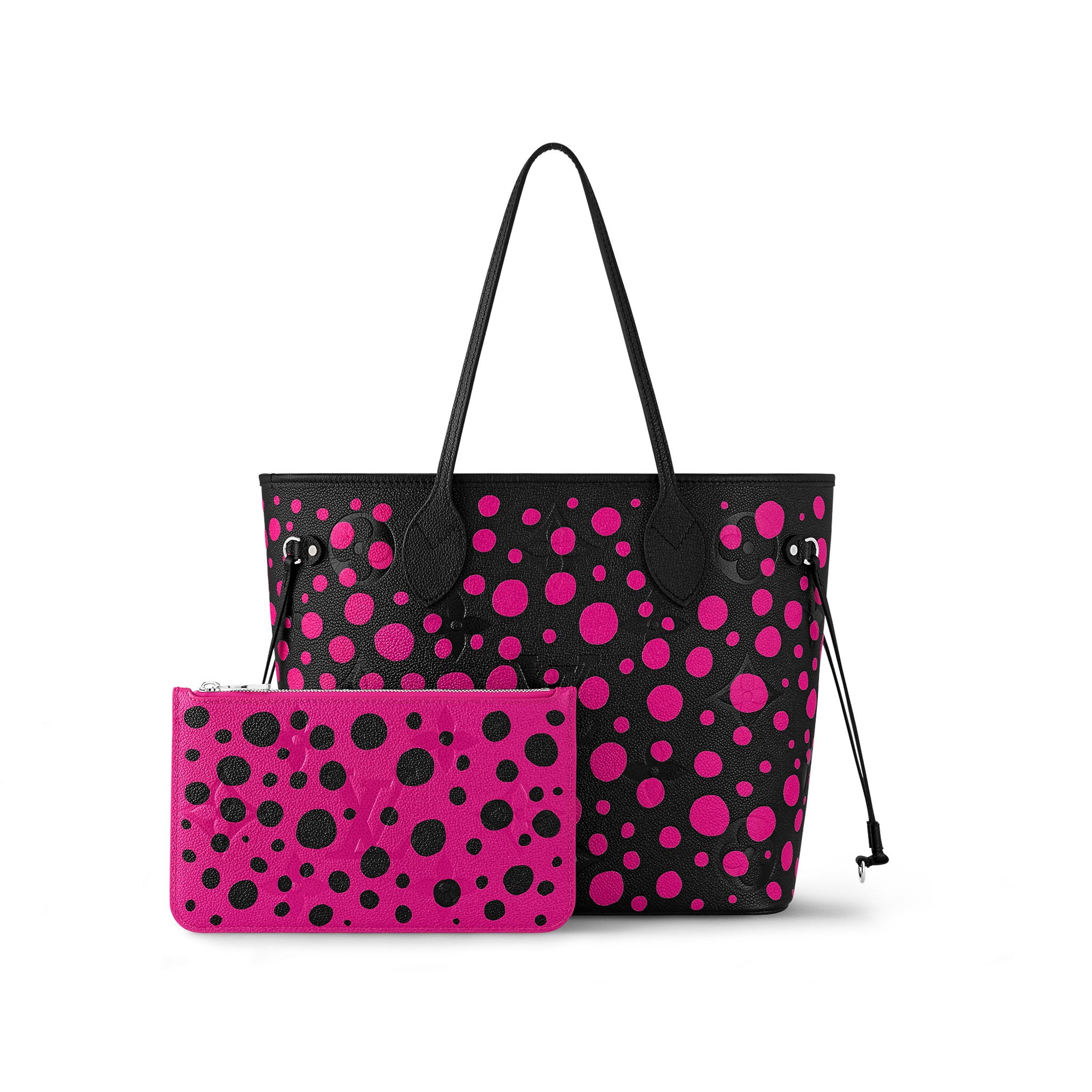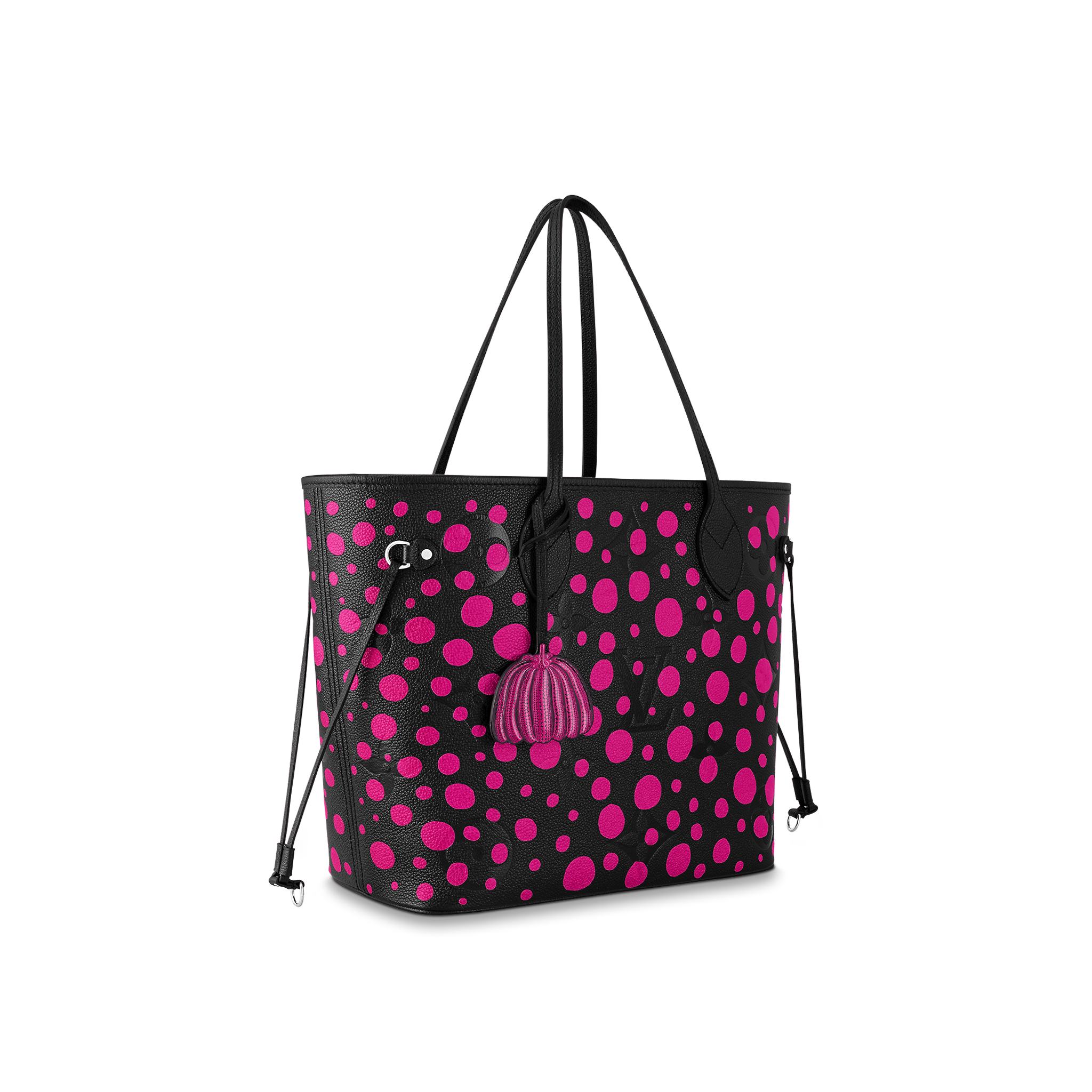 The LVxYK Neverfull MM joins the “Infinity Dots” theme of the major new Louis Vuitton x Yayoi Kusama collection. Endless arrays of dots are the Japanese artist’s ultimate visual signature, featured in her paintings, sculptures and performances since the beginning of her career. For this practical, capacious bag, bright fuchsia dots stand out against black Monogram Empreinte cowhide. And it comes with a pumpkin-shaped charm, echoing another of Kusama’s emblems.