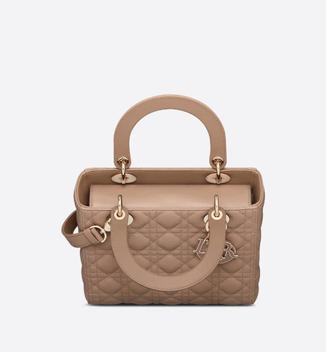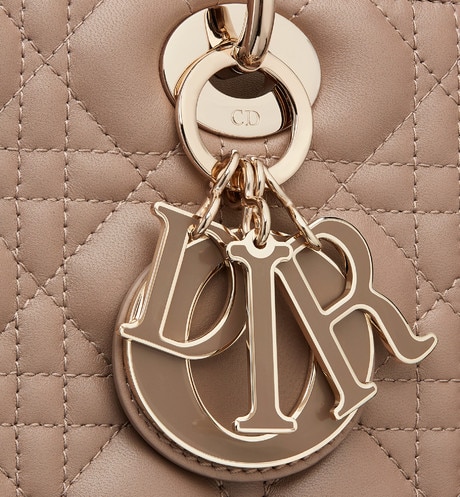 The Lady Dior handbag epitomizes Dior's vision of elegance and beauty. A sleek, elegant bag, it is timeless yet modern. Crafted from warm taupe lambskin with Cannage stitching, its supreme quilting instantly stands out. The tonal enamel signature 'D.I.O.R.' charms embellish its silhouette. The medium style has a thin, removable leather shoulder strap and may be carried by hand, worn over the shoulder or crossbody.