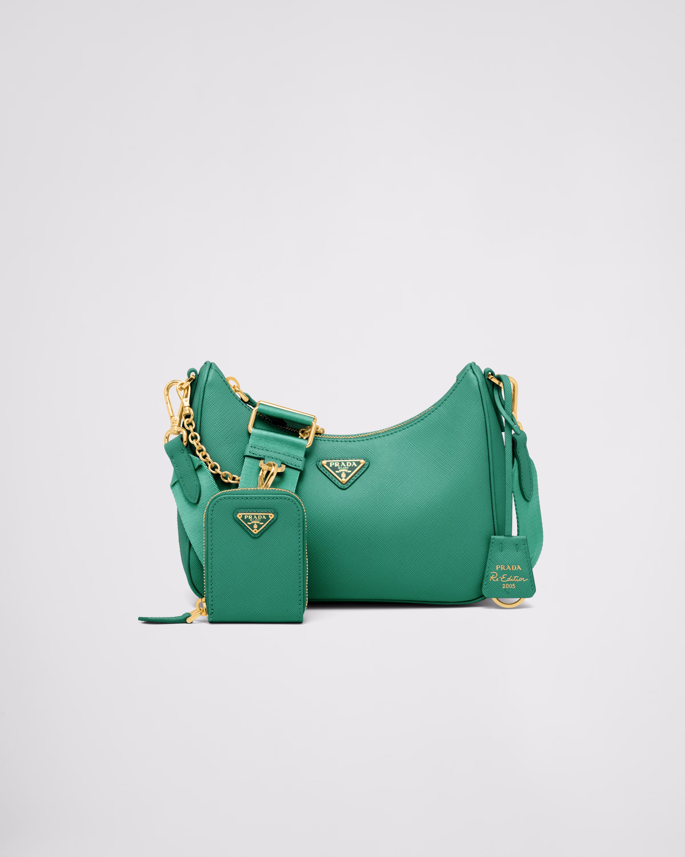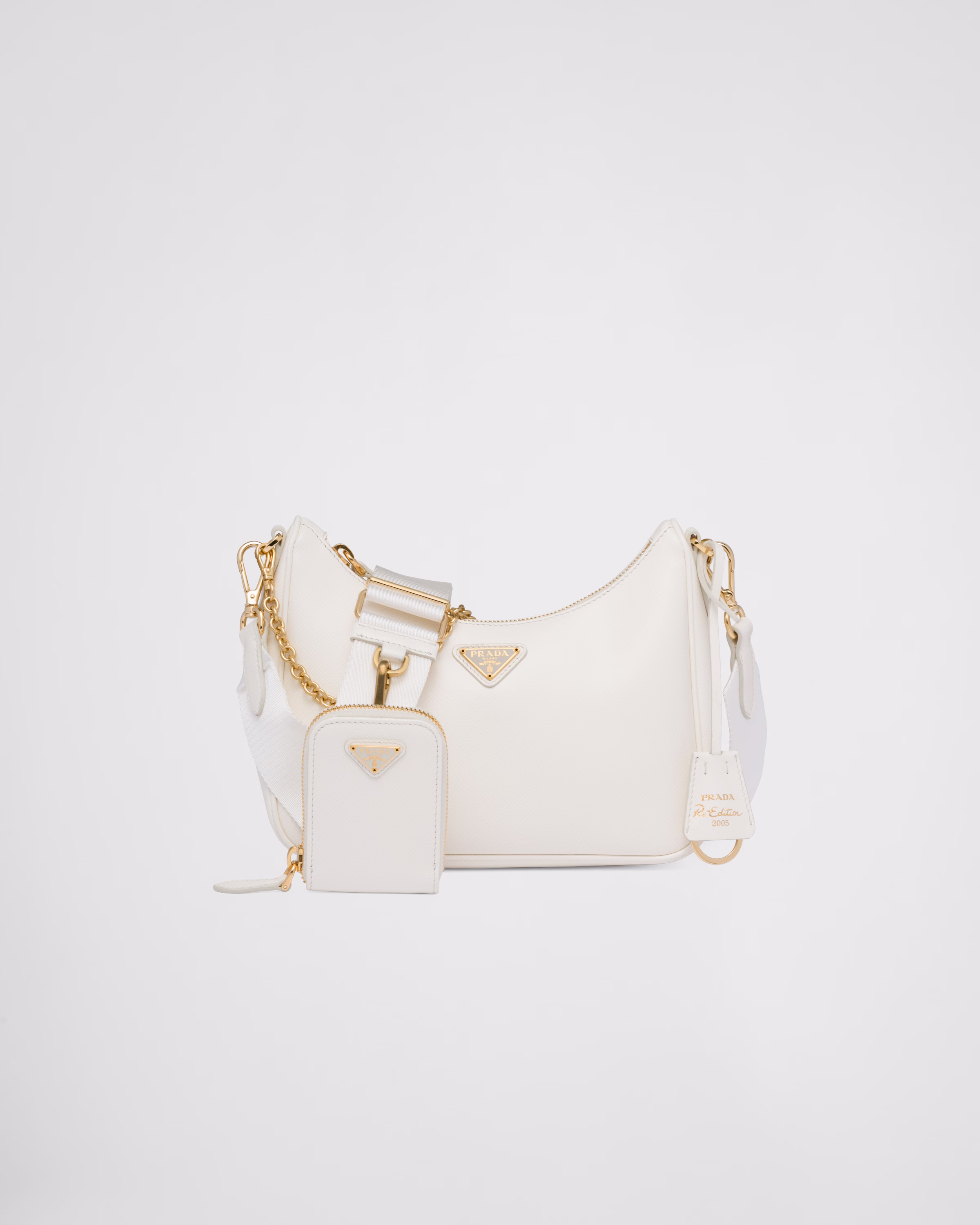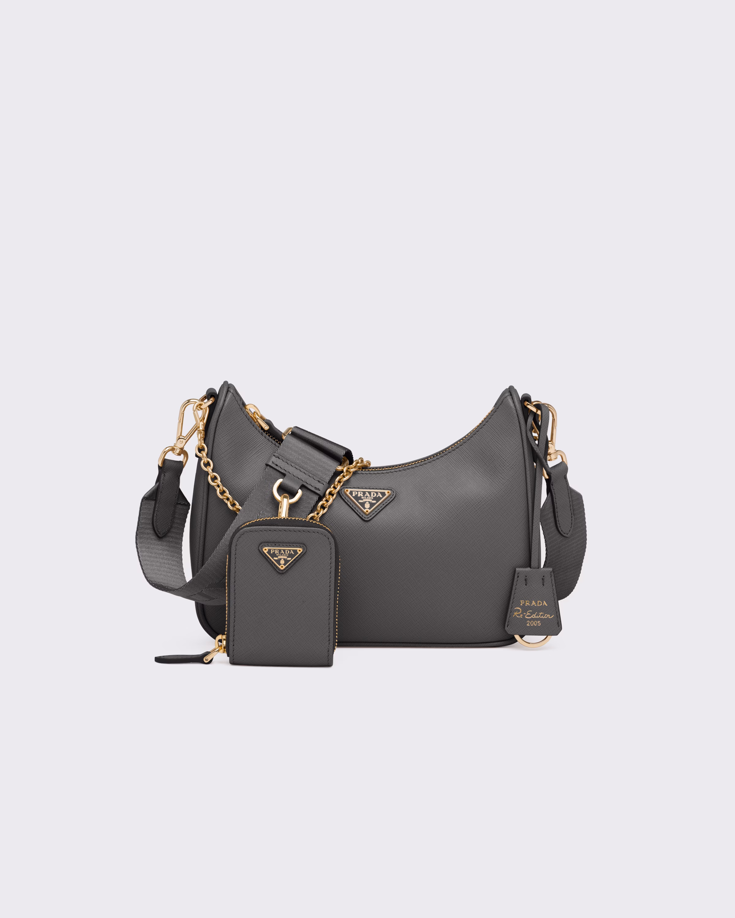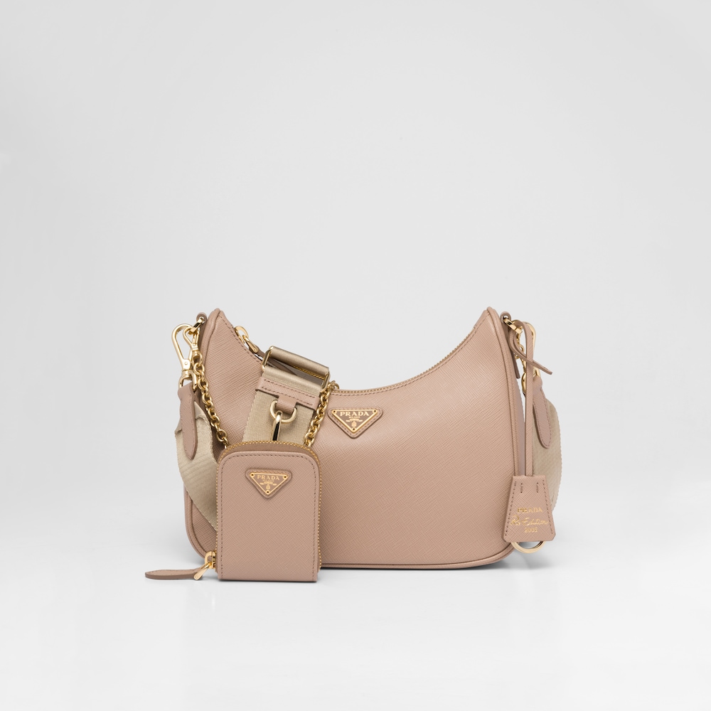 An iconic silhouette with sophisticated details that enhance the design: Prada transforms the classic shoulder bag, reinterpreting it in Saffiano leather with a cross-hatch motif that is a hallmark of the brand. The accessory is completed by a removable leather pouch and Re-Edition keychain, making the bag unique and functional.