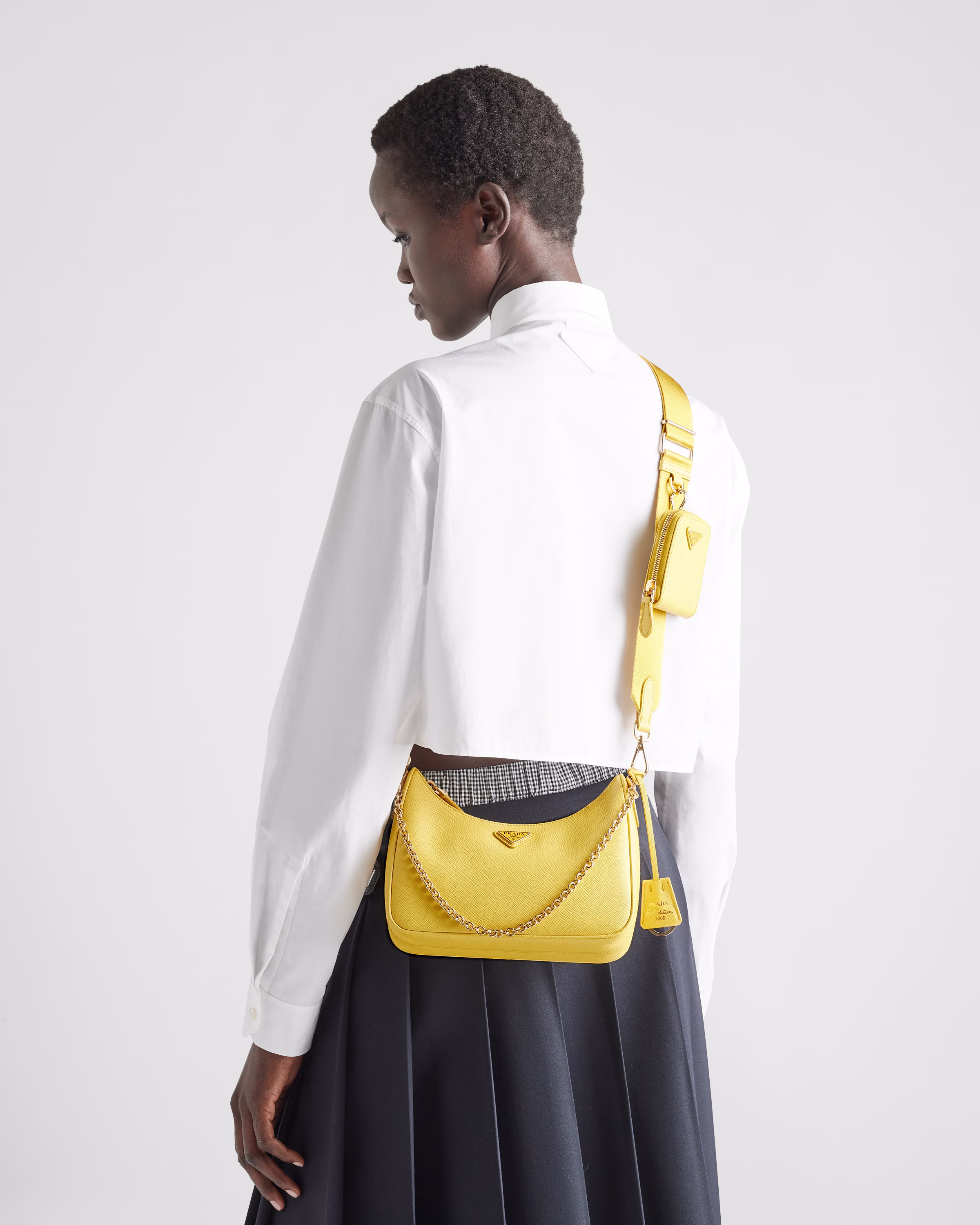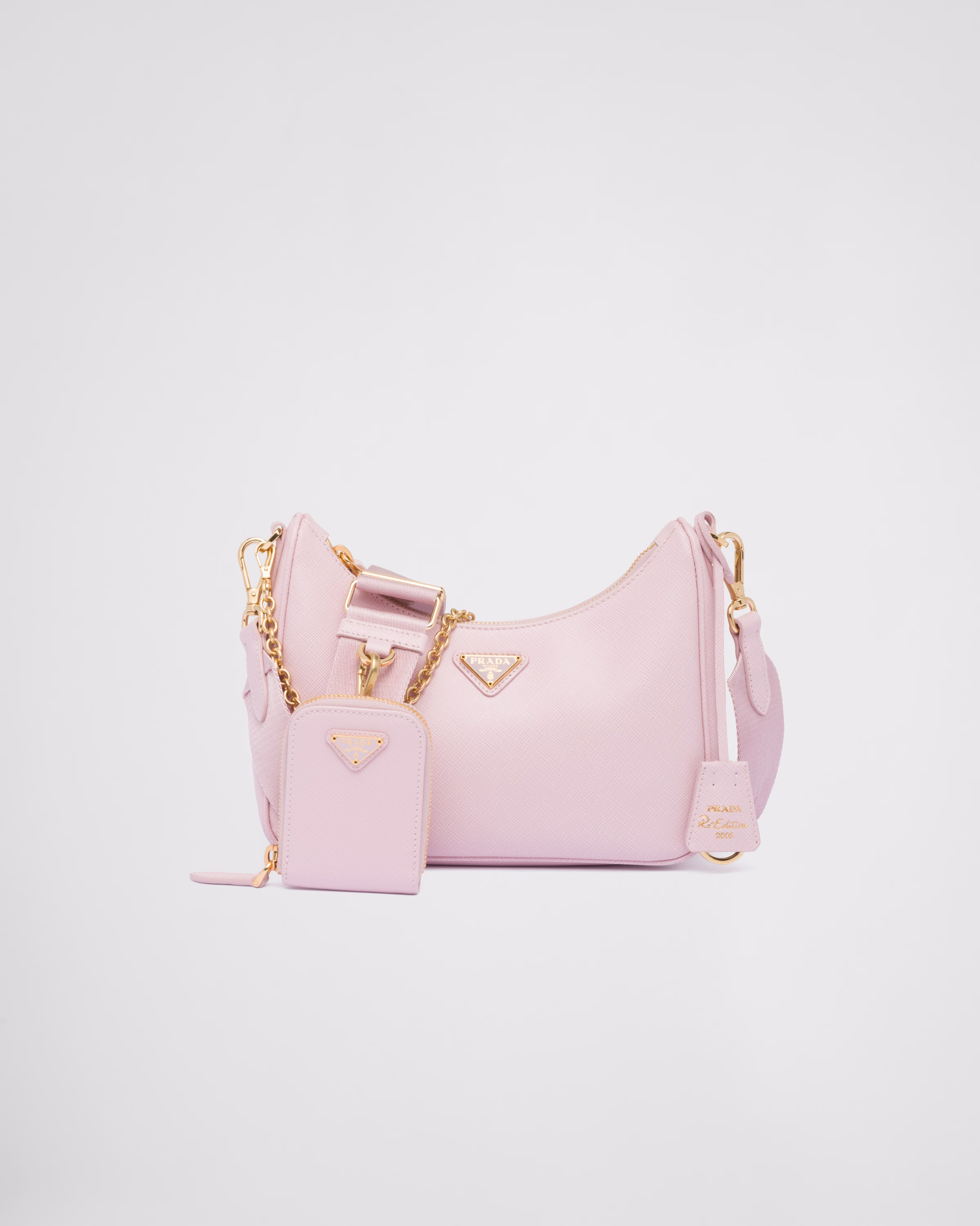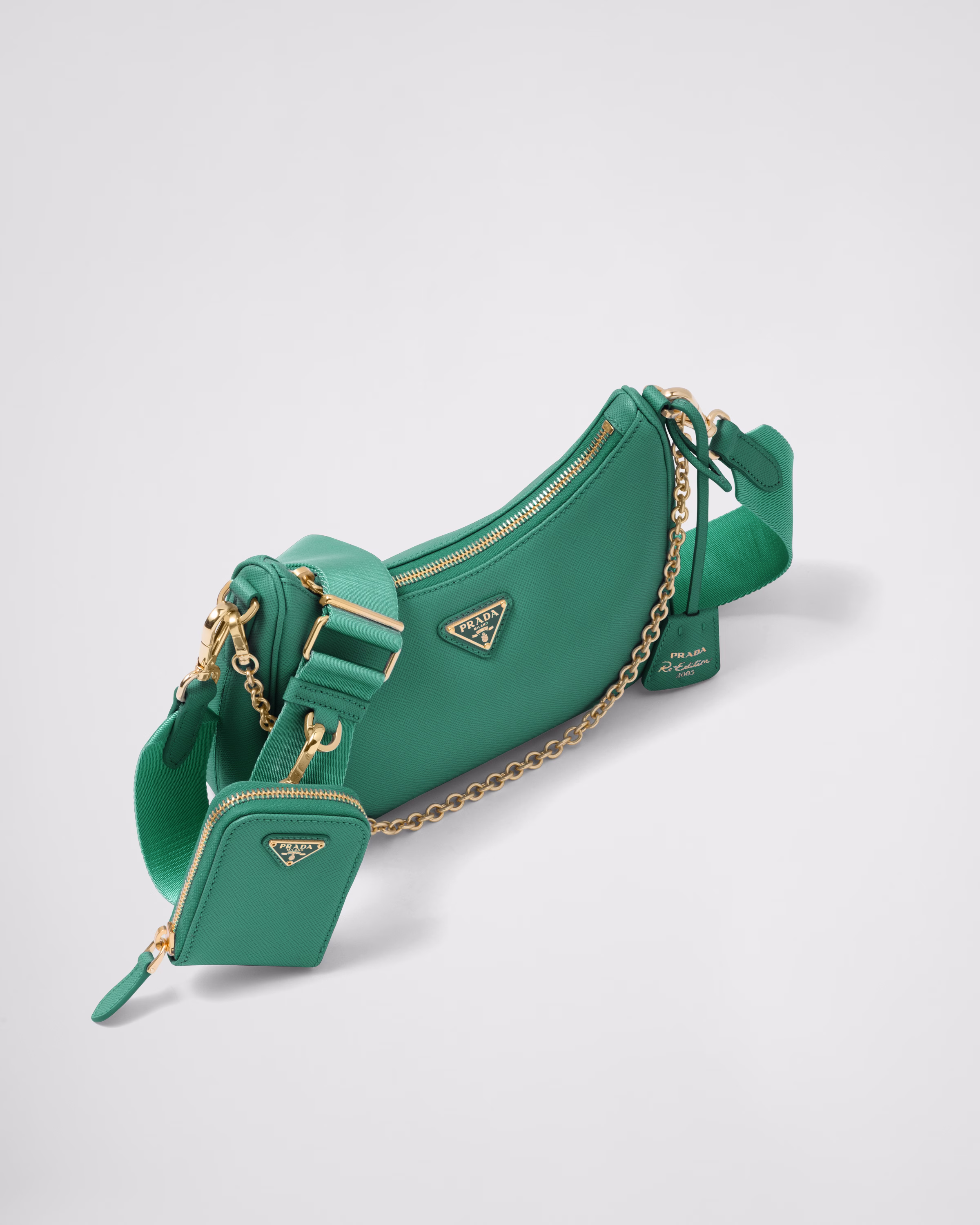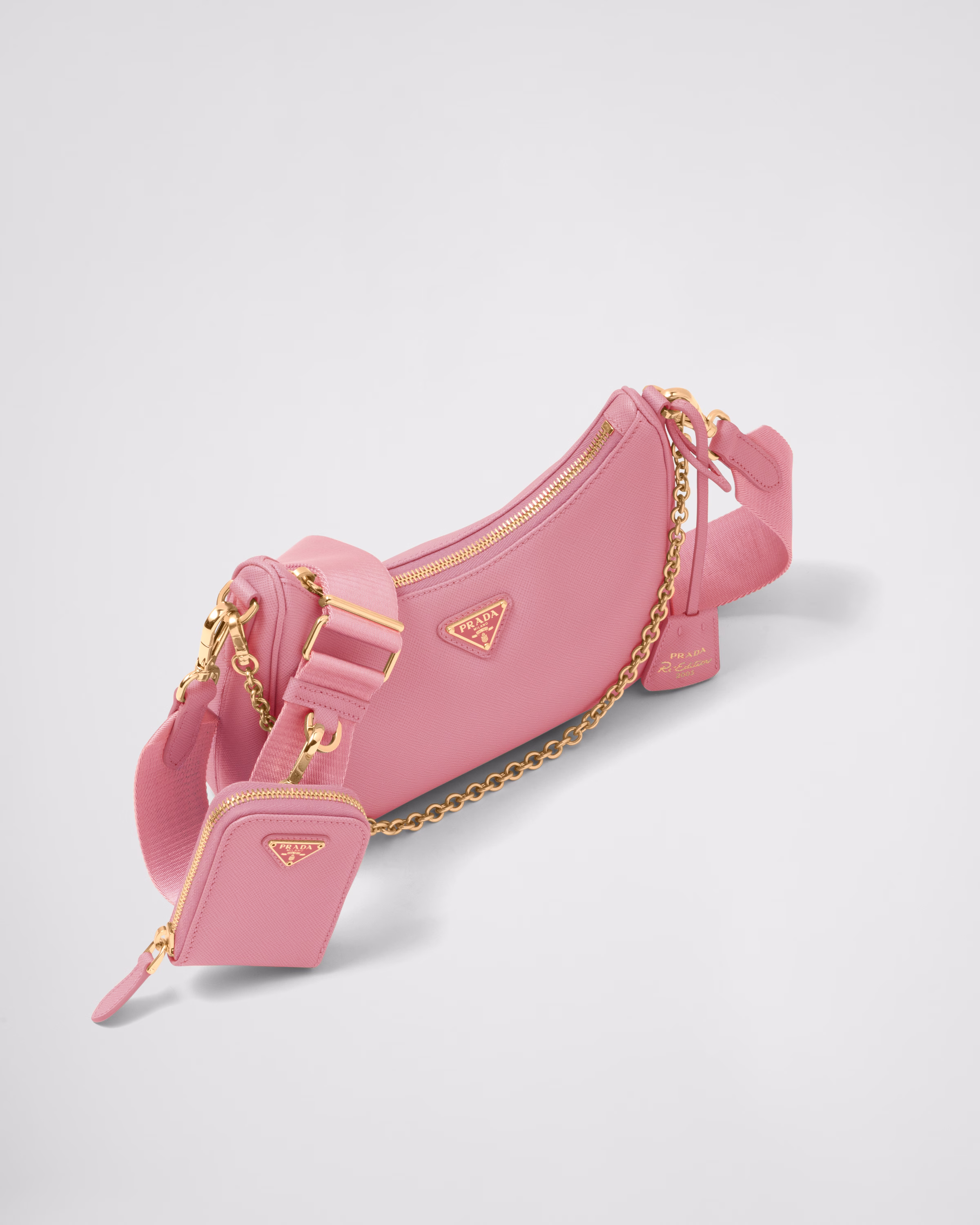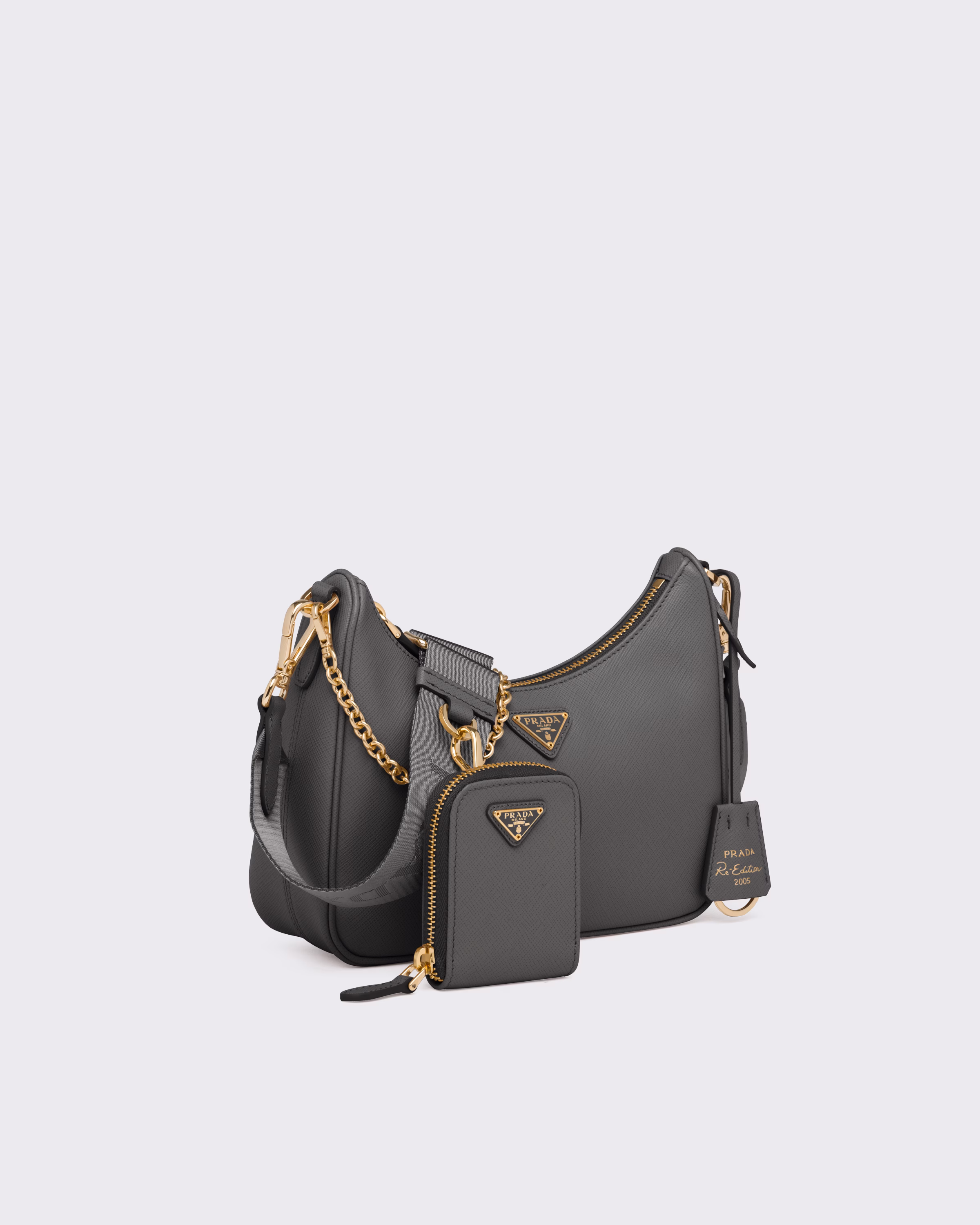 An iconic silhouette with sophisticated details that enhance the design: Prada transforms the classic shoulder bag, reinterpreting it in Saffiano leather with a cross-hatch motif that is a hallmark of the brand. The accessory is completed by a removable leather pouch and Re-Edition keychain, making the bag unique and functional.