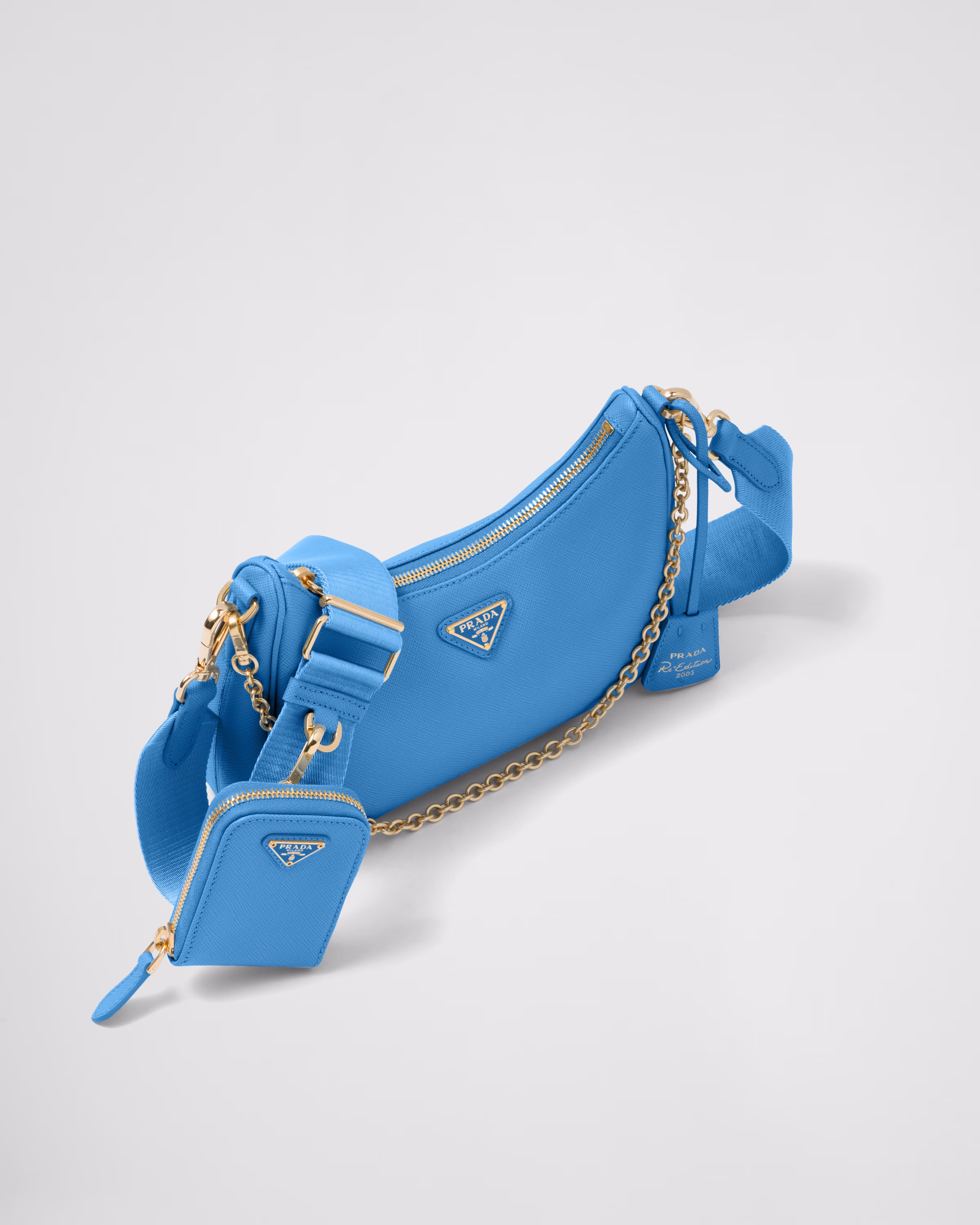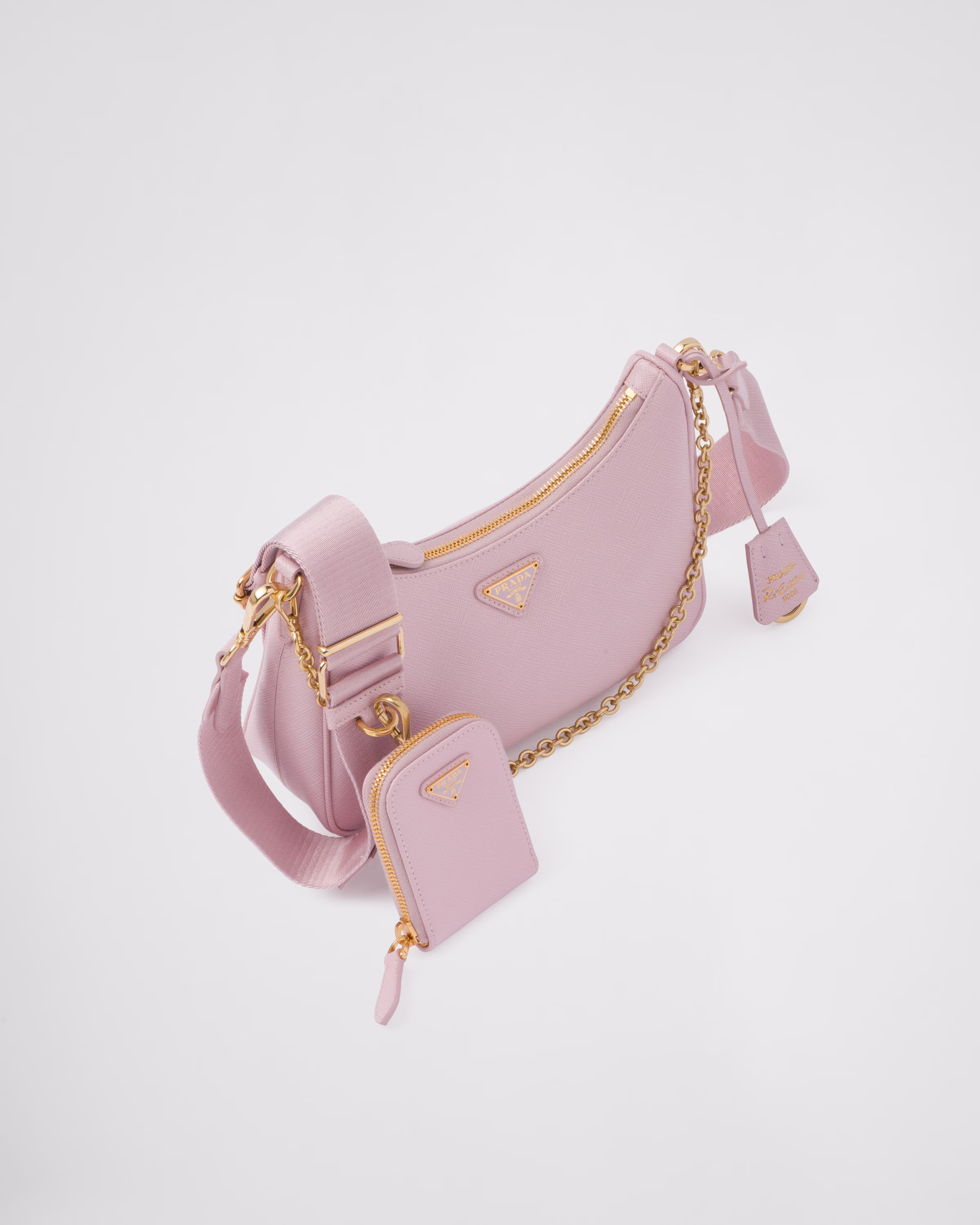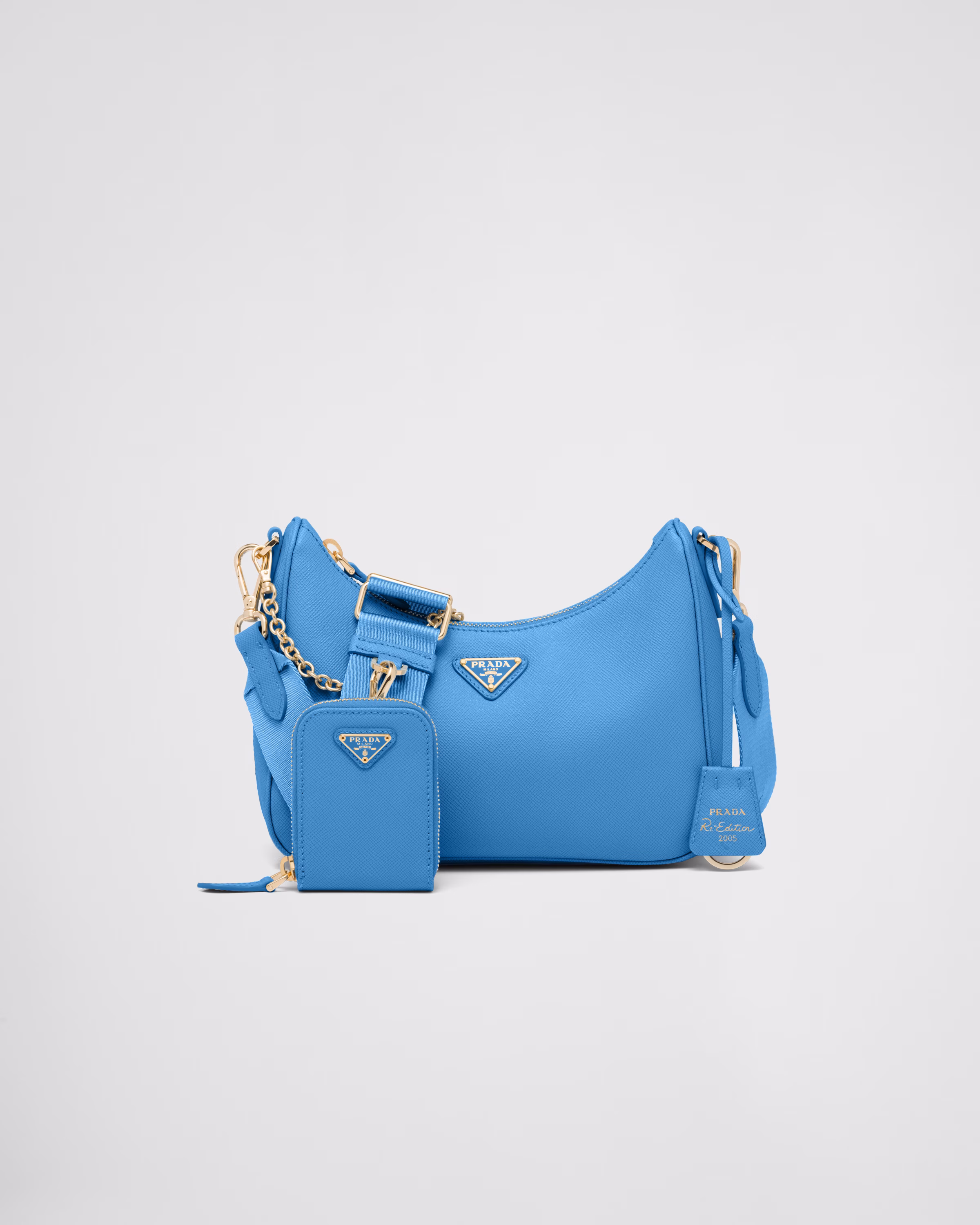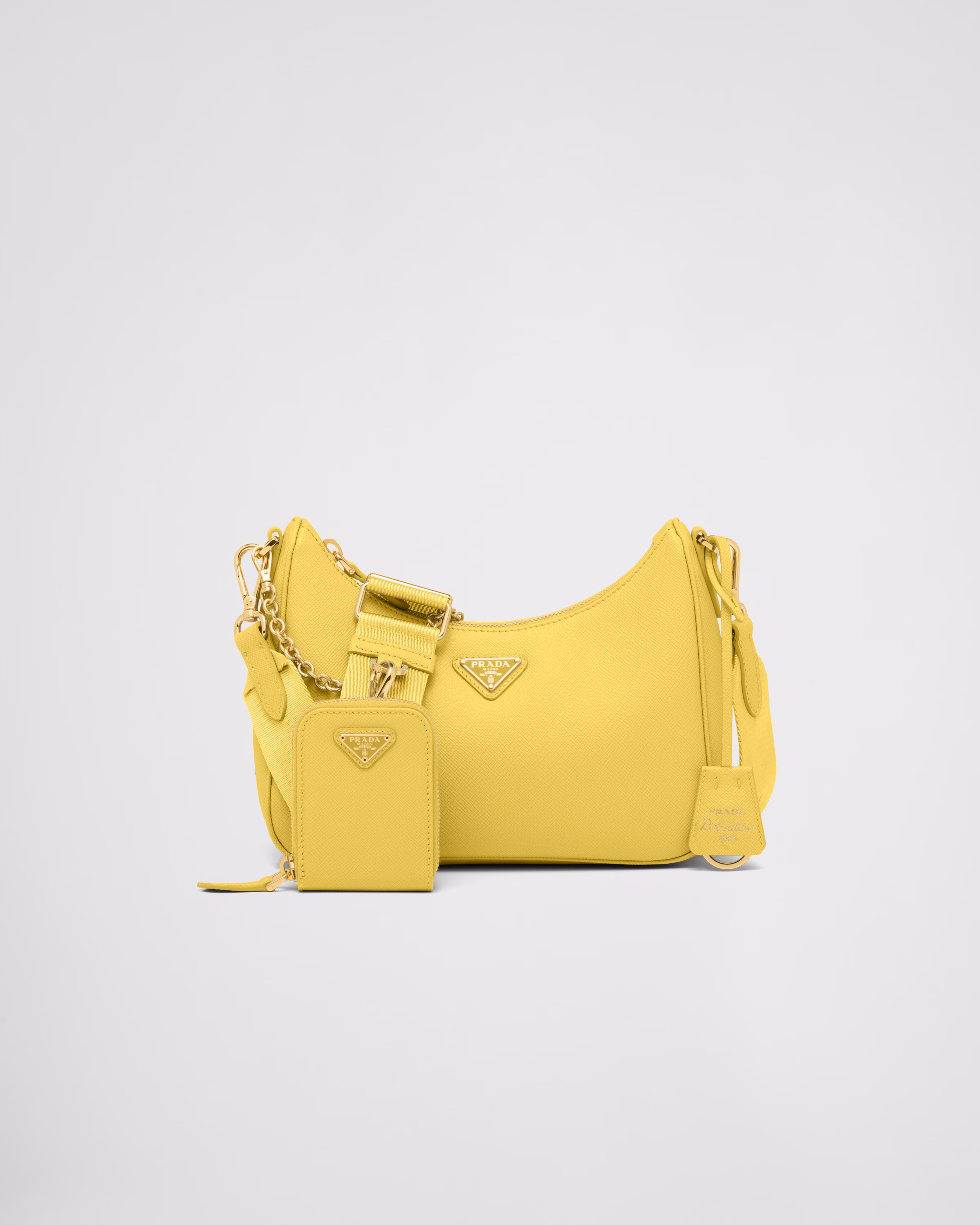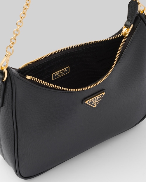 An iconic silhouette with sophisticated details that enhance the design: Prada transforms the classic shoulder bag, reinterpreting it in Saffiano leather with a cross-hatch motif that is a hallmark of the brand. The accessory is completed by a removable leather pouch and Re-Edition keychain, making the bag unique and functional.