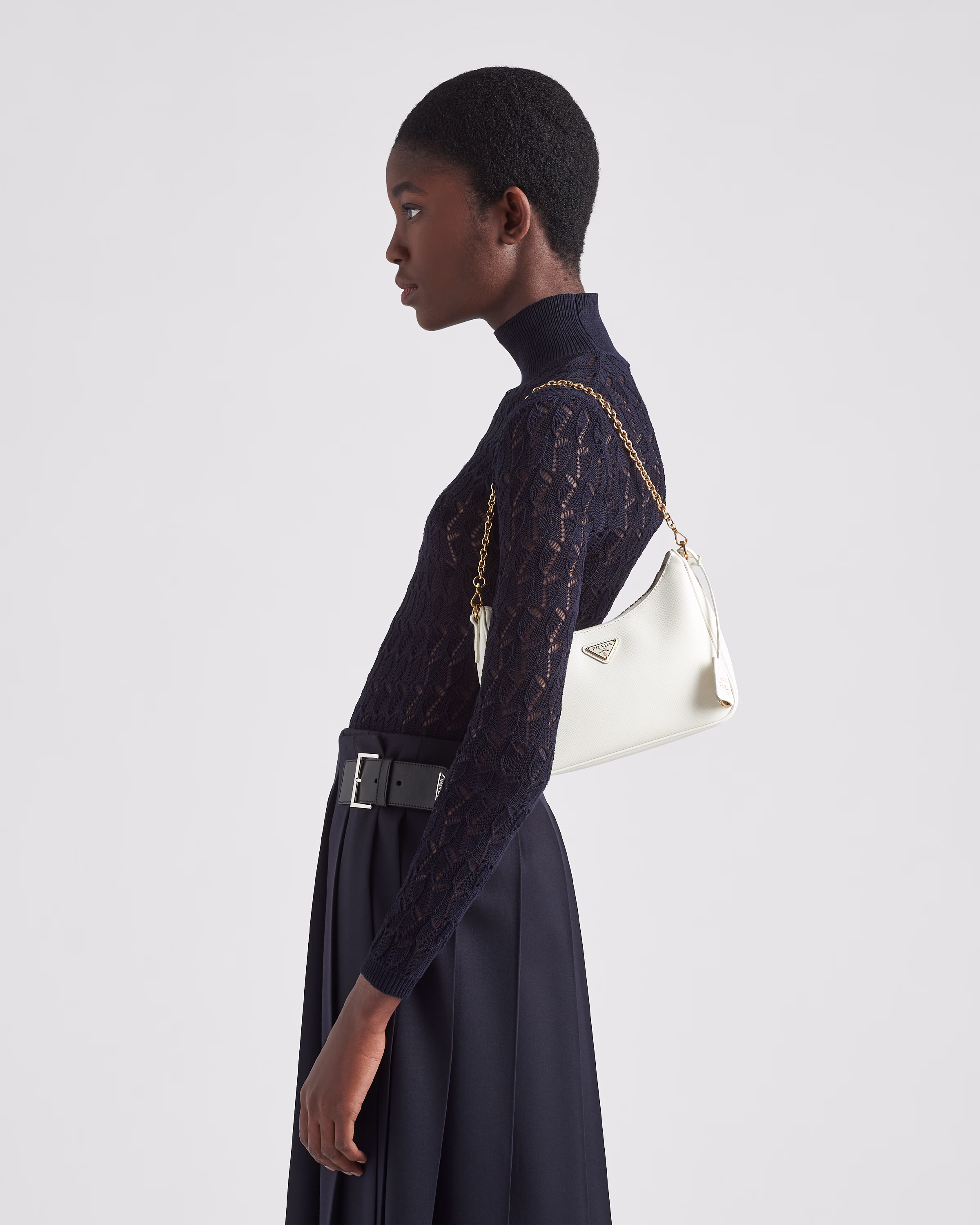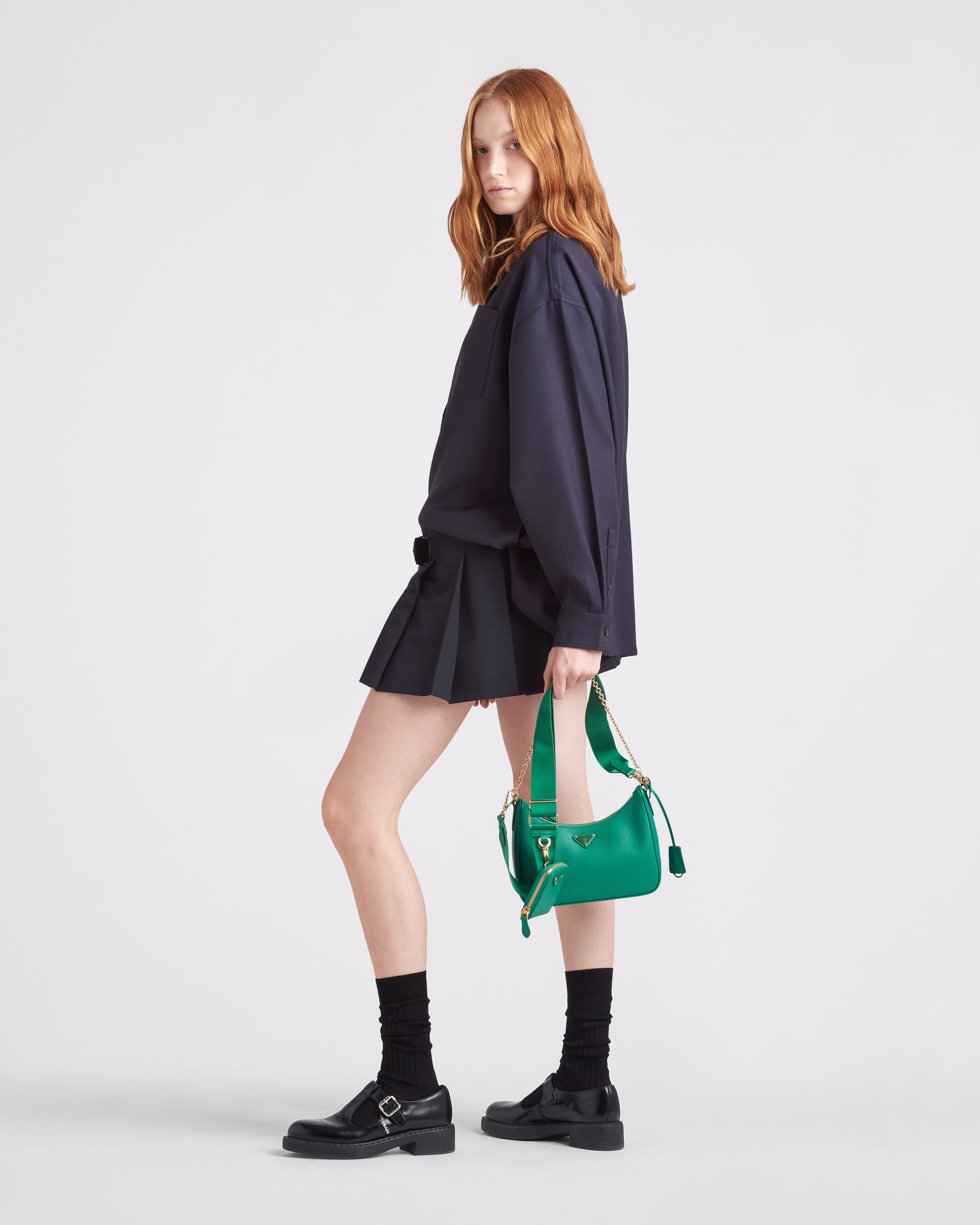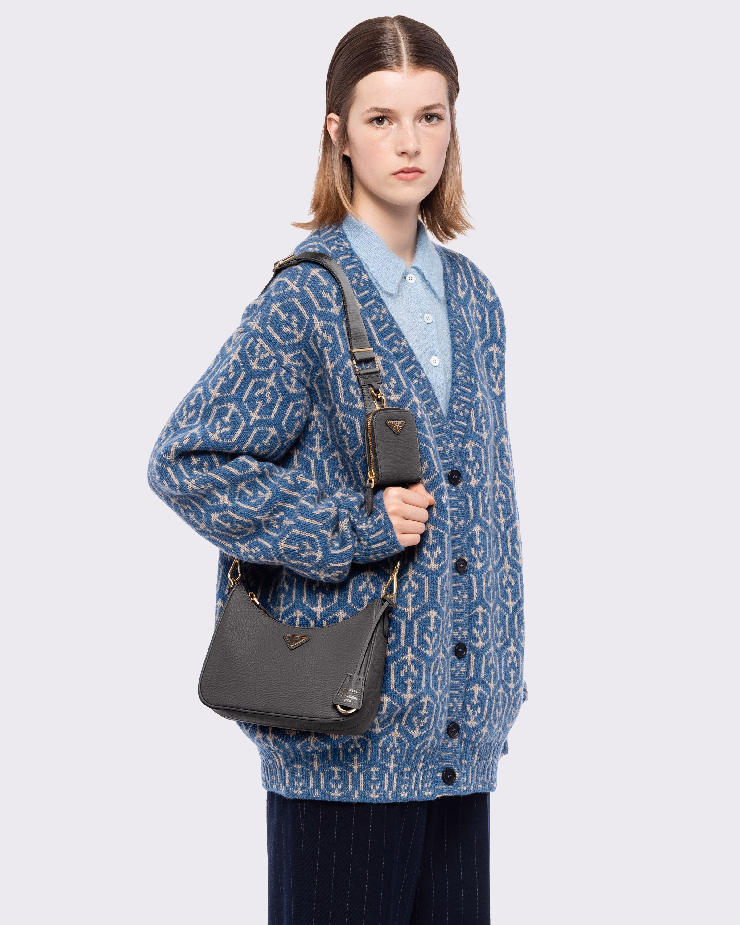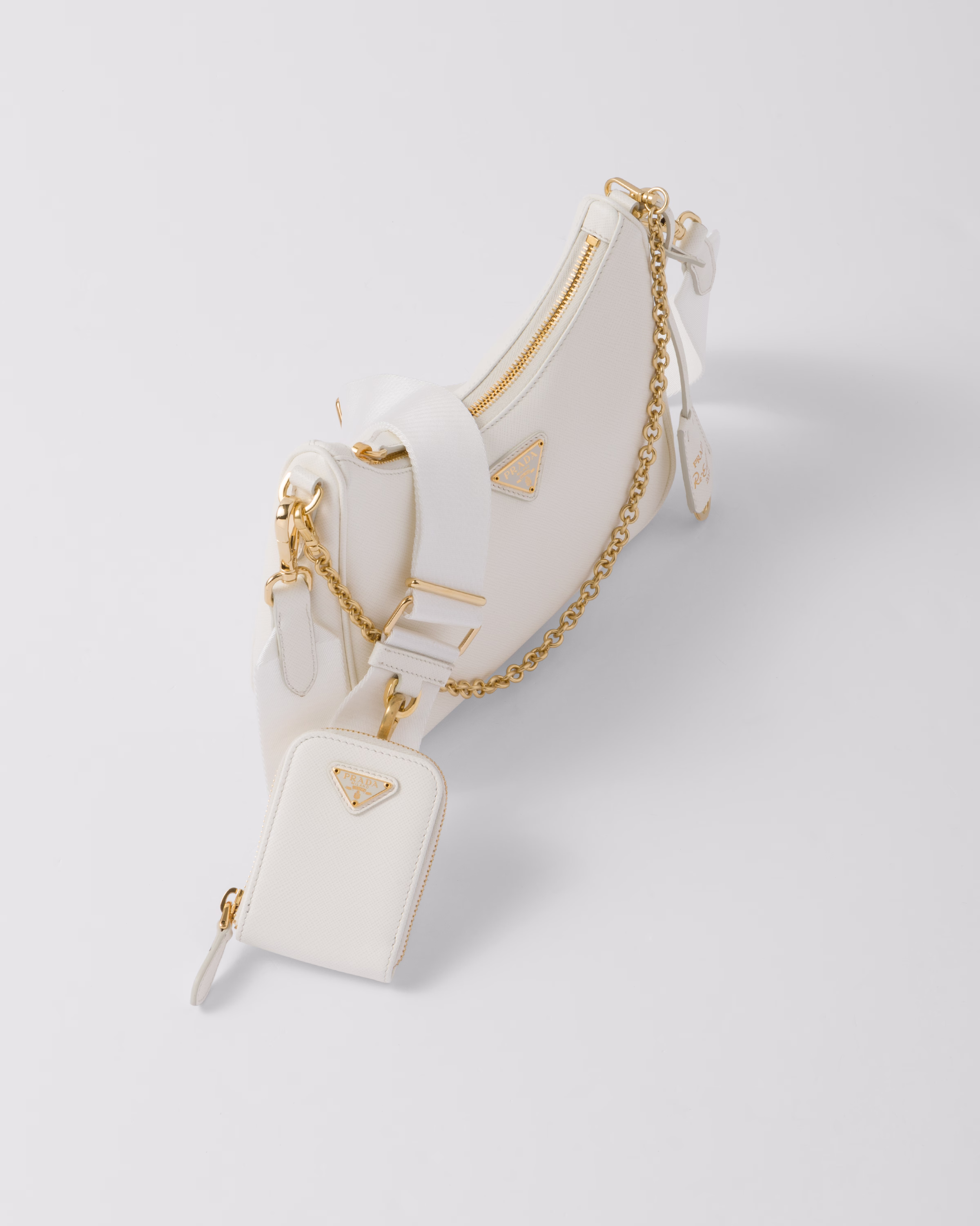 An iconic silhouette with sophisticated details that enhance the design: Prada transforms the classic shoulder bag, reinterpreting it in Saffiano leather with a cross-hatch motif that is a hallmark of the brand. The accessory is completed by a removable leather pouch and Re-Edition keychain, making the bag unique and functional.