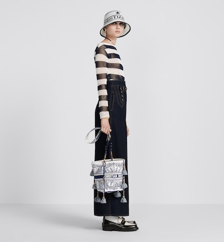 The modern and elegant D-Bubble bucket bag is reinterpreted with the blue multicolor Rêve d'Infini motif by Pietro Ruffo, offering a dreamlike new take on Christian Dior's favorite star symbol and essential House code. The fully embroidered style is enhanced with the 'CHRISTIAN DIOR PARIS' signature on the front, and the handcrafted pompoms add movement. The wide, adjustable and removable embroidered strap allows the small bag to be carried by hand, worn over the shoulder or crossbody.