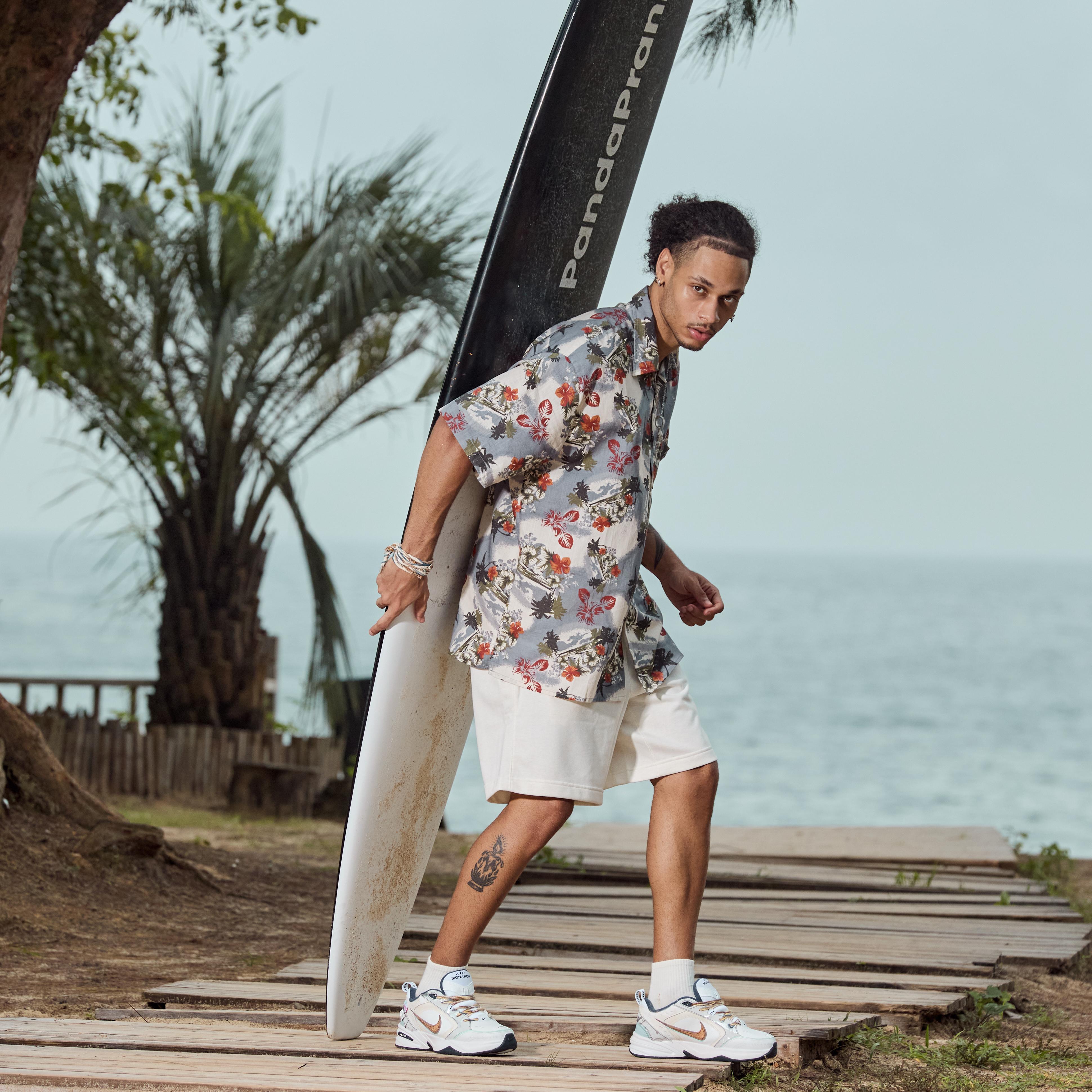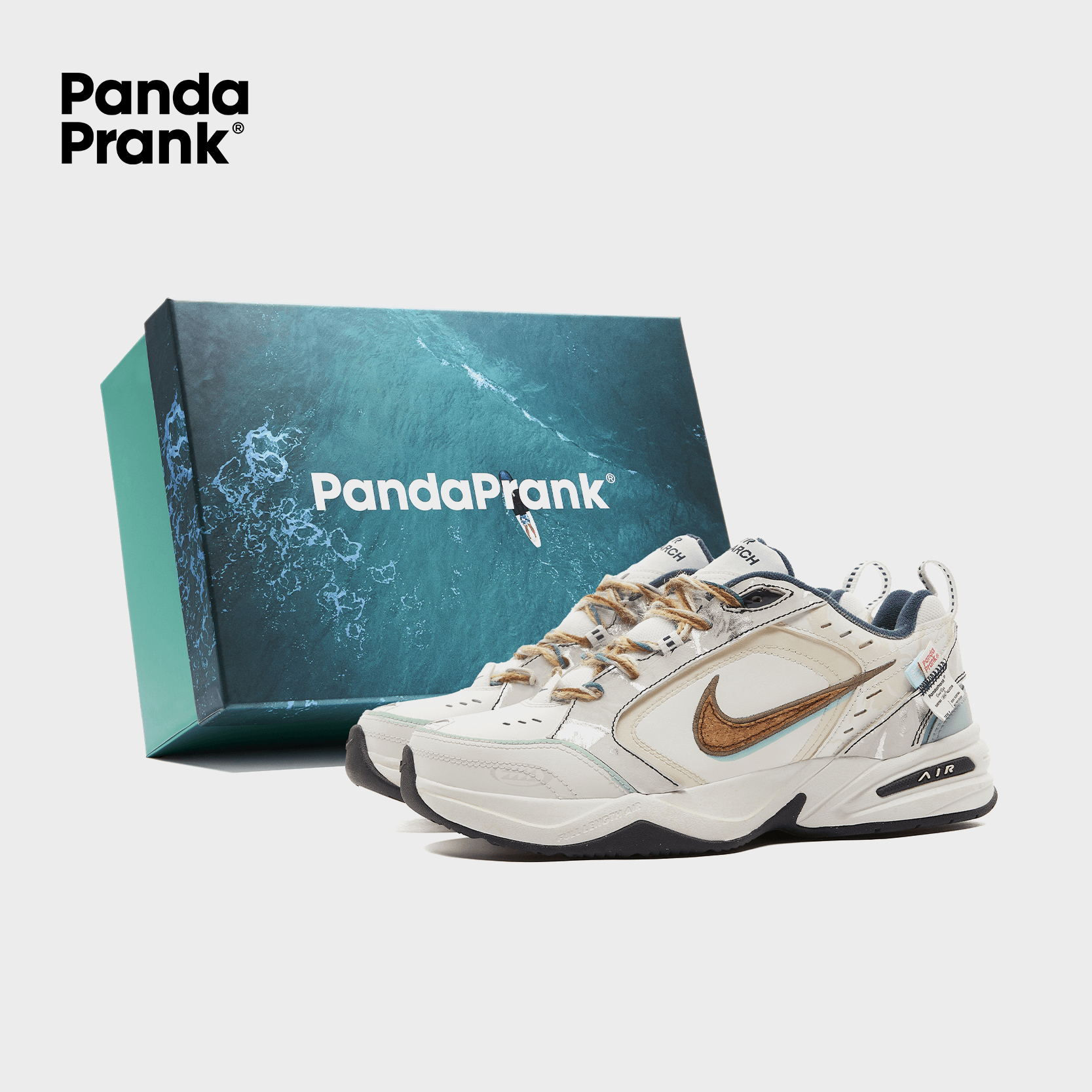 The shoe features a light blue wave tone reminiscent of the sea, with vibrant orange laces echoing the surfboards navigating through the waves.