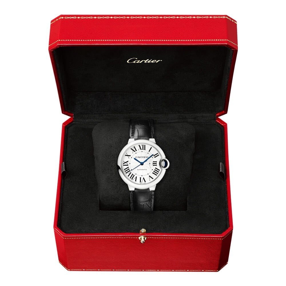 The Ballon Bleu watch collection by Cartier is characterised by its bubble-shaped case inspired by a floating balloon and its blue spinel-adorned crown incorporated into the shape and structure of the case itself. This elegant 36mm Cartier Ballon Bleu watch is crafted from stainless steel and comes fitted on a classic-looking black alligator leather strap with an interchangeable stainless steel folding buckle. The 30-meter water resistant model represents the time on a silvered guilloche opaline dial with crisp black Roman numeral hour markers, an inner minute track and the famous Cartier lettering at the centre of the dial. Blued steel hands are shaped into a sword profile and the entire display is protected by a lens of anti reflective sapphire crystal glass. To promise uncompromised reliability and precision, this Ballon Bleu de Cartier watch is powered by a mechanical Cartier movement, complete with traditional decoration and hand-assembled parts that work harmoniously together for a smooth performance.