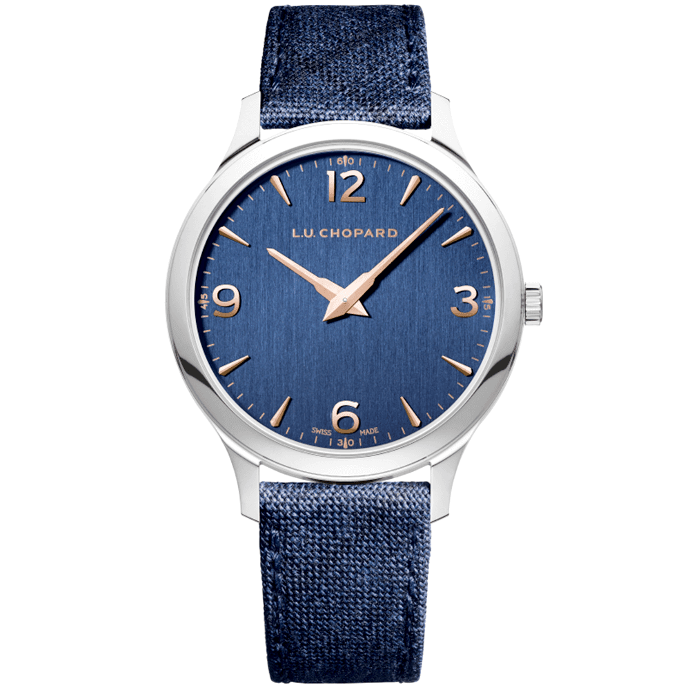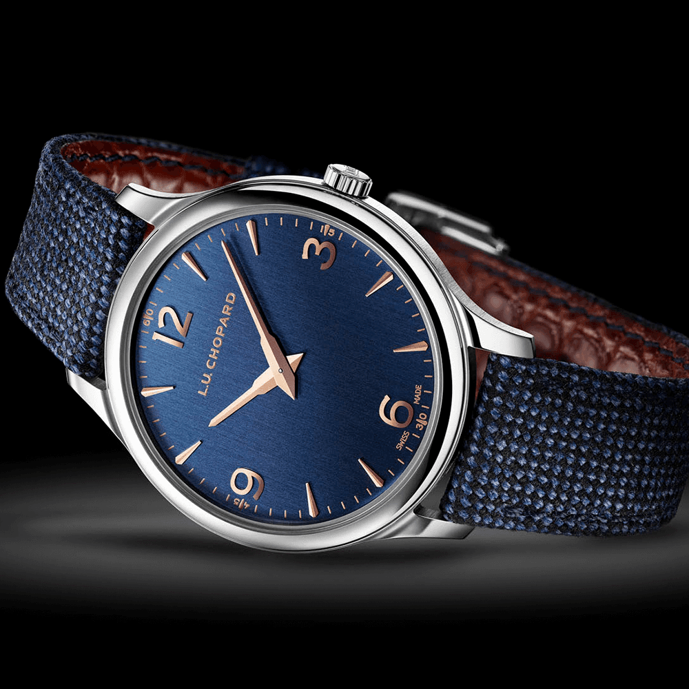 This men’s Chopard L.U.C XP watch is defined by its manufacturer as the perfect blend of modernity and reliability. It is powered via the ultra-thin and independently developed Calibre L.U.C 96.53-L, which is entirely manufactured in Chopard’s workshops in Fleurier. It Features a tungsten micro-rotor as well as two barrel Twin technology. The entire engine can be viewed from the back of the watch case, where a sheet of sapphire crystal glass, integrated with anti-reflective and scratch resistant technology, offers the perfect view into the movement. The front of the watch has been created in the same level of detail. The large rose golden numerals interact with the watch’s sumptuous blue-toned surface, resulting in a watch with immeasurable charm and character. The blue cashmere fabric strap of the men's Chopard L.U.X XP watch is a beautiful finish for a watch with such a powerful presence on the wrist. It keeps the watch looking stylish and eye-catching. Without a doubt, it is the stunning blued appliques on the dial that really bring this design to life, however. Contemporary in its simple dial layout, this Chopard L.U.C XP watch with blue strap is yet another fine example of the French brand’s ability to combine technical prowess with aesthetical beauty in just the right propertions.