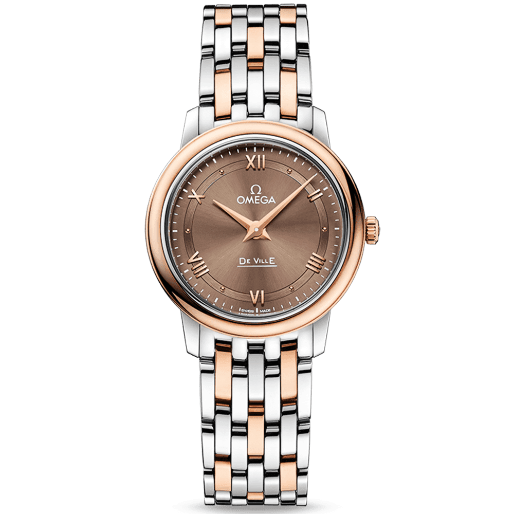 By combining chocolate brown hues, luxurious 18ct rose gold and lustrous stainless steel tones together, this elegant lady’s Omega De Ville Prestige watch imparts a unique and dramatic sense of luxury. The discreetly proportioned 27.4mm diameter steel case is the perfect fit for the slender lady’s wrist and boasts a beautifully curved case and rounded bezel crafted from 18ct rose gold. A stunning lacquered sun-brushed chestnut dial is adorned with polished Roman numeral hour markers and cabochons. These cabochons frame a set of 18ct rose gold hands. This lady’s Omega De Ville Prestige watch is topped with an anti reflective and scratch resistant sapphire crystal glass lens and is powered by a reliable Swiss-made quartz movement for guaranteeing round-the-clock precision. The De Ville Prestige watch is primed for the on-the-go lady with a legible, simple dial, compact case and jewellery-like finish on its 18ct rose gold steel bi-colour link bracelet, securing with a refined Omega-engraved folding clasp.