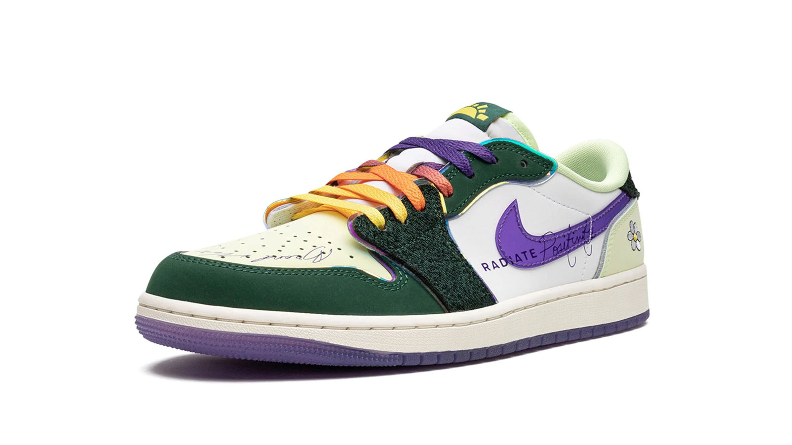 The Air Jordan 1 Low OG ��Doernbecher�� is a special colorway of the classic basketball shoe from Nike��s Doernbecher Freestyle collaboration with the Doernbecher Children��s Hospital of Portland, Oregon. Designed by patient Raddihi Mahajan, this creative look for the Jordan 1 Low OG features an eye-catching color scheme with unique branding elements. Specifically, the shoe has a Barely Volt perforated leather toe and heel. Hairy Gorge Green suede is found on the forefoot and on the leather toe cap and upper eyelet panel. Court Purple leather Swoosh branding appears on the sides. Raddihi adds her signature touches to the shoe with her own branding on toe, mid-panel, tongue, and insole.�