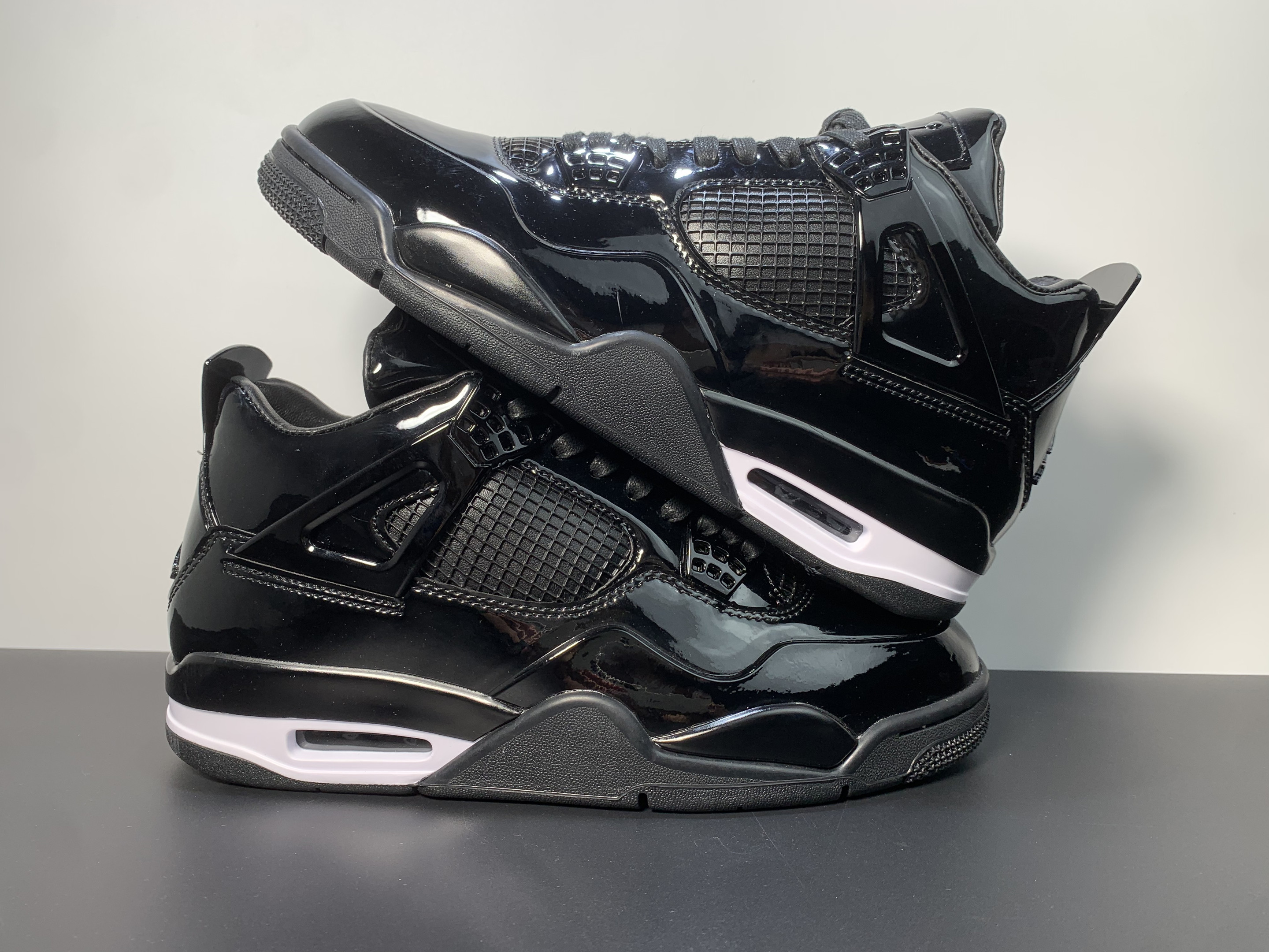 - Design: The 11Lab4 "Black" features a full patent leather upper, which is a signature style taken from the Air Jordan 11. The glossy black finish creates a high-end, sophisticated appearance, while maintaining the classic Jordan 4 silhouette.