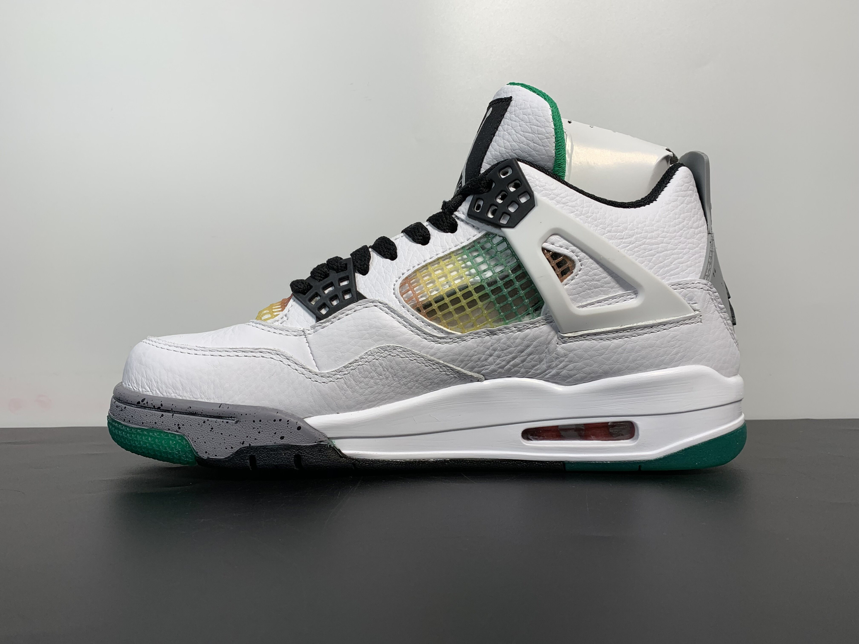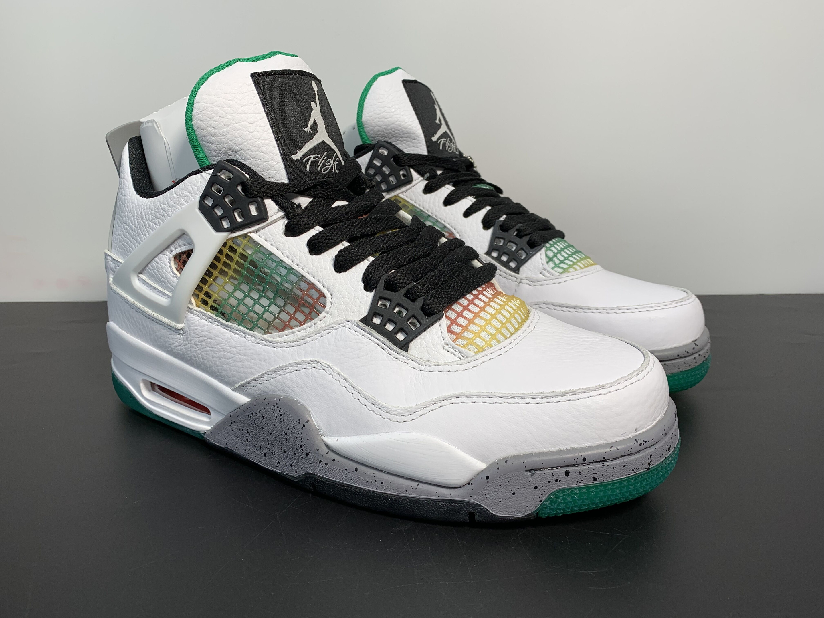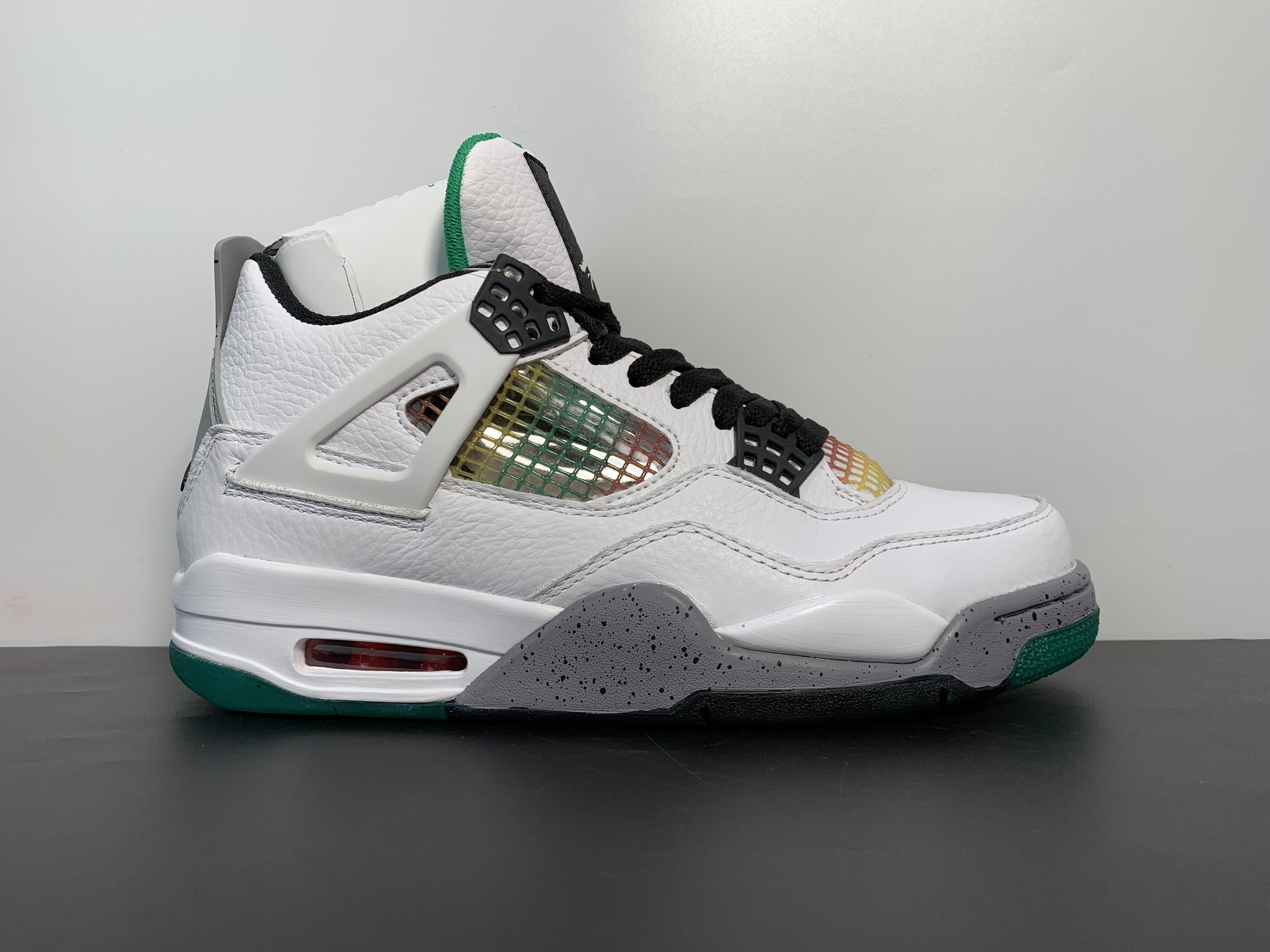 The Air Jordan 4 "Rasta" is a vibrant and eye-catching release inspired by Jamaican culture. Featuring a unique white, red, green, and yellow colorway with gradient and splatter details, this sneaker captures the energetic and colorful essence of the island. It's designed with a mix of premium materials for both style and comfort.