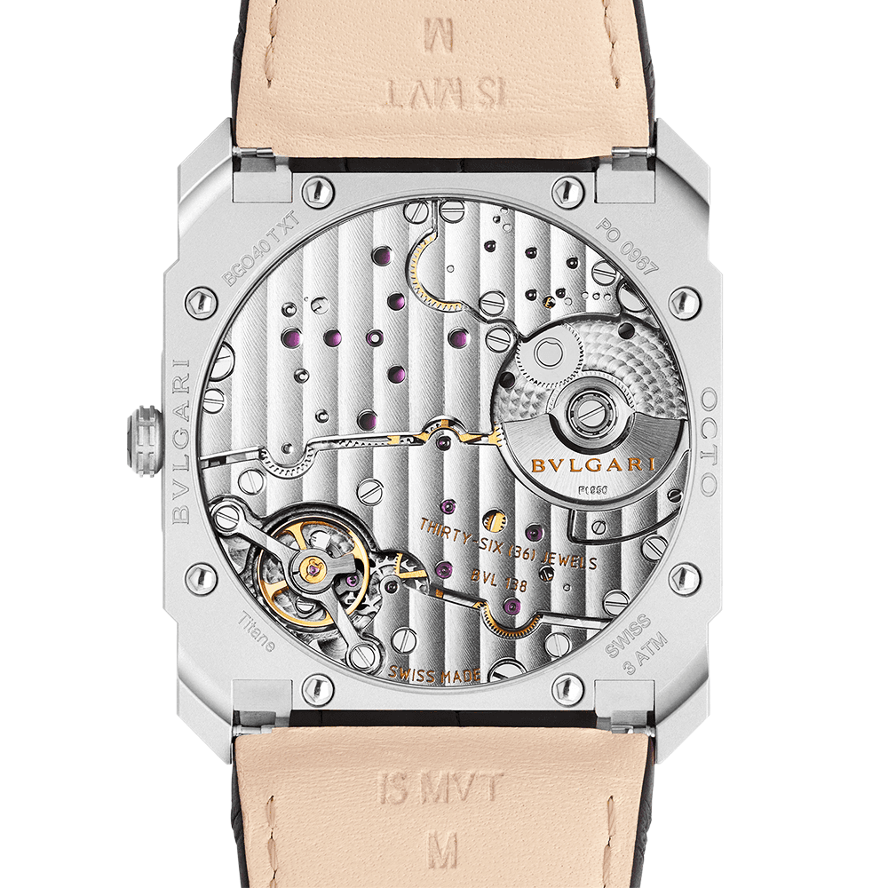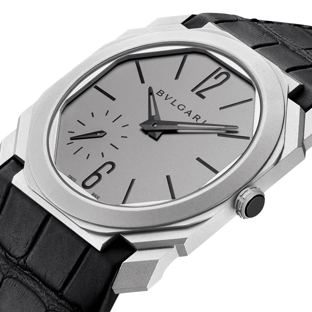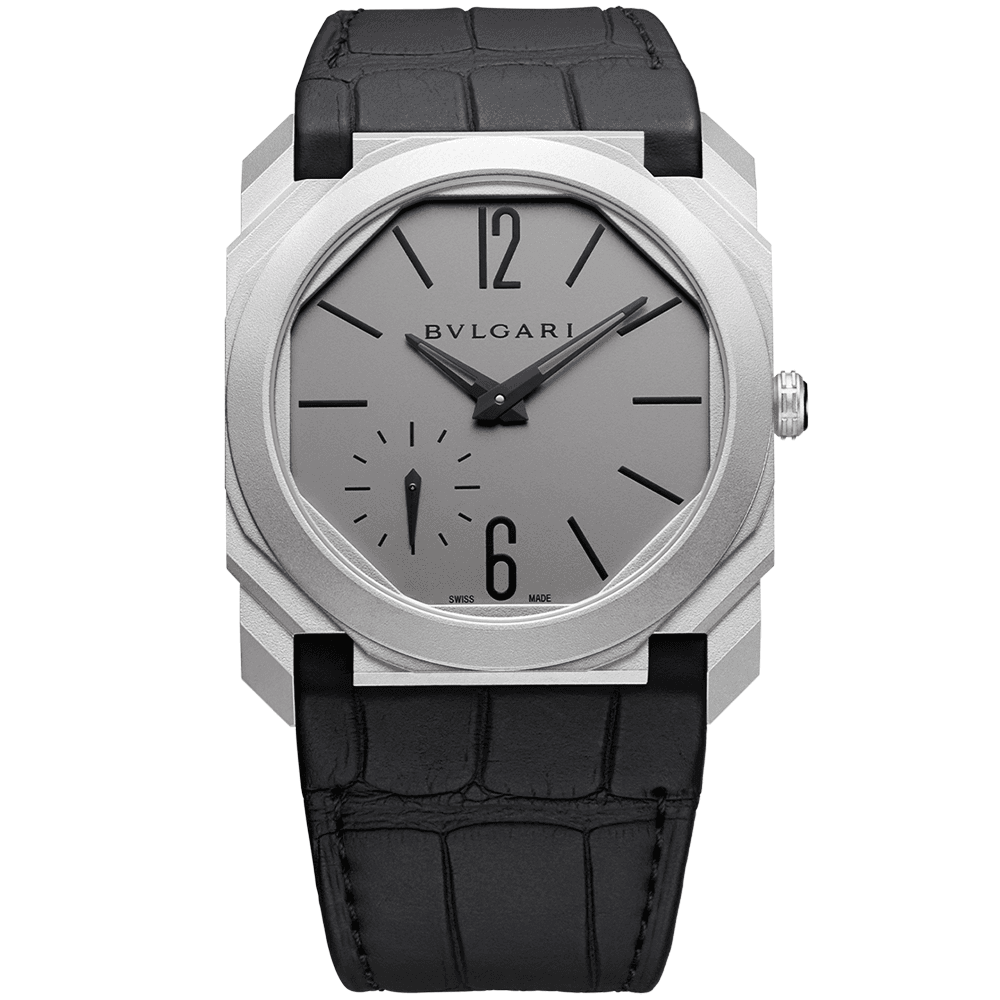 The Octo Finissimo watch is famous for its ultra-thin movement. Bvlgari began putting itself on the map or ultra-thin movements and watches with designs like the Octo Finissimo Chronograph, Tourbillon and Automatic. This titanium model offers a modern and lightweight feel on the wrist. Its matching titanium case Features crisp black stick markers and hands. The 12 and 6 o’clock locations, however, are characterised by Arabic numerals. A small second sub-dial resides at 7 o’clock adding to the dial’s unique layout. This 40mm men’s Bvlgari Octo Finissimo watch is powered by the BVL 138 - Finissimo calibre decorated by hand with ctes de Genève, chamfering and perlage finishing. Of course, this discreet 5-15mm thick movement can be admired through a transparent caseback feature, crafted from scratch resistant and anti reflective sapphire crystal glass. The same material is also used on the front of the watch, protecting the dial from dust, moisture, heat and light damage. This men’s Bvlgari Octo Finissimo watch provides a 55-hour power reserve and comes completed on a stylish black alligator strap and titanium ardillon buckle. It also Features a crown set in scratch-resistant ceramic.