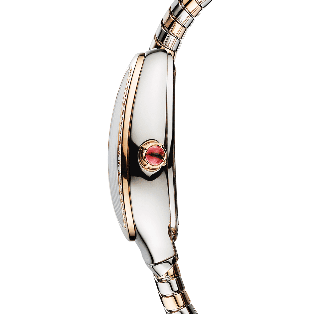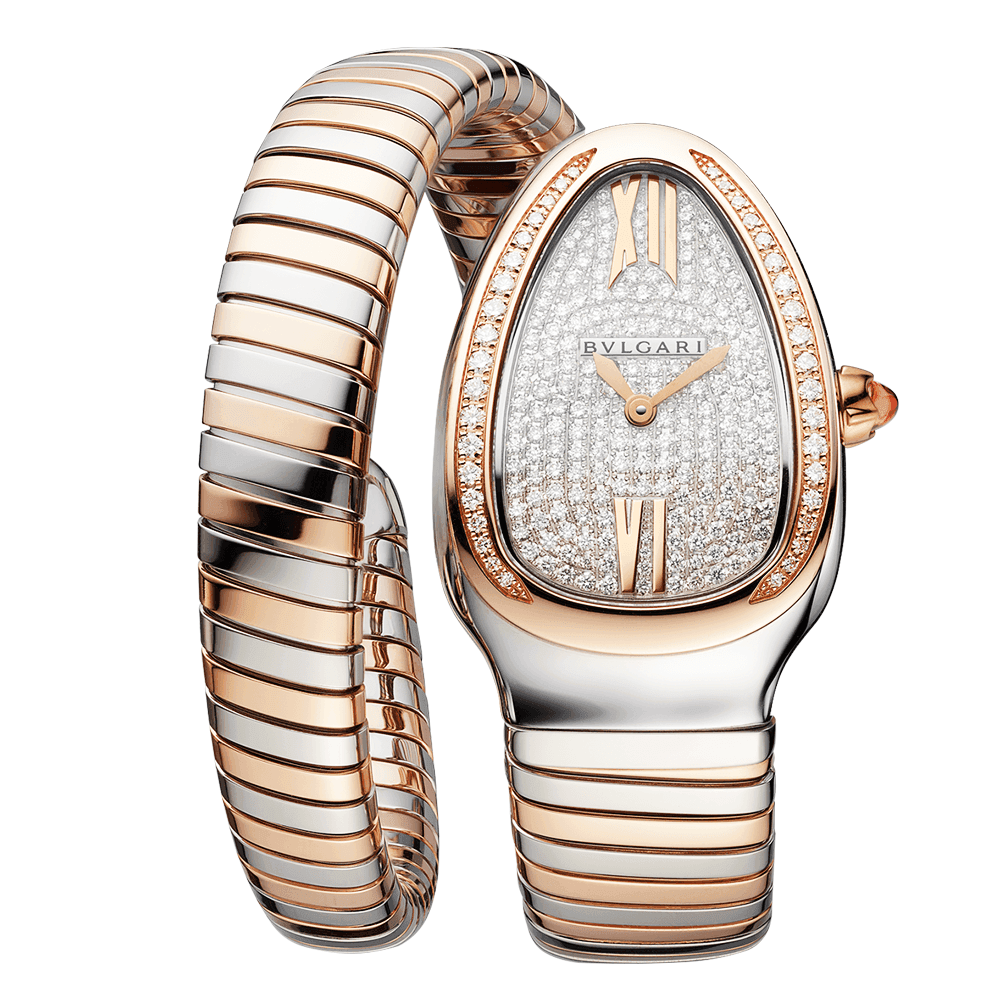 In the 1940’s, the first Bvlgari Serpenti watch was crafted from warm yellow golden tones which made up its flexible body, coiling around the lady’s wrist. Today the collection is still going strong, with various designs and finishes to choose from. This exquisite Bvlgari Serpenti Turbogas watch wraps effortlessly around the wrist with a pink gold and stainless steel bi-colour bracelet. Each link has been meticulously crafted in-house by Bvlgari’s expert artisans. This stunning timepiece Features a dazzling pave set dial set with round brilliant cut diamonds. The 30-meter water resistant watch is powered by an ultra-accurate Swiss-made quartz movement for ultimate reliability. Lastly, the 18ct pink gold crown at 3 o’clock on the bezel has been adorned with a single cabochon-cut pink rubellite stone for adding a subtle touch of sparkle to the wrist.