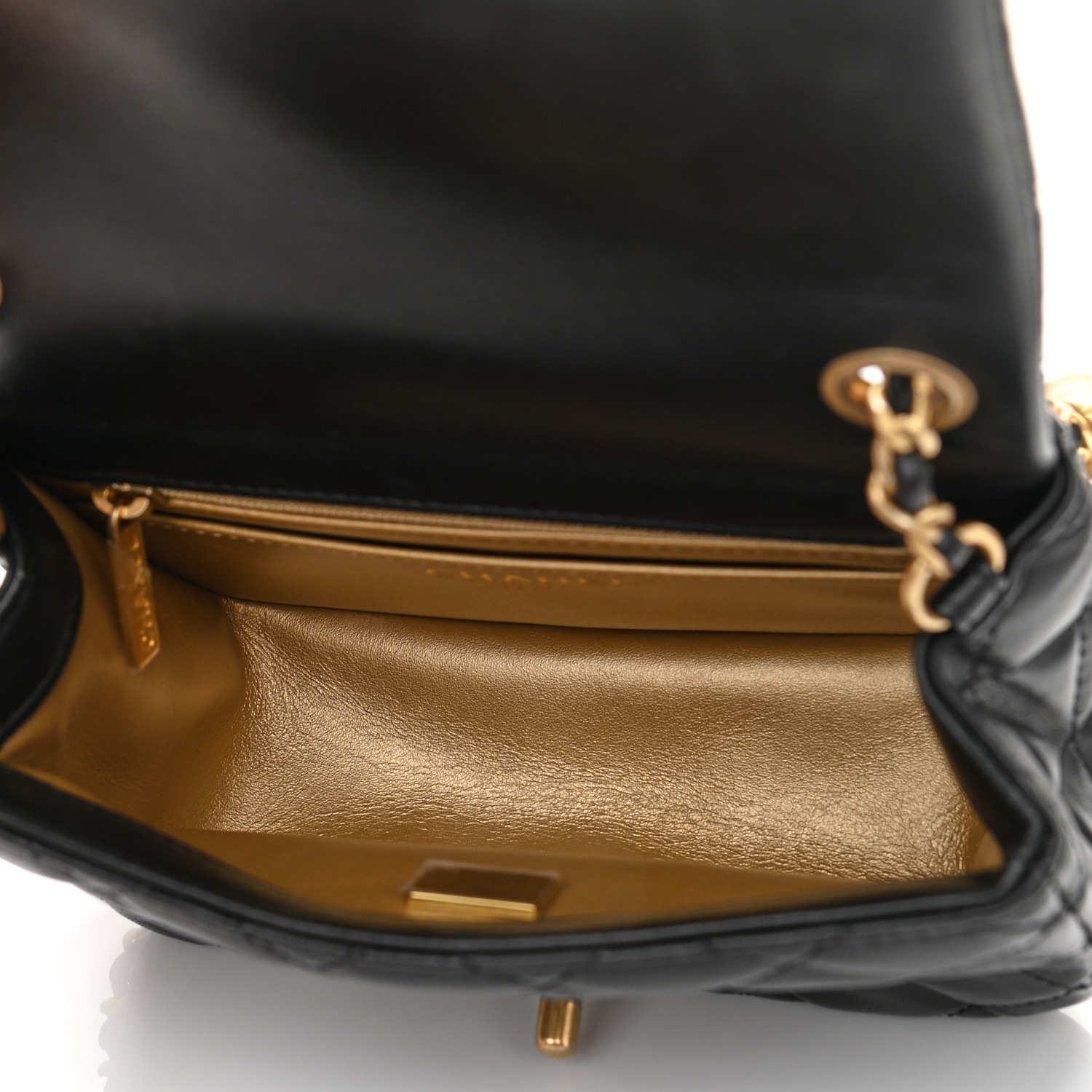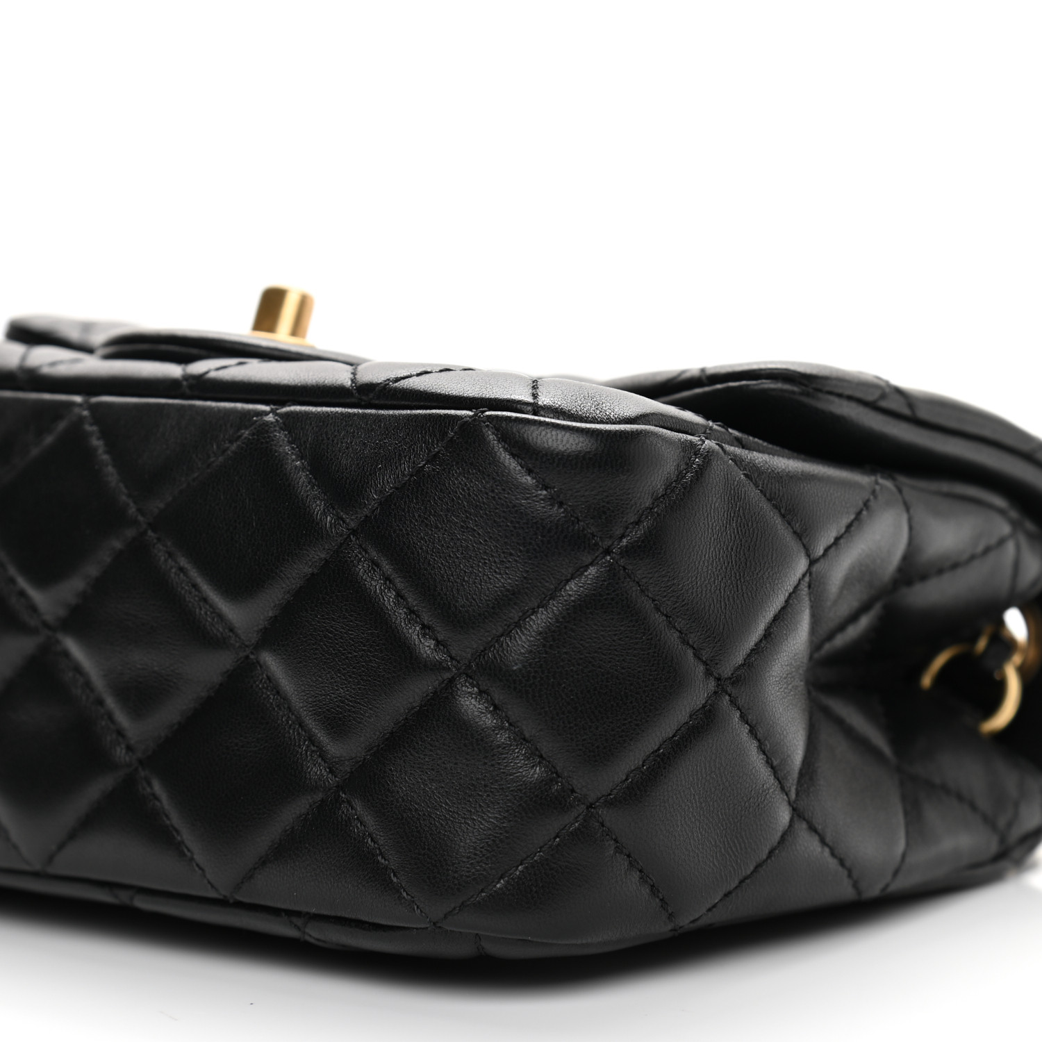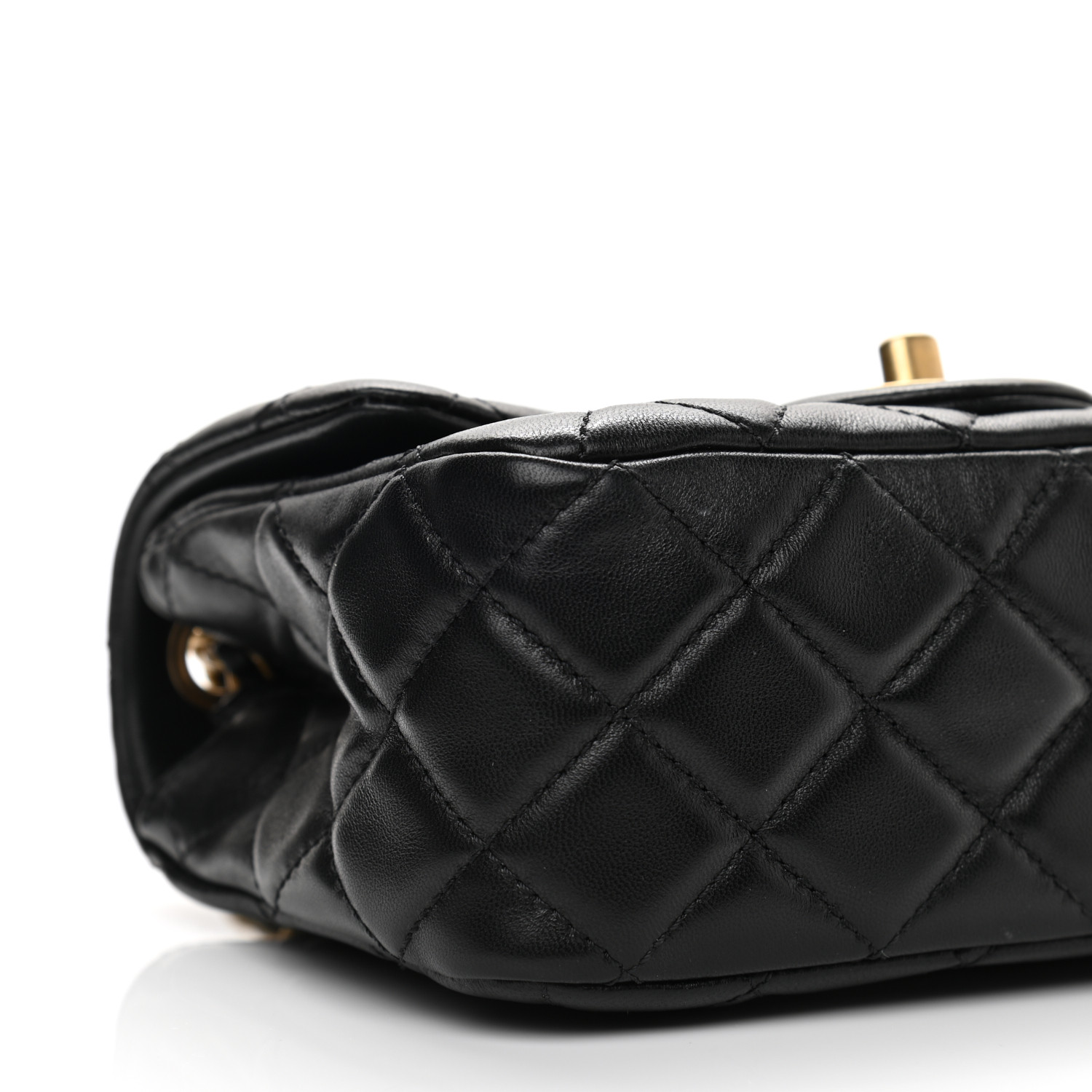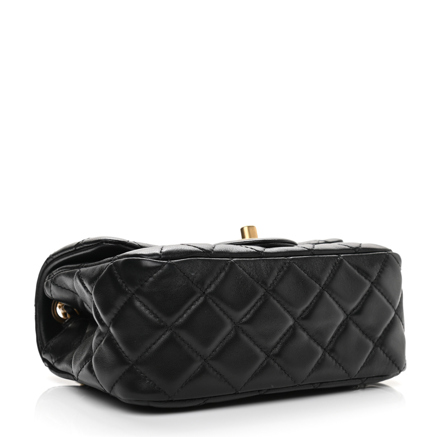 This is an authentic CC Lambskin Quilted CC Pearl Crush Mini Flap in Black. The chic mini crossbody classic is crafted of soft quilted lambskin leather in black. The bag features an aged gold chain link leather threaded shoulder strap and a facing classic aged gold CC turn lock. This opens the flap to a gold leather interior with zipper and patch pockets.
