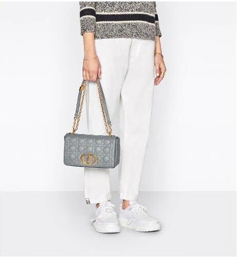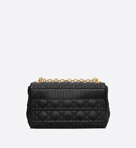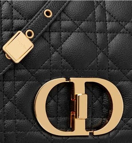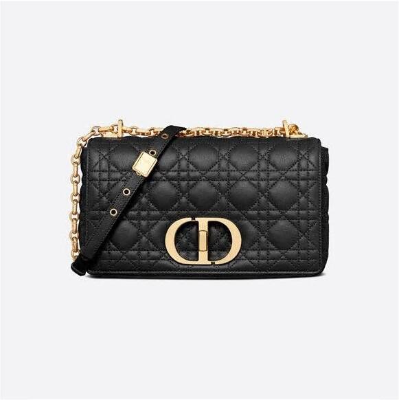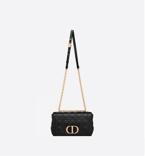 The Dior Caro bag combines modernity with timeless elegance. The design is crafted in black calfskin with Cannage stitching. The supple bag features a flap adorned with an antique gold-finish metal 'CD' twist clasp, inspired by the seal of a Christian Dior perfume bottle. The detachable chain shoulder strap with 'CD' signature links allows the medium bag to be carried by hand or worn over the shoulder and may be replaced by one of the House's wide embroidered straps for day or evening attire.