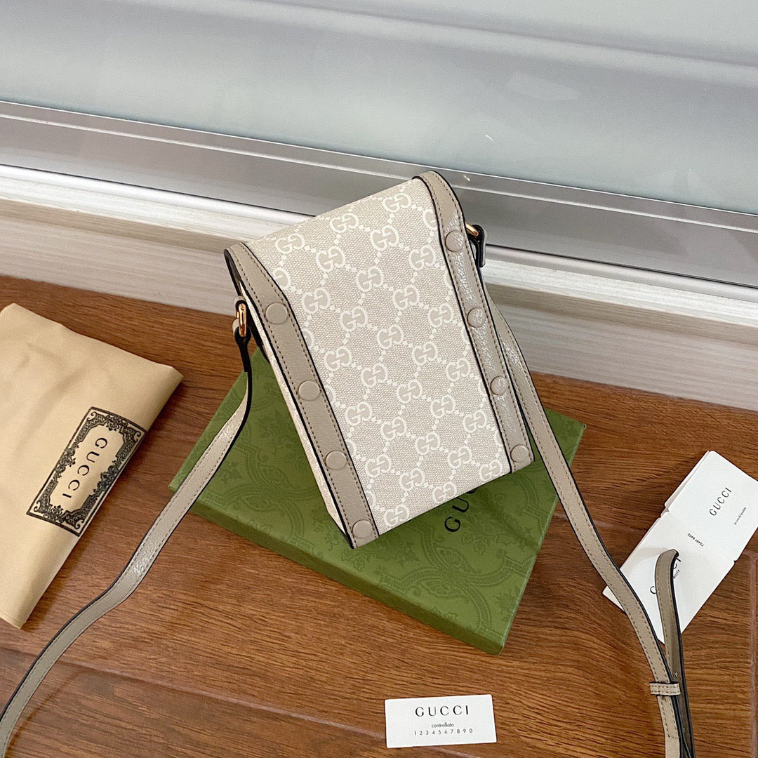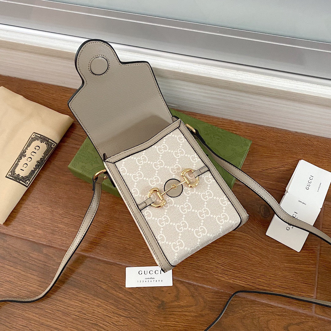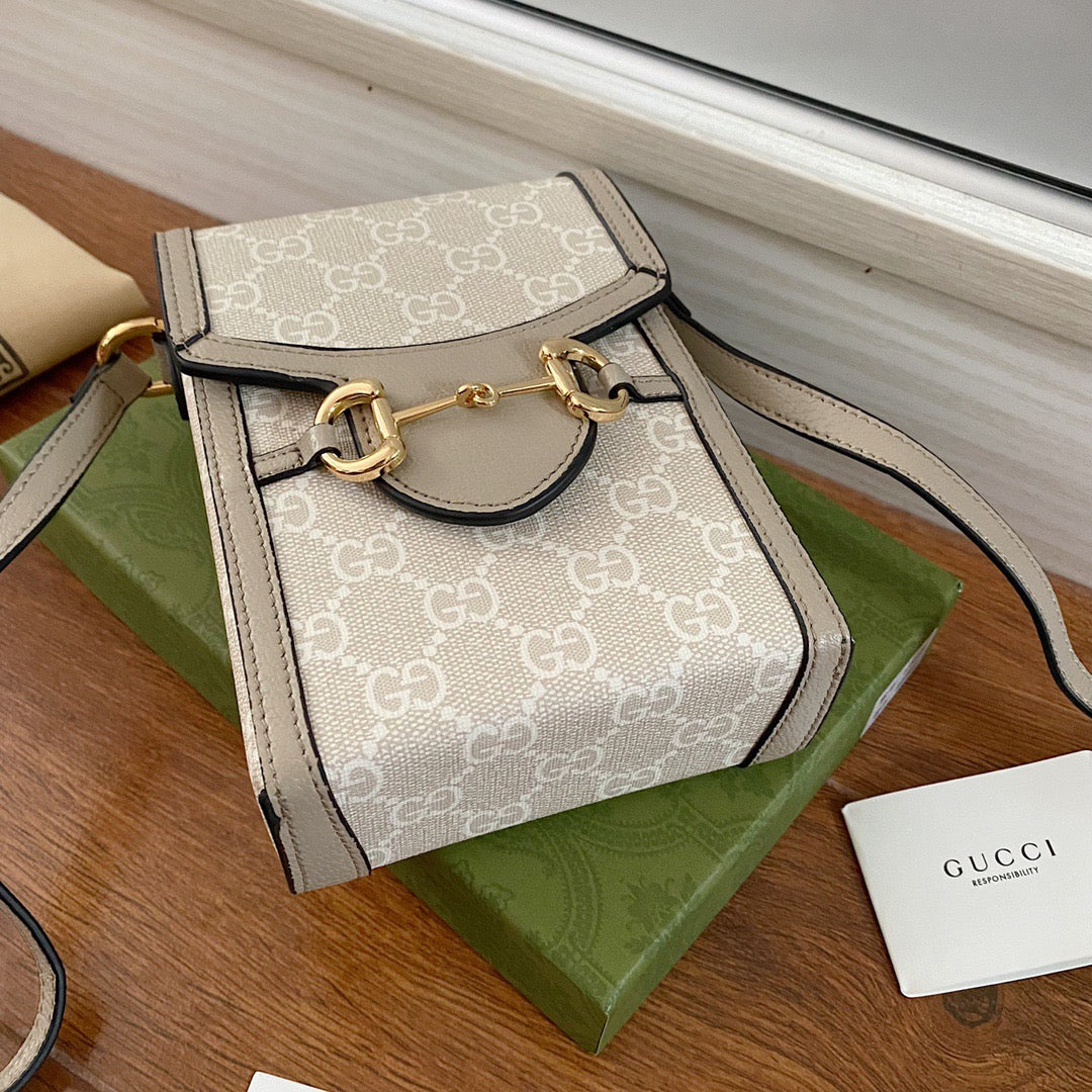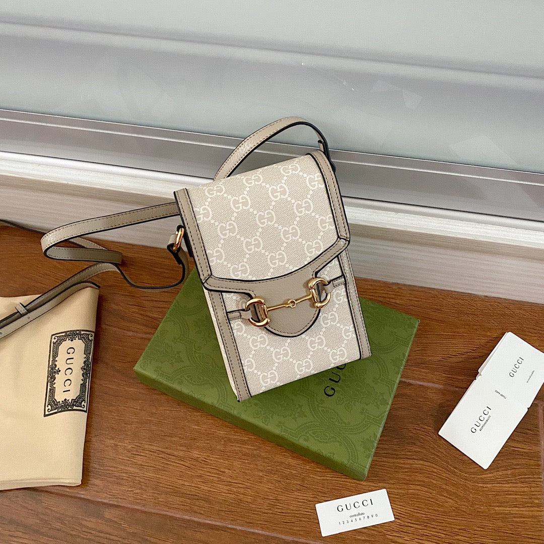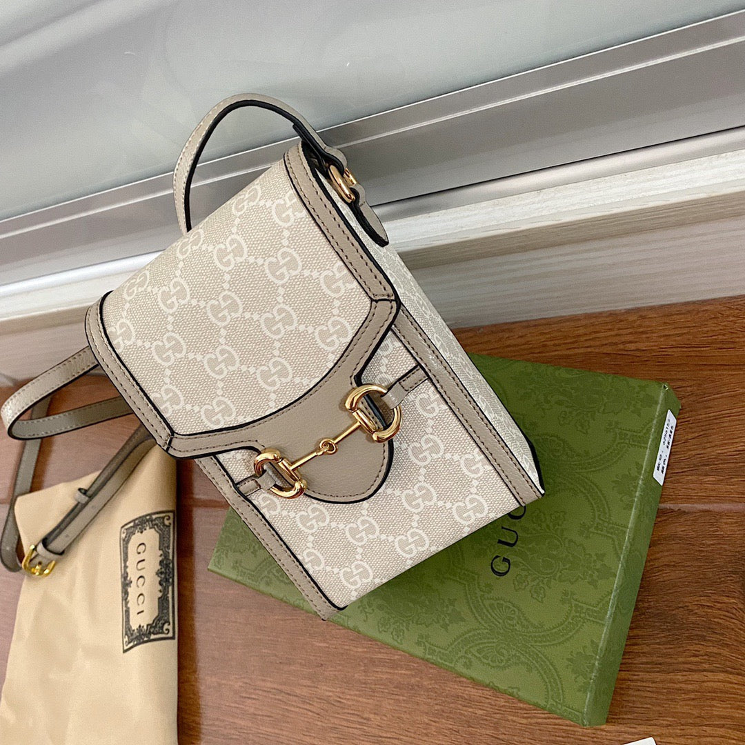 The world of Gc Horsebit 1955 evolves with the introduction of a mini bag in beige and ebony GG Supreme canvas. Inspired by archival designs. the accessory unifies the original details first introduced over six decades ago with a modern spirit. highlighting the Horsebit.