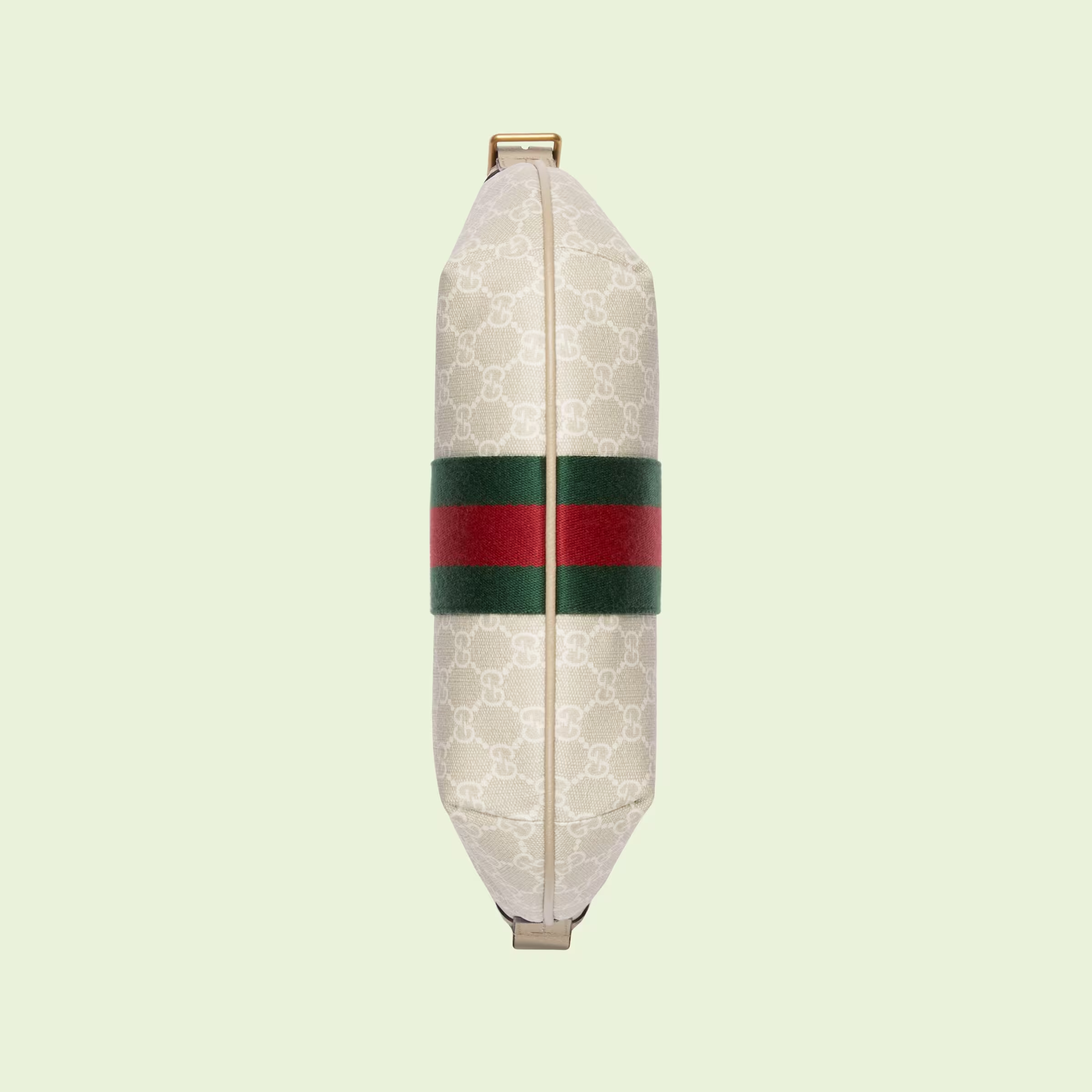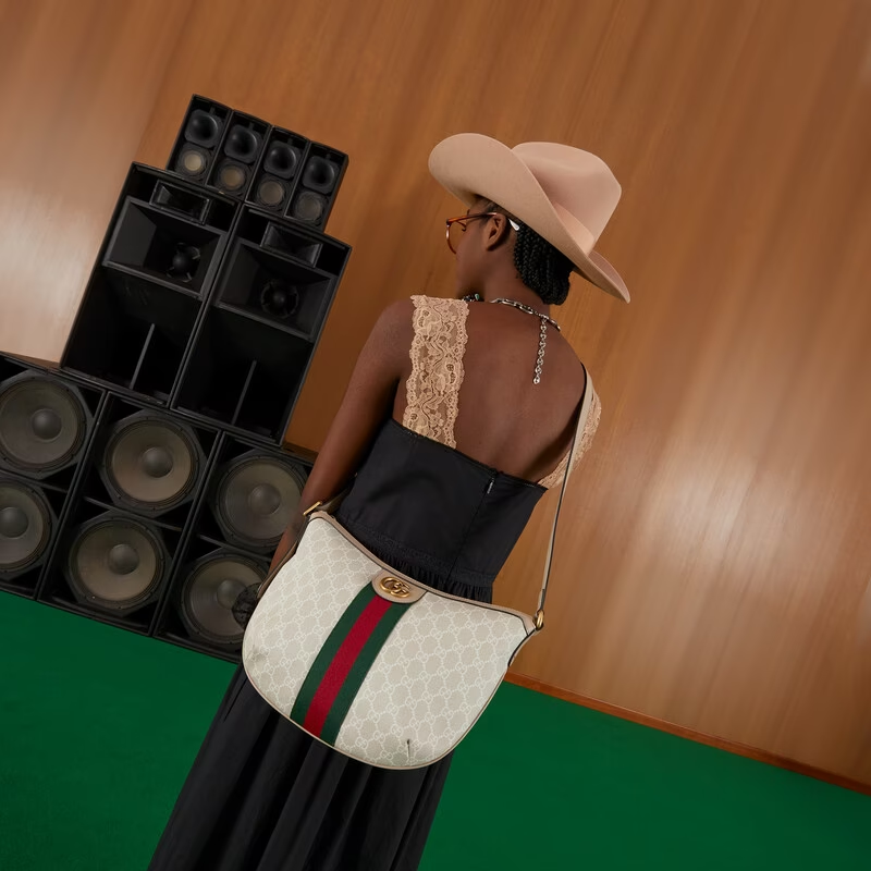 An archival design from the 1930s inspired the GG Supreme canvas. now one of the House's most emblematic materials. Traditionally presented in beige and ebony. it appears here in a beige and white combination. an ode to timeless pieces and everlasting design. An oatmeal leather trim completes this Ophidia shoulder bag. while the green and red Web detail adds a subtle reference to the House archives.