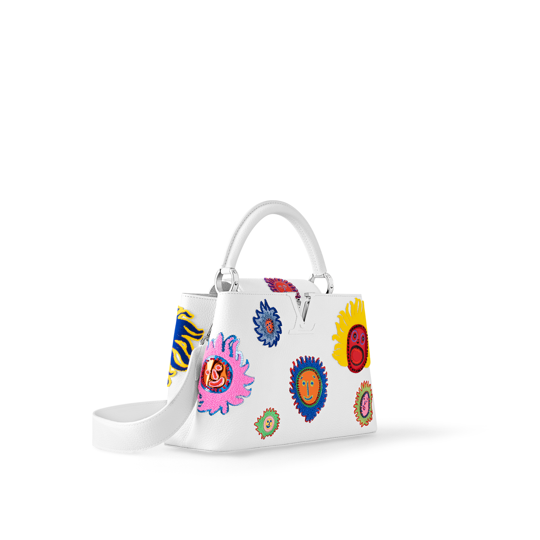 This colorful, creative version of the LVxYK Capucines MM was dreamed up for the exclusive new Louis Vuitton x Yayoi Kusama collection. In 2009, the venerated Japanese artist began a series of paintings entitled “My Eternal Soul” featuring surrealistic faces and organic shapes. For this elegant handbag, her whimsical images are printed and embroidered on lustrous white Taurillon leather, turning a practical accessory into an artistic keepsake.