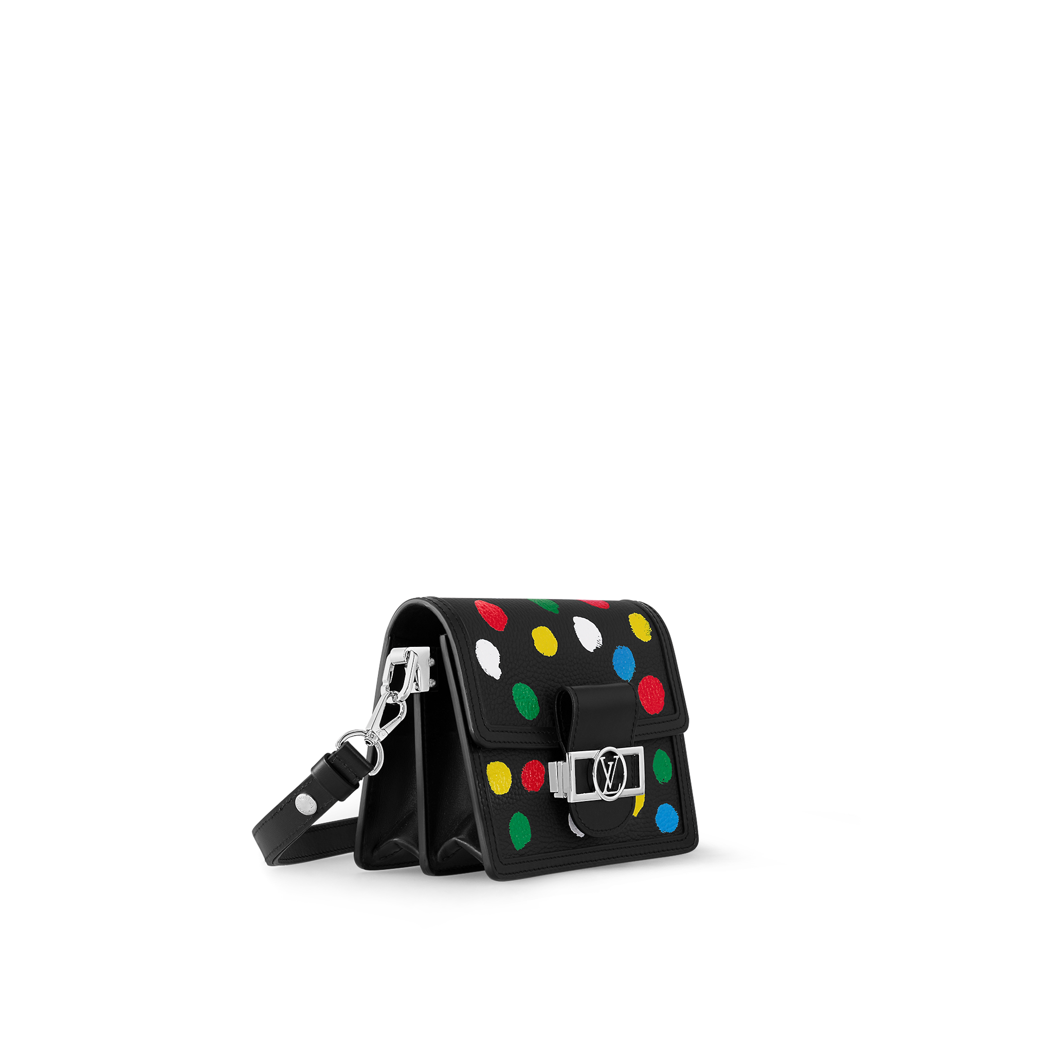 Created for the new Louis Vuitton x Yayoi Kusama collaboration, the LVxYK Dauphine Mini comes bedecked with a constellation of dots, a recurring theme in the acclaimed Japanese artist’s work. Styled after the colorful dots that Kusama hand-painted on a trunk a decade ago after her first partnership with the House, the pattern is screen-printed on black Taurillon leather using a sophisticated technique that produces a 3D relief effect.
