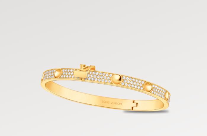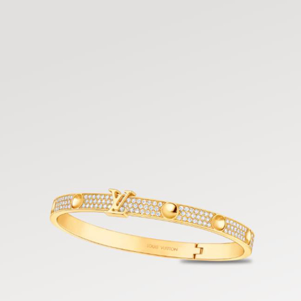 This edition of the Empreinte bangle is cast from 18-kt yellow gold, enriched with fiery diamond pavé. Trunk-nail imprints give it a modern allure, while subtly referencing House history. The LV Initials serve as the clasp of this sparkling hinged bracelet, which can be stacked with other pieces for a look that is both luxe and relaxed.