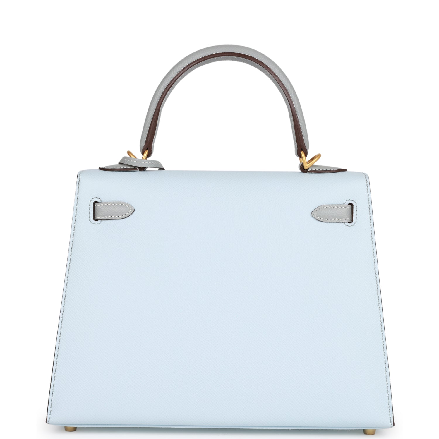 This Special Order Kelly. in the Sellier style. is in Bleu Brume and Bleu Glacier epsom leather with brushed gold hardware and has contrast stitching. two straps with front toggle closure. clochette with lock and two keys. single rolled handle and removable shoulder strap.