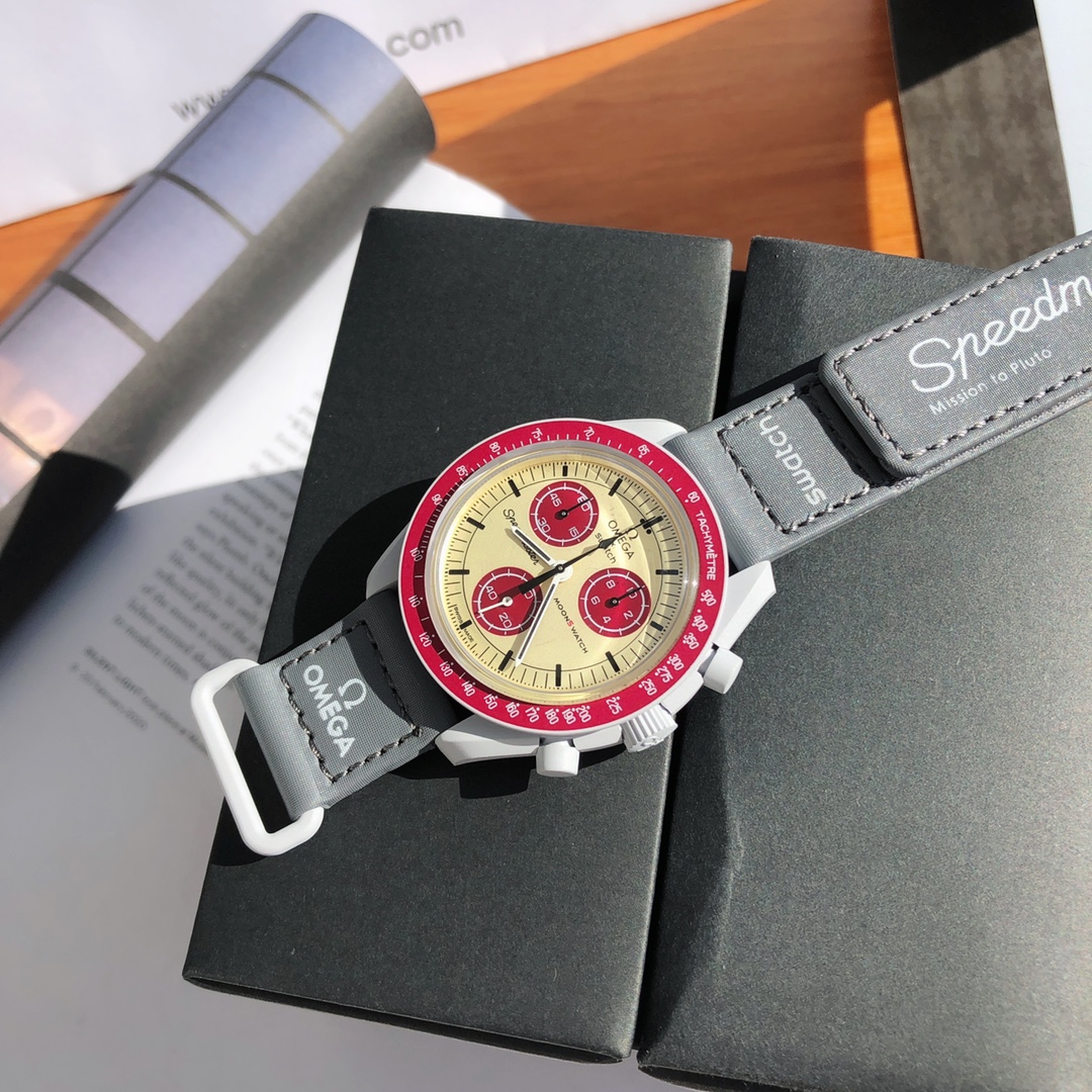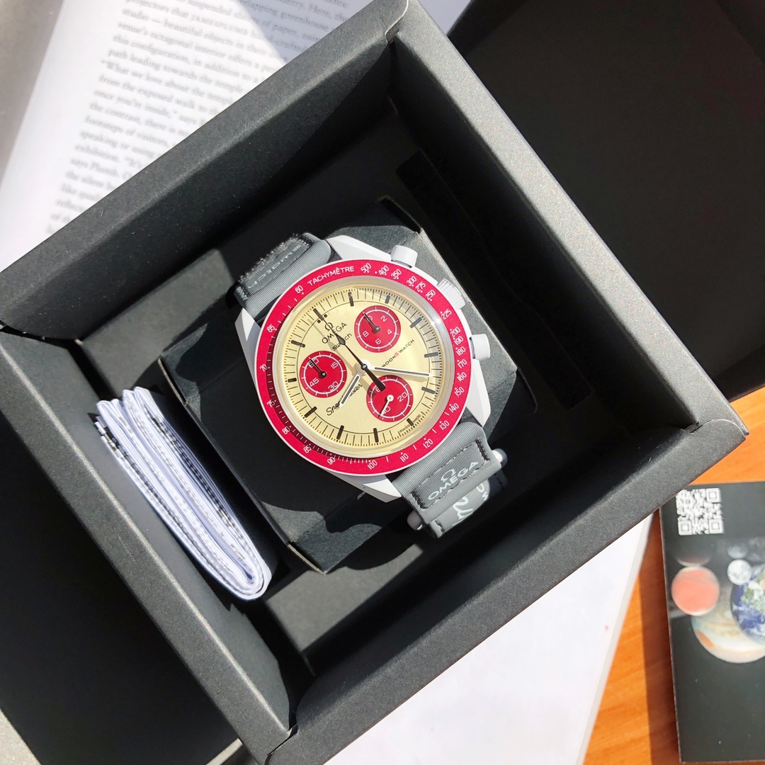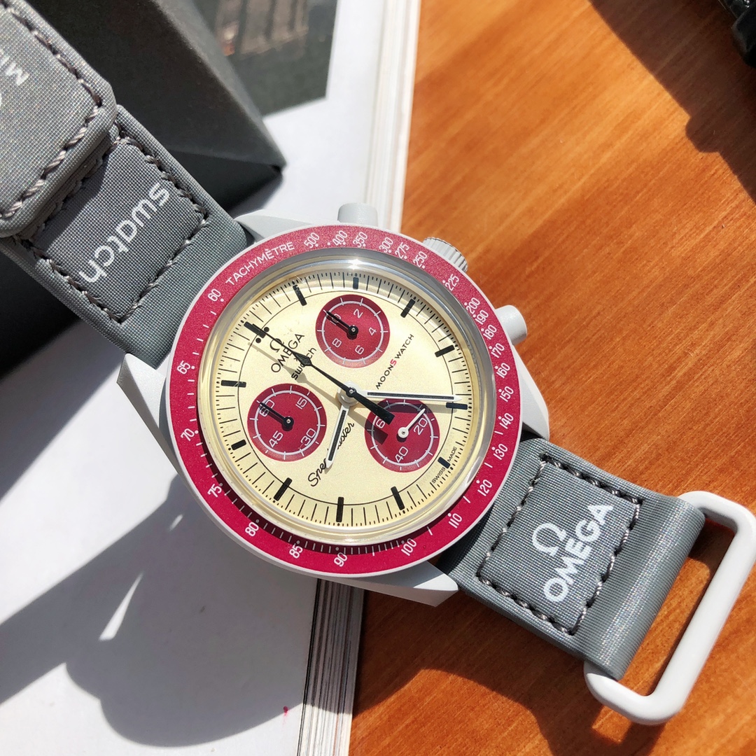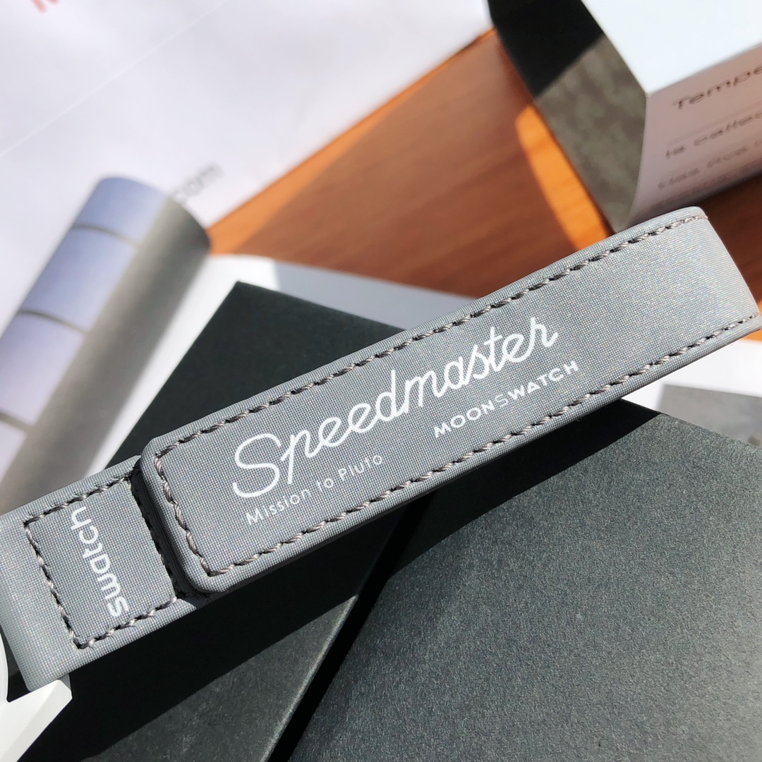 This watch features light cool grey tones paired with a dark grey VELCRO© strap. The chronograph seconds hand and subdial hands are black, while the counters and bezel background are in two burgundy tones. All dials display the OMEGA X SWATCH branding, iconic Speedmaster logo, and new MoonSwatch logo. The glass construction, hidden “S” integrated in the crystal, circular pattern on the dial and subdials, sharp lugs construction, “dot over 90” detail on the bezel, and unique Bioceramic touch are present in all models and showcase a passion for detail.