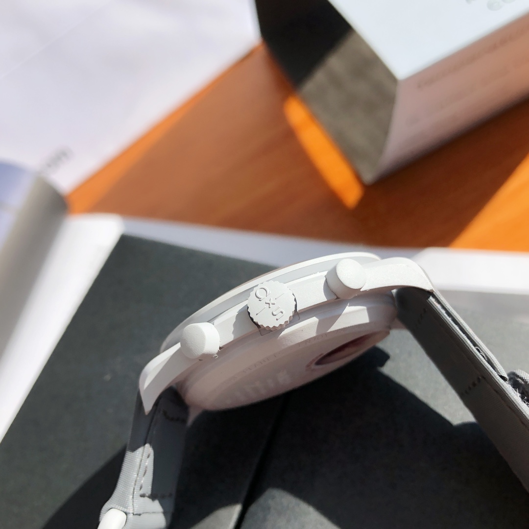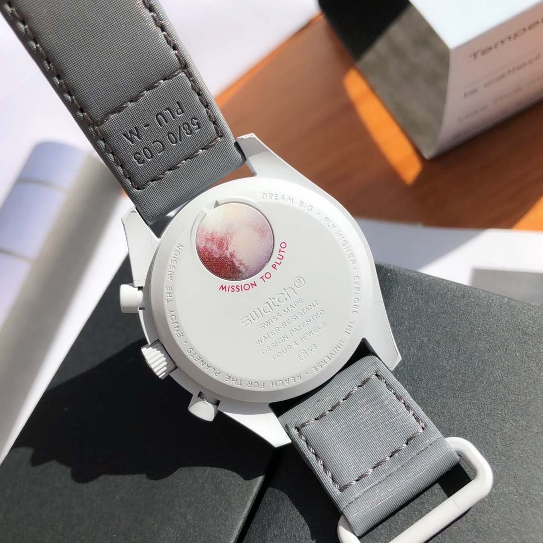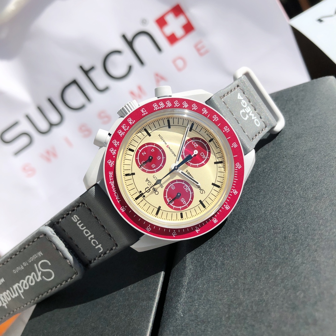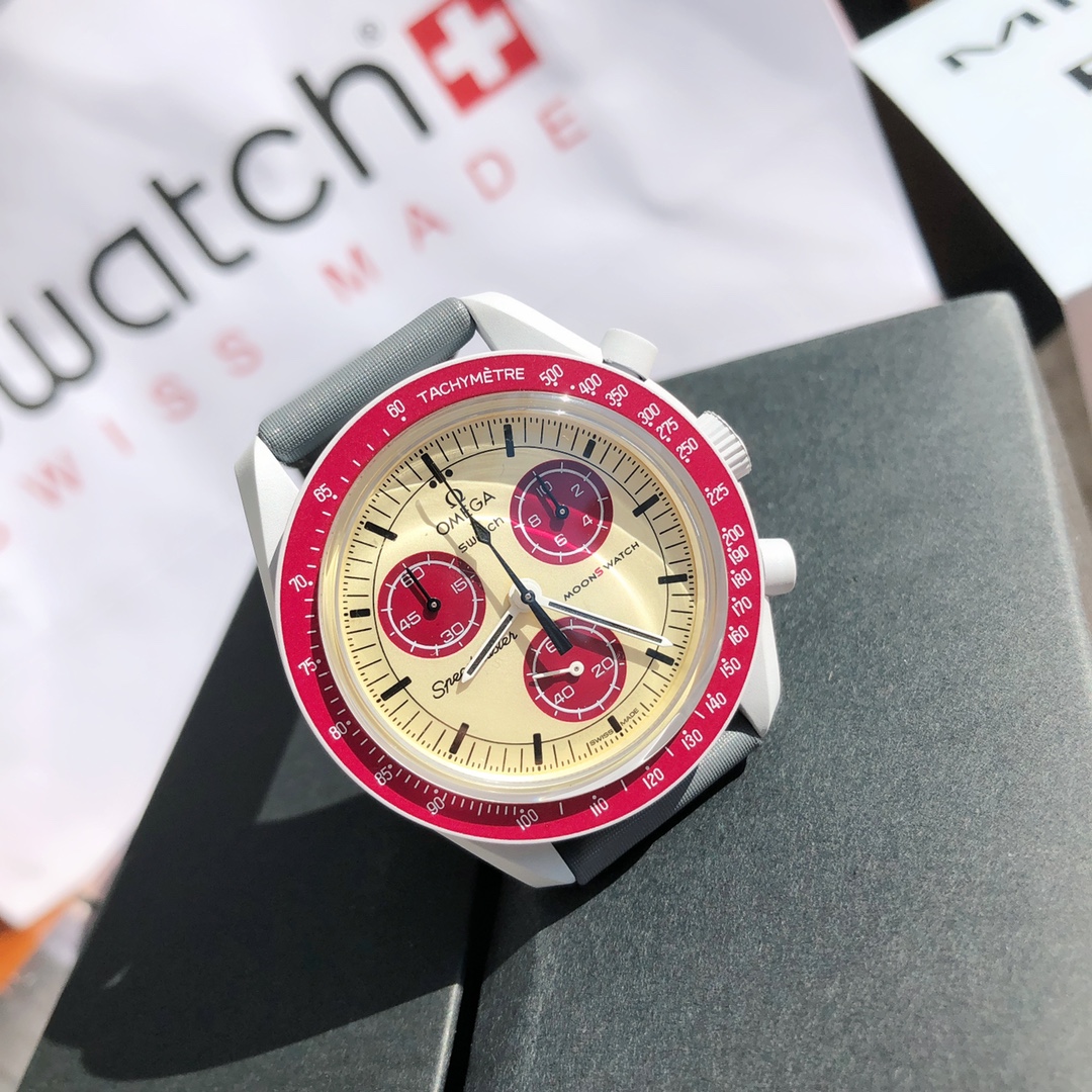 This watch features light cool grey tones paired with a dark grey VELCRO© strap. The chronograph seconds hand and subdial hands are black, while the counters and bezel background are in two burgundy tones. All dials display the OMEGA X SWATCH branding, iconic Speedmaster logo, and new MoonSwatch logo. The glass construction, hidden “S” integrated in the crystal, circular pattern on the dial and subdials, sharp lugs construction, “dot over 90” detail on the bezel, and unique Bioceramic touch are present in all models and showcase a passion for detail.