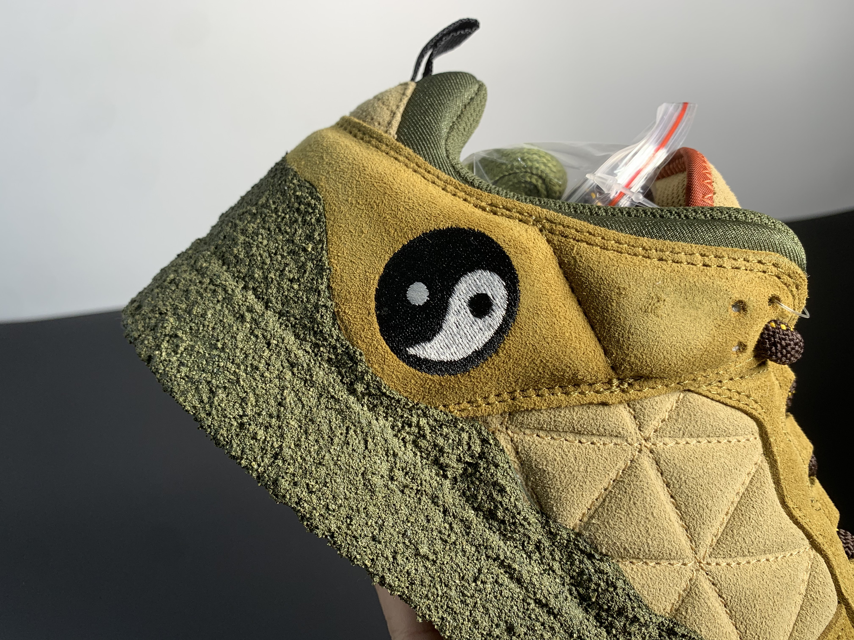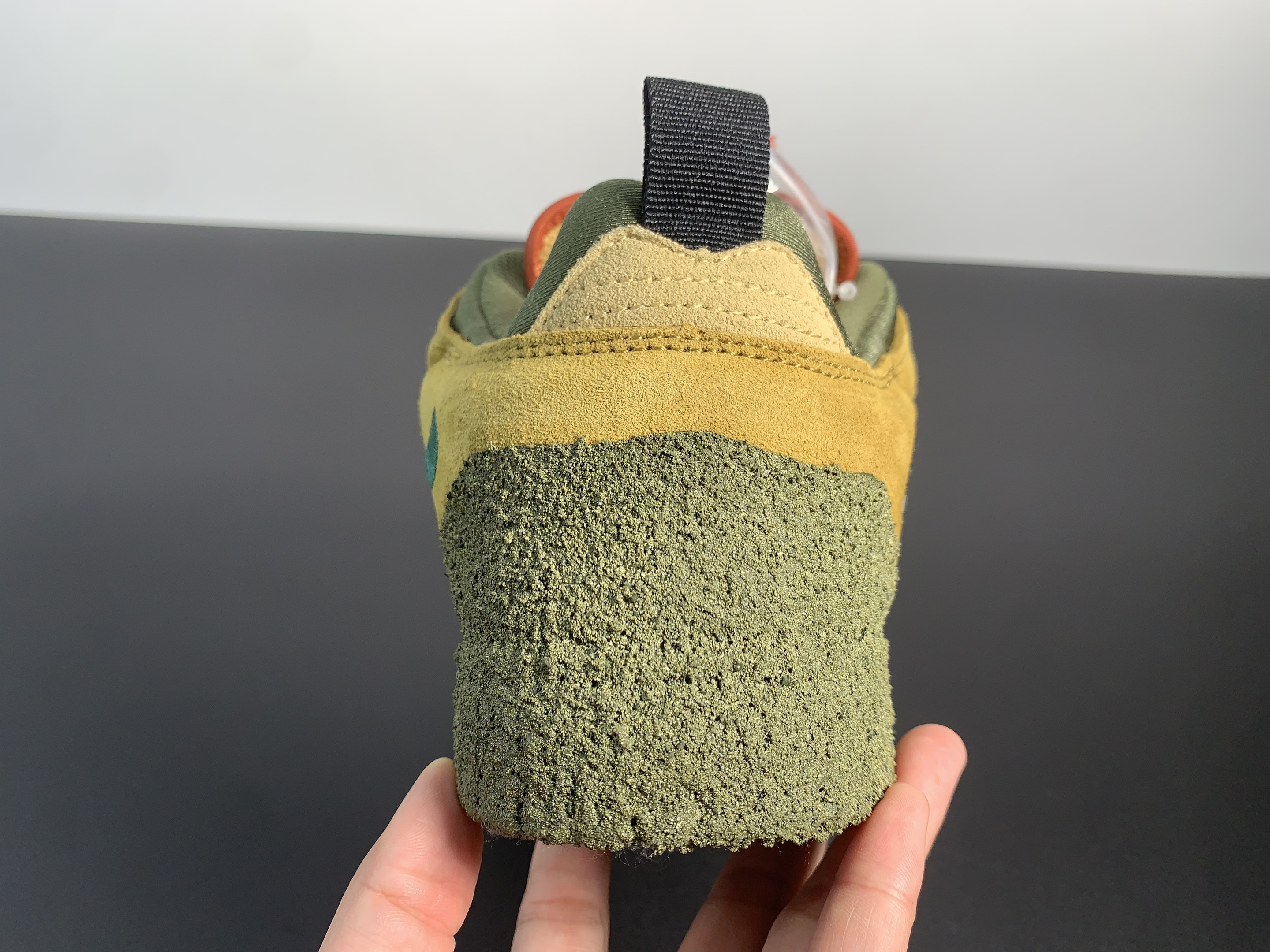 Midsole: The mossy green midsole extends up to the mudguard, offering a rugged, outdoorsy feel that complements the design's unique aesthetic.