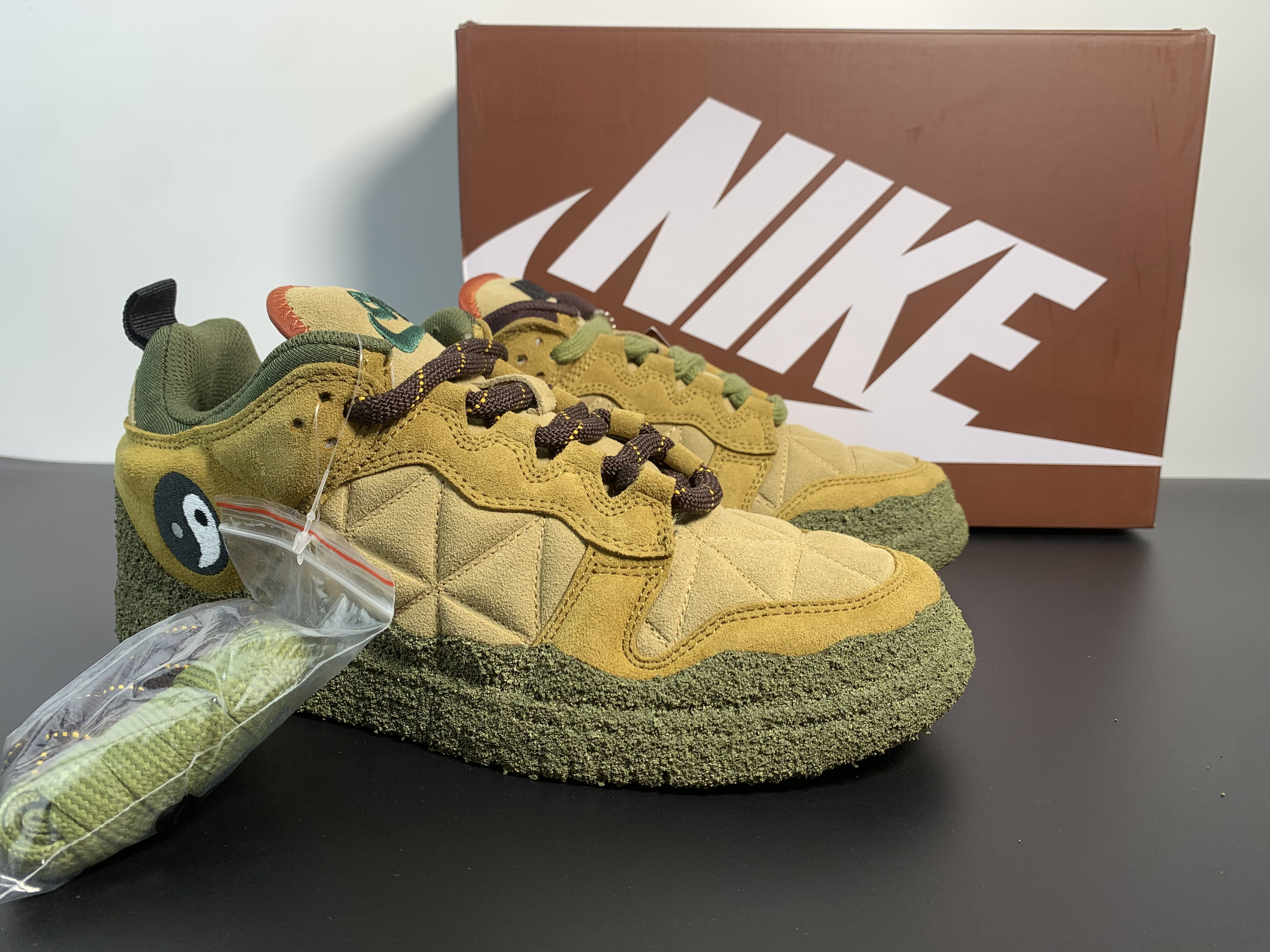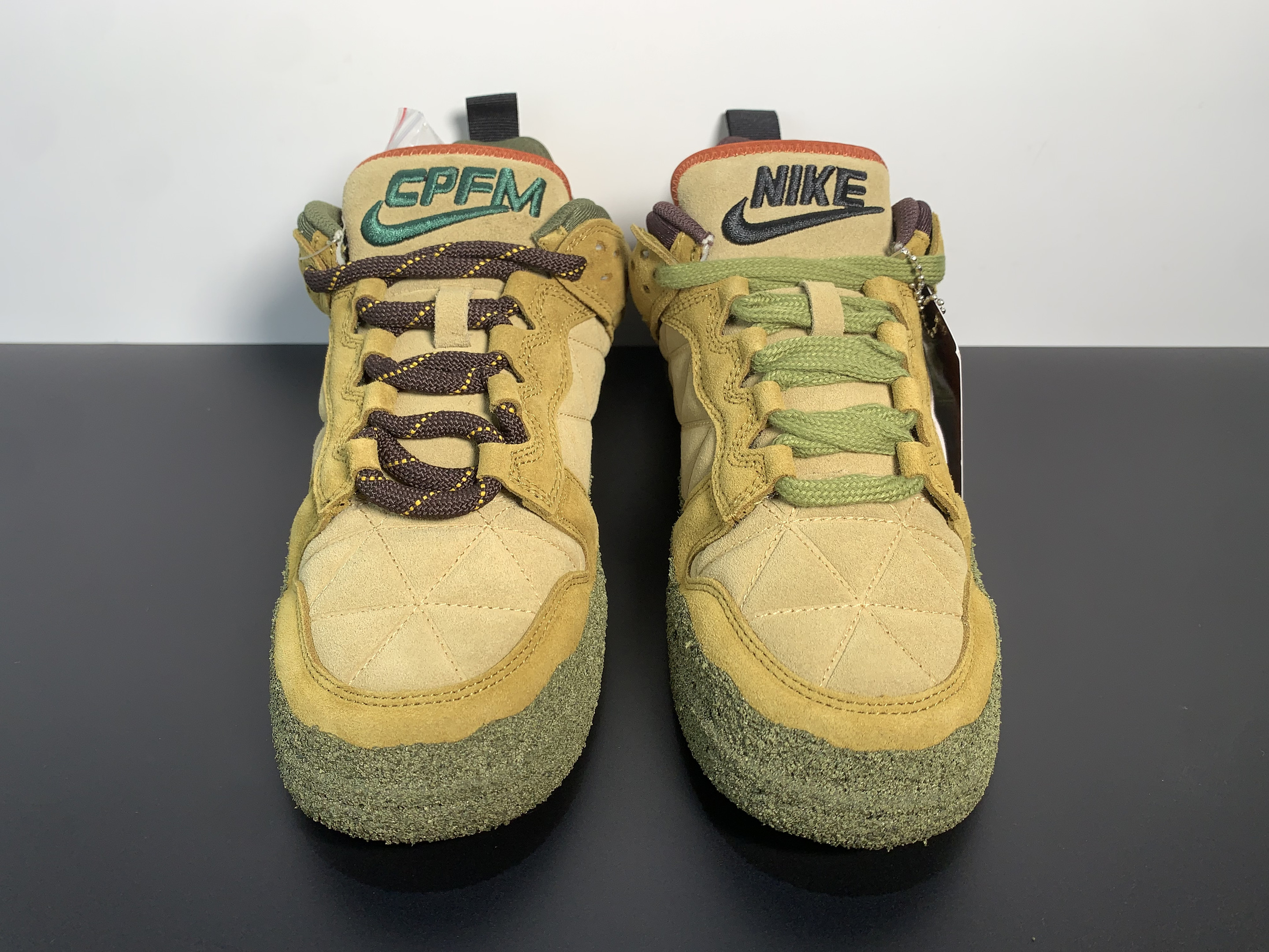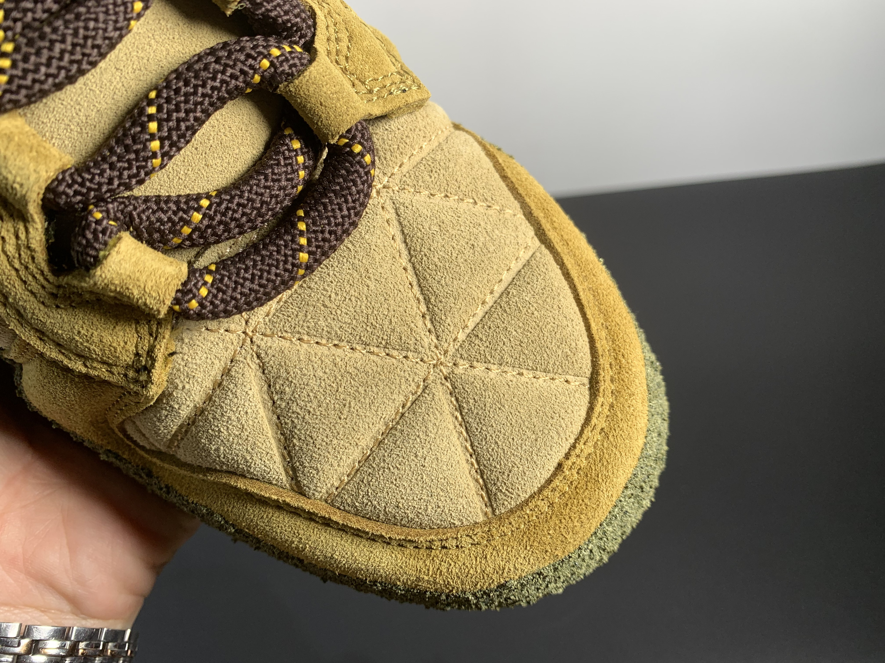 Upper: The upper is made from quilted suede in varying shades of tan, giving the sneaker a textured and layered look that’s both visually appealing and tactile.