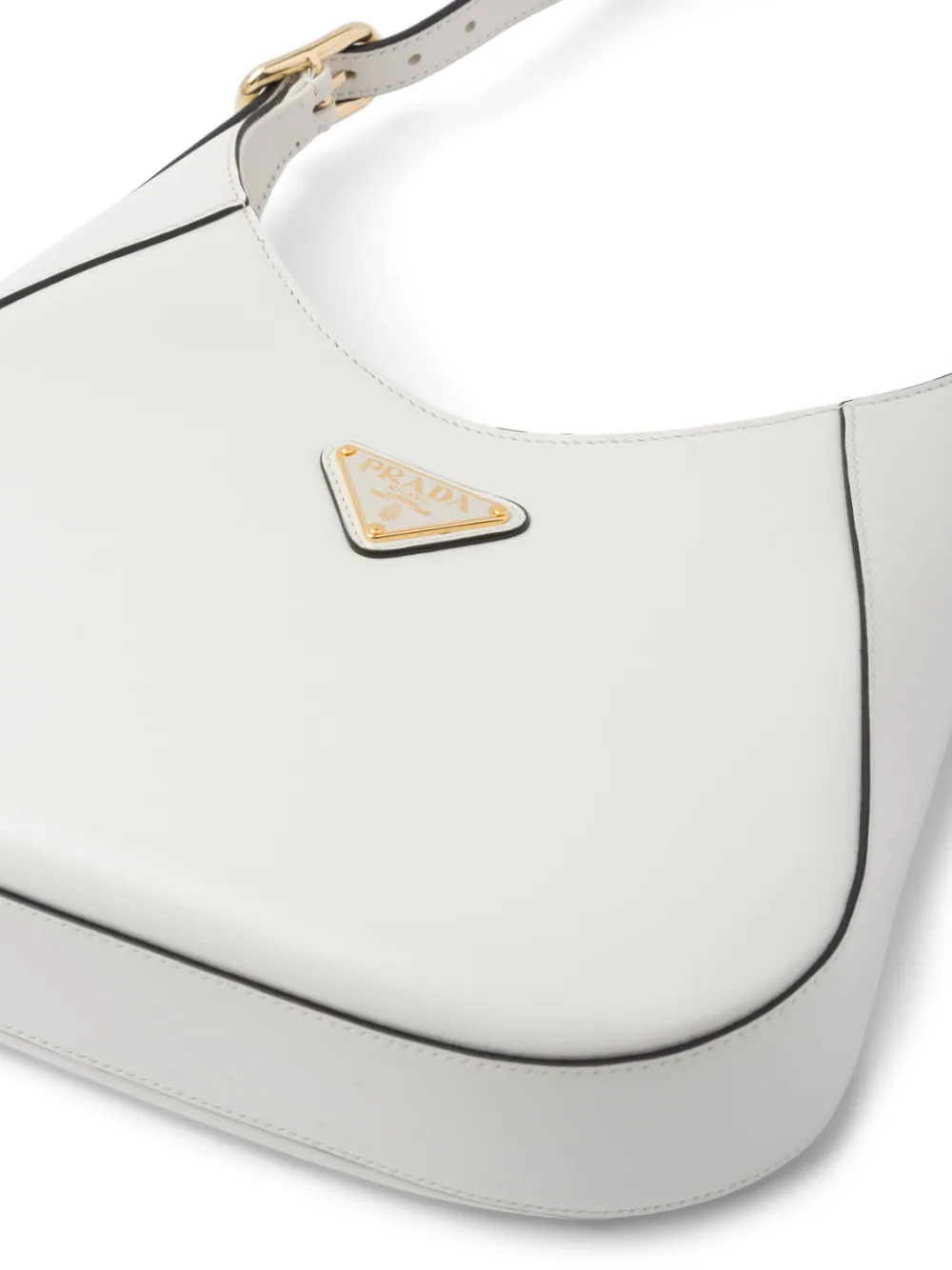 A bold and refined silhouette characterizes this leather shoulder bag with fine details. The geometric construction contrasts with soft lines to create a modern and elegant yet sporty bag, an expression of the hybrid concept and part of the Prada's aesthetic code.