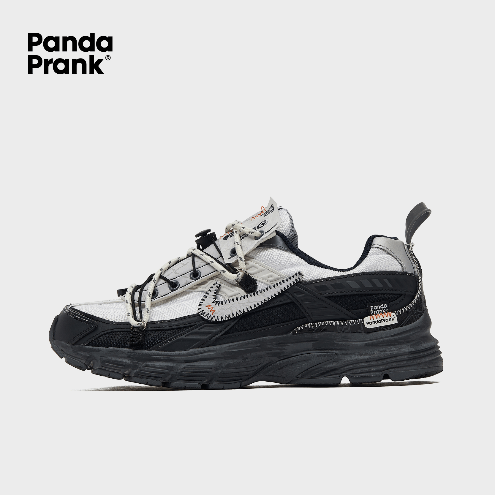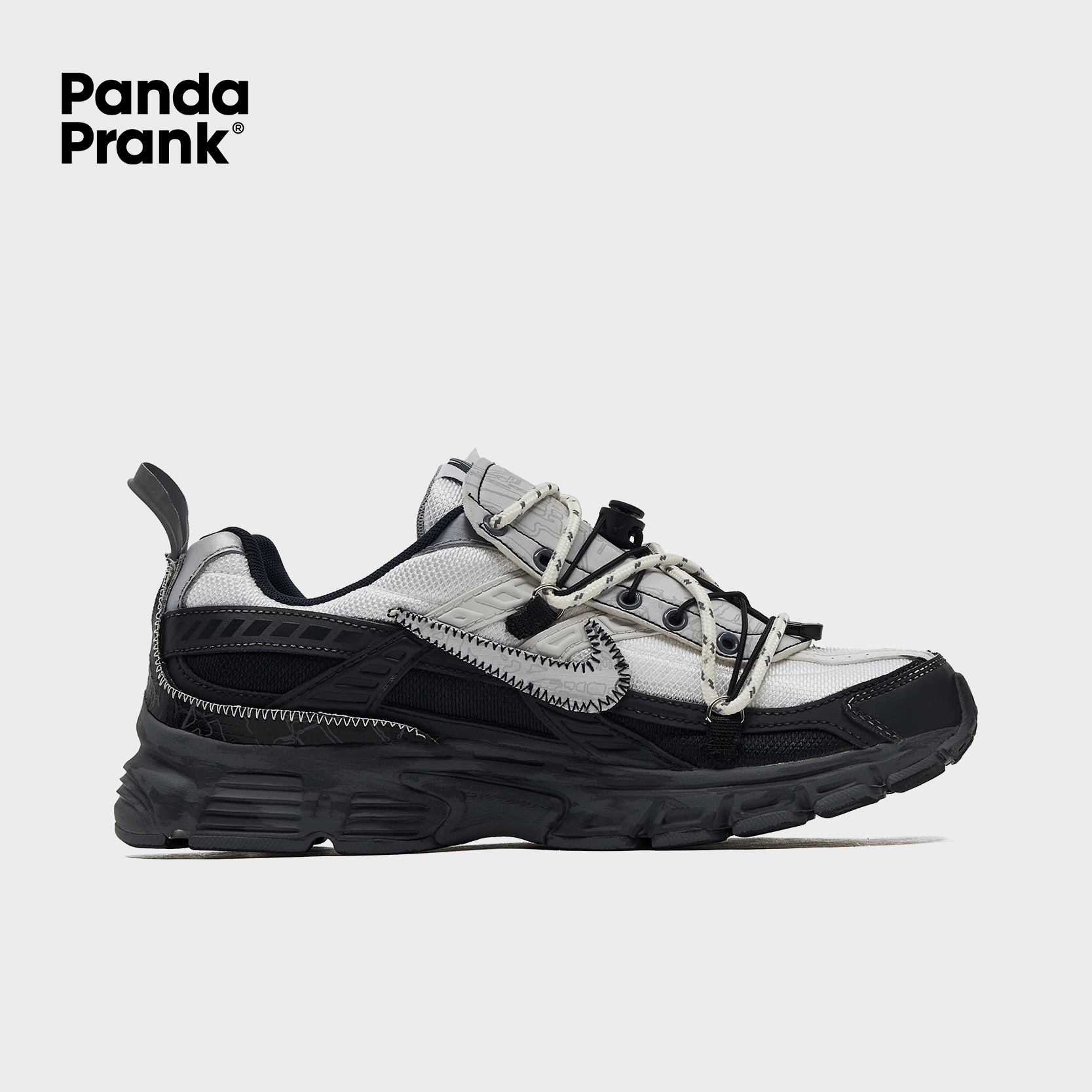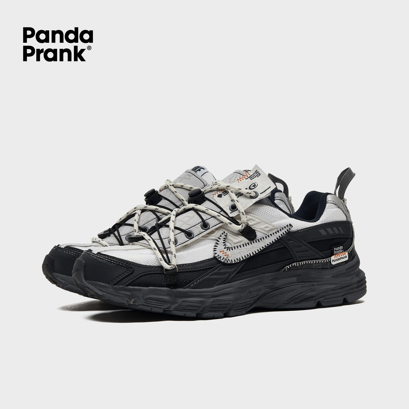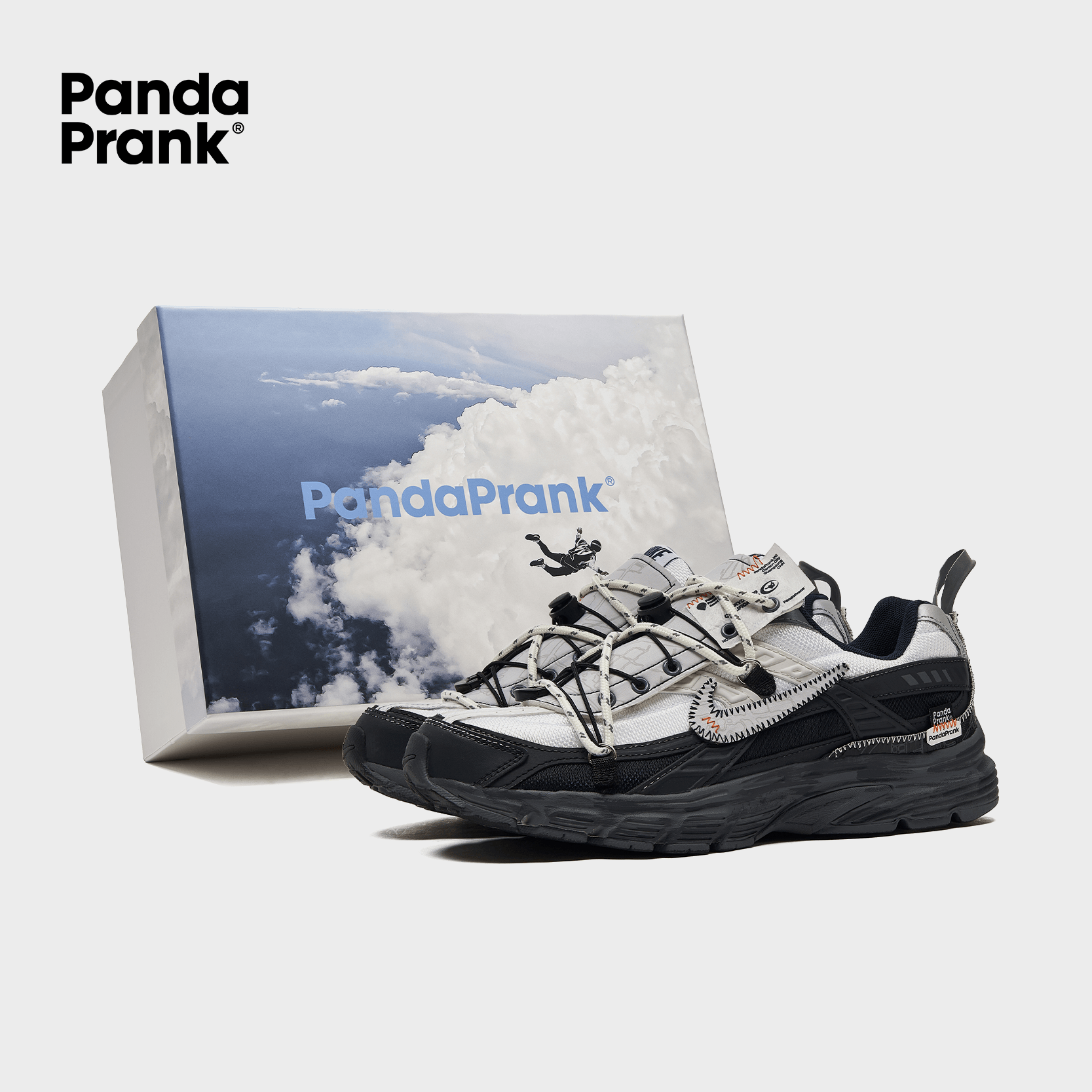 Using a classic black-and-white color scheme, these shoes features an innovative deconstructed design with a white upper and a black lower section. The tongue incorporates custom composite fabrics to enhance the deconstructed feel. Various functional materials, structures, and accessories are employed to capture the unique deconstructed aesthetics reminiscent of parachuting.