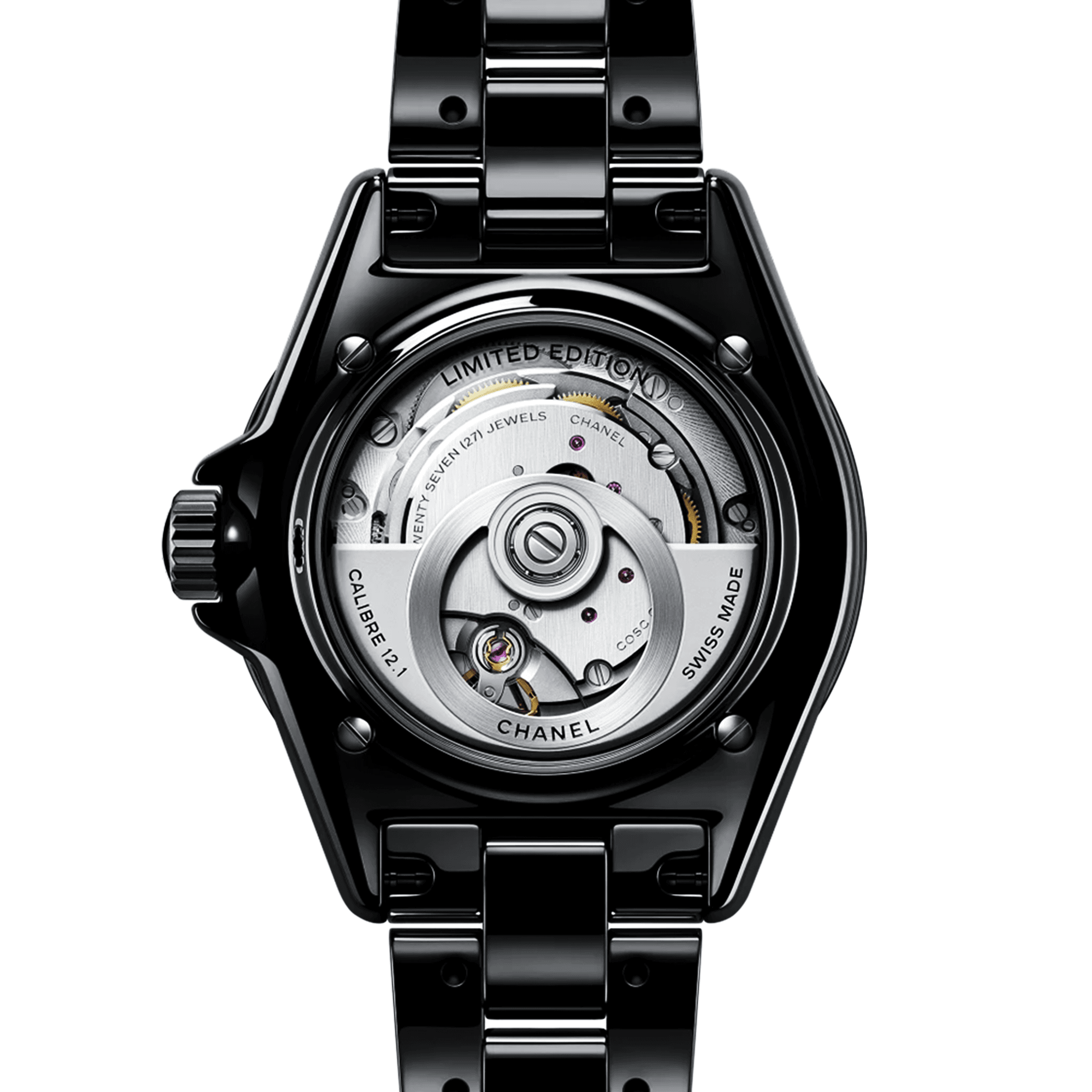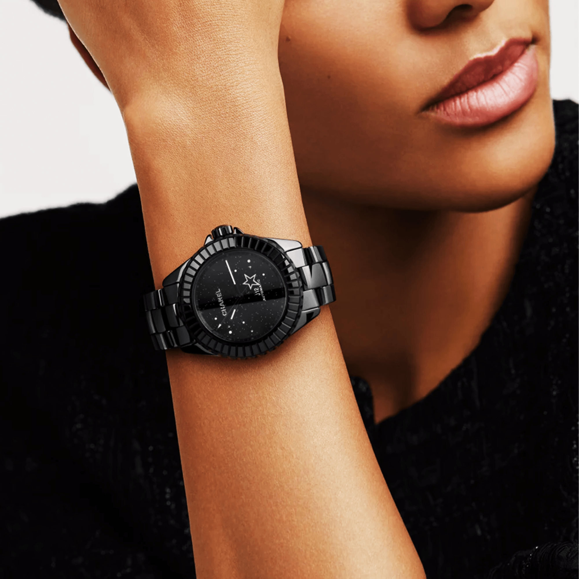 CHANELJ12 INTERSTELLAR 38mm Black Ceramic Automatic Bracelet Watch H7989. Black ceramic 38mm case & bezel with black-varnished sapphire crystal all on a black ceramic bracelet. This limited edition model has a black aventurine effect starry sky dial with blackened hands, 6 diamonds set across the dial. Exhibition caseback. Water resistant to 200m and sapphire crystal glass. Automatic movement.