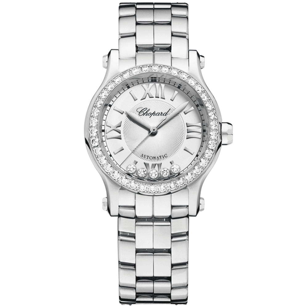 Showered in scintillating diamonds, this Happy Sport watch from Chopard exudes a timeless, luxurious look on the wrist. Its sporty-elegant look is courtesy of a sleek 30mm case crafted from polished stainless steel. The case is also integrated with 30-meter water resistance and topped with two sealed pieces of sapphire crystal glass. Inside these two pieces of glass are 5 single free-roaming diamonds. These Happy Diamonds are nestled inside a bezel setting and dance under the light, creating a breath-taking display of fire and brilliance. Underneath these diamonds is a silver sunburst dial with a stunning guilloche centre. Tradtional Roman numerals and stick markers represent each hour marker, while the central hands are carved into an elegant sword shape. At the heart of the lady’s Chopard Happy Sport watch is an automatic engine that is put on show through the back of the case. A sapphire crystal glass forms a transparent window on the rear of the watch, showcasing the movement and its impressive, peerless performance whilst in motion. The watch also secures to the lady’s wrist with a refined stainless steel bracelet and a folding clasp, making it an ideal companion for wearing with casual formal and elegant attire alike.