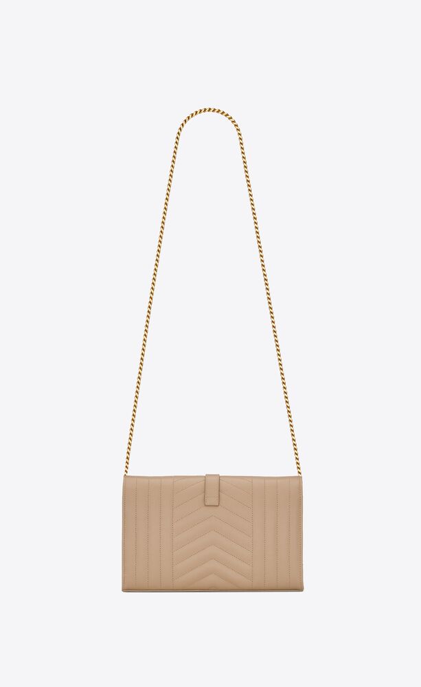 CHAIN WALLET WITH A FRONT FLAP MADE WITH METAL-FREE TANNED LEATHER, DECORATED WITH METAL YSL INITIALS AND A MIX OF VERTICAL, CHEVRON AND DIAMOND QUILTED OVERSTITCHING, FEATURING A DETACHABLE CHAIN STRAP.